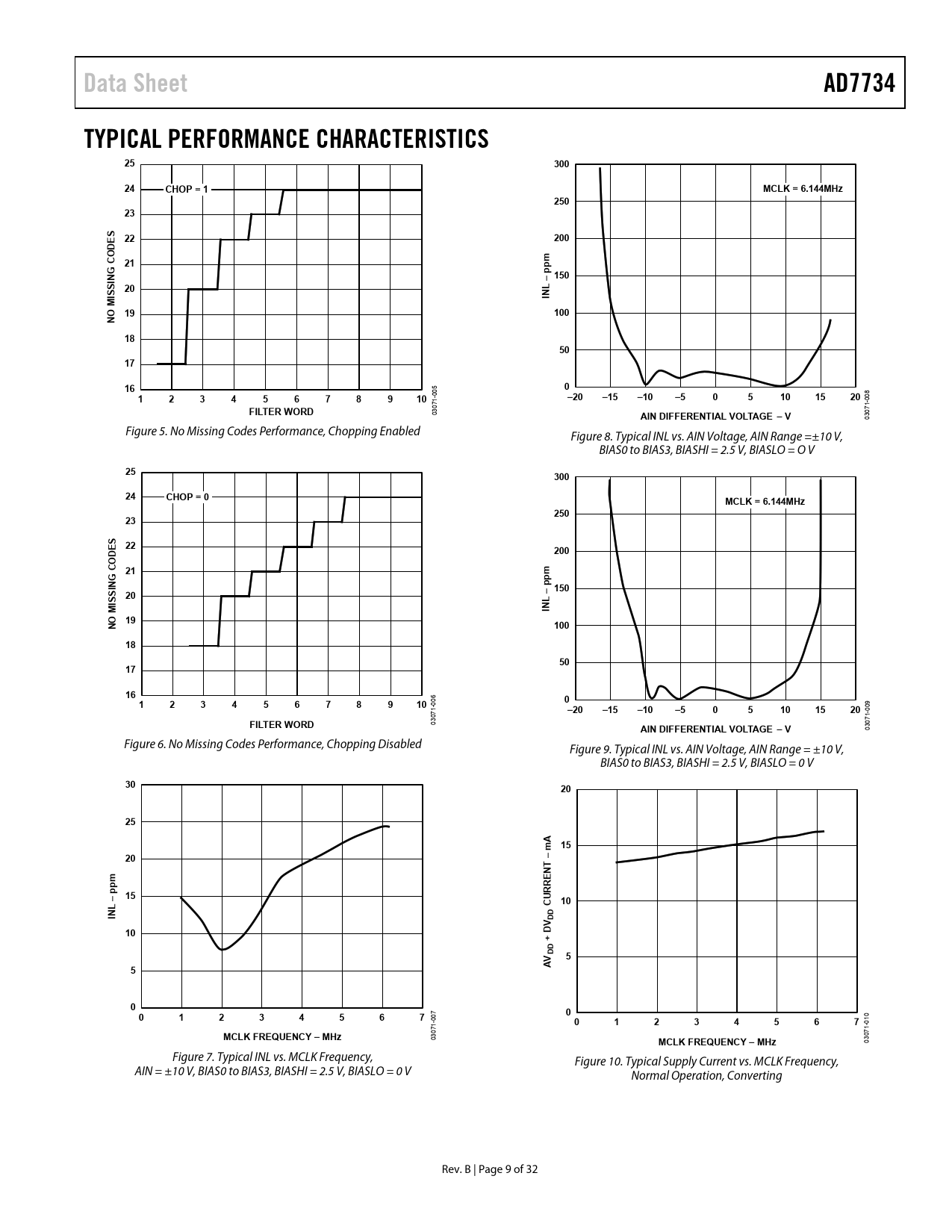 Data SheetAD7734TYPICAL PERFORMANCE CHARACTERISTICS2530024CHOP = 1MCLK = 6.144MHz25023ES 22200OD 21G C– ppm 150SIN 20LISINO M100N 19185017160 005 12345678910–20–15–10–505101520 008 FILTER WORD 03071- AIN DIFFERENTIAL VOLTAGE – V 03071- Figure 5. No Missing Codes Performance, Chopping Enabled Figure 8. Typical INL vs. AIN Voltage, AIN Range =±10 V, BIAS0 to BIAS3, BIASHI = 2.5 V, BIASLO = O V 2530024CHOP = 0MCLK = 6.144MHz25023ES 22200OD 21G CppmSIN15020–ISL INO M N 1910018501716 006 123456789100 009 –20–15–10–505101520 03071- FILTER WORD 03071- AIN DIFFERENTIAL VOLTAGE – V Figure 6. No Missing Codes Performance, Chopping Disabled Figure 9. Typical INL vs. AIN Voltage, AIN Range = ±10 V, BIAS0 to BIAS3, BIASHI = 2.5 V, BIASLO = 0 V 302025A 1520– m NT– ppm 15LCURRE 10INDD10DV +55AV DD0 012345670 007 010 01234567MCLK FREQUENCY – MHz 03071- 03071- MCLK FREQUENCY – MHz Figure 7. Typical INL vs. MCLK Frequency, Figure 10. Typical Supply Current vs. MCLK Frequency, AIN = ±10 V, BIAS0 to BIAS3, BIASHI = 2.5 V, BIASLO = 0 V Normal Operation, Converting Rev. B | Page 9 of 32 Document Outline FEATURES APPLICATIONS FUNCTIONAL BLOCK DIAGRAM GENERAL DESCRIPTION TABLE OF CONTENTS REVISION HISTORY SPECIFICATIONS TIMING SPECIFICATIONS Timing Diagrams ABSOLUTE MAXIMUM RATINGS ESD CAUTION TYPICAL PERFORMANCE CHARACTERISTICS OUTPUT NOISE AND RESOLUTION SPECIFICATION CHOPPING ENABLED CHOPPING DISABLED PIN CONFIGURATION AND FUNCTION DESCRIPTIONS REGISTER DESCRIPTION REGISTER ACCESS COMMUNICATIONS REGISTER I/O PORT REGISTER REVISION REGISTER TEST REGISTER ADC STATUS REGISTER CHECKSUM REGISTER ADC ZERO-SCALE CALIBRATION REGISTER ADC FULL-SCALE REGISTER CHANNEL DATA REGISTERS CHANNEL ZERO-SCALE CALIBRATION REGISTERS CHANNEL FULL-SCALE CALIBRATION REGISTERS CHANNEL STATUS REGISTERS CHANNEL SETUP REGISTERS CHANNEL CONVERSION TIME REGISTERS MODE REGISTER DIGITAL INTERFACE DESCRIPTION HARDWARE RESET ACCESS THE AD7734 REGISTERS SINGLE CONVERSION AND READING DATA DUMP MODE CONTINUOUS CONVERSION MODE CONTINUOUS READ (CONTINUOUS CONVERSION) MODE CIRCUIT DESCRIPTION ANALOG FRONT END ANALOG INPUT’S EXTENDED VOLTAGE RANGE CHOPPING MULTIPLEXER, CONVERSION, AND DATA OUTPUT TIMING Σ-Δ ADC FREQUENCY RESPONSE VOLTAGE REFERENCE INPUTS REFERENCE DETECT I/O PORT CALIBRATION ADC ZERO-SCALE SELF-CALIBRATION PER CHANNEL SYSTEM CALIBRATION OUTLINE DIMENSIONS ORDERING GUIDE