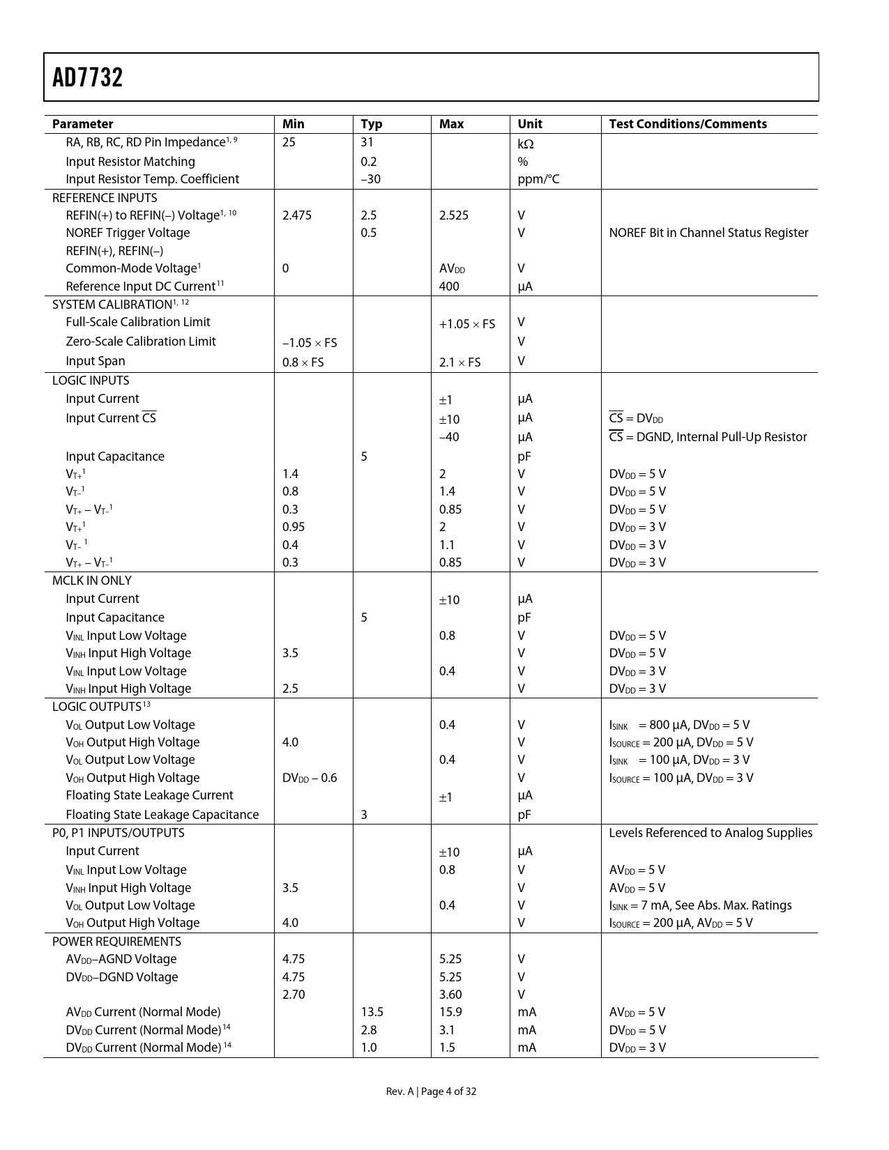 link to page 4 link to page 4 link to page 4 link to page 4 link to page 4 link to page 4 link to page 4 link to page 4 link to page 4 link to page 4 link to page 4 link to page 5 link to page 6 link to page 6 link to page 6 link to page 6 link to page 6 link to page 6 link to page 6 link to page 6 link to page 6 link to page 6 link to page 6 link to page 6 link to page 6 link to page 6 AD7732Parameter MinTypMaxUnitTestConditions/Comments RA, RB, RC, RD Pin Impedance1, 9 25 31 kΩ Input Resistor Matching 0.2 % Input Resistor Temp. Coefficient –30 ppm/°C REFERENCE INPUTS REFIN(+) to REFIN(–) Voltage1, 10 2.475 2.5 2.525 V NOREF Trigger Voltage 0.5 V NOREF Bit in Channel Status Register REFIN(+), REFIN(–) Common-Mode Voltage1 0 AVDD V Reference Input DC Current11 400 μA SYSTEM CALIBRATION1, 12 Full-Scale Calibration Limit +1.05 × FS V Zero-Scale Calibration Limit –1.05 × FS V Input Span 0.8 × FS 2.1 × FS V LOGIC INPUTS Input Current ±1 μA Input Current CS ±10 μA CS = DVDD –40 μA CS = DGND, Internal Pull-Up Resistor Input Capacitance 5 pF V 1 T+ 1.4 2 V DVDD = 5 V V 1 T– 0.8 1.4 V DVDD = 5 V V 1 T+ – VT– 0.3 0.85 V DVDD = 5 V V 1 T+ 0.95 2 V DVDD = 3 V VT– 1 0.4 1.1 V DVDD = 3 V V 1 T+ – VT– 0.3 0.85 V DVDD = 3 V MCLK IN ONLY Input Current ±10 μA Input Capacitance 5 pF VINL Input Low Voltage 0.8 V DVDD = 5 V VINH Input High Voltage 3.5 V DVDD = 5 V VINL Input Low Voltage 0.4 V DVDD = 3 V VINH Input High Voltage 2.5 V DVDD = 3 V LOGIC OUTPUTS13 VOL Output Low Voltage 0.4 V ISINK = 800 μA, DVDD = 5 V VOH Output High Voltage 4.0 V ISOURCE = 200 μA, DVDD = 5 V VOL Output Low Voltage 0.4 V ISINK = 100 μA, DVDD = 3 V VOH Output High Voltage DVDD – 0.6 V ISOURCE = 100 μA, DVDD = 3 V Floating State Leakage Current ±1 μA Floating State Leakage Capacitance 3 pF P0, P1 INPUTS/OUTPUTS Levels Referenced to Analog Supplies Input Current ±10 μA VINL Input Low Voltage 0.8 V AVDD = 5 V VINH Input High Voltage 3.5 V AVDD = 5 V VOL Output Low Voltage 0.4 V ISINK = 7 mA, See Abs. Max. Ratings VOH Output High Voltage 4.0 V ISOURCE = 200 μA, AVDD = 5 V POWER REQUIREMENTS AVDD–AGND Voltage 4.75 5.25 V DVDD–DGND Voltage 4.75 5.25 V 2.70 3.60 V AVDD Current (Normal Mode) 13.5 15.9 mA AVDD = 5 V DVDD Current (Normal Mode)14 2.8 3.1 mA DVDD = 5 V DVDD Current (Normal Mode) 14 1.0 1.5 mA DVDD = 3 V Rev. A | Page 4 of 32 Document Outline FEATURES APPLICATIONS GENERAL DESCRIPTION FUNCTIONAL BLOCK DIAGRAM REVISION HISTORY AD7732—SPECIFICATIONS Table 1. (–40°C to +105°C; AVDD = 5 V ± 5%; DVDD = 2.7 V to 3.6 V, or 5 V ± 5%; BIAS (all), REFIN(+) = 2.5 V; REFIN(–) = AGND; RA, RB, RC, RD open circuit; AIN Range = ±10 V; fMCLKIN = 6.144 MHz; unless otherwise noted.) TIMING SPECIFICATIONS Table 2. (AVDD = 5 V ± 5%; DVDD = 2.7 V to 3.6 V, or 5 V ± 5%; Input Logic 0 = 0 V; Logic 1 = DVDD; unless otherwise noted.) ABSOLUTE MAXIMUM RATINGS Table 3. TA = 25°C, unless otherwise noted. TYPICAL PERFORMANCE CHARACTERISTICS OUTPUT NOISE AND RESOLUTION SPECIFICATION Chopping Enabled Table 4. Typical Output RMS Noise in µV vs. Conversion Time and Input Range with Chopping Enabled Table 5. Typical Effective Resolution in Bits vs. Conversion Time and Input Range with Chopping Enabled Table 6. Typical Peak-to-Peak Resolution in Bits vs. Conversion Time and Input Range with Chopping Enabled Chopping Disabled Table 7. Typical Output RMS Noise in µV vs. Conversion Time and Input Range with Chopping Disabled Table 8. Typical Effective Resolution in Bits vs. Conversion Time and Input Range with Chopping Disabled Table 9. Typical Peak-to-Peak Resolution in Bits vs. Conversion Time and Input Range with Chopping Disabled PIN CONFIGURATIONS AND FUNCTIONAL DESCRIPTIONS Table 10. Pin Function Descriptions—28-Lead TSSOP REGISTER DESCRIPTION Table 11. Register Summary Table 12. Operational Mode Summary Table 13. Input Range Summary Register Access Communications Register Table 14. I/O Port Register Revision Register Test Register ADC Status Register Checksum Register ADC Zero-Scale Calibration Register ADC Full-Scale Register Channel Data Registers Channel Zero-Scale Calibration Registers Channel Full-Scale Calibration Registers Channel Status Registers Channel Setup Registers Table 15. Channel Conversion Time Registers Mode Register DIGITAL INTERFACE DESCRIPTION Hardware Reset Access the AD7732 Registers Single Conversion and Reading Data Dump Mode Continuous Conversion Mode Continuous Read (Continuous Conversion) Mode CIRCUIT DESCRIPTION Analog Front End Analog Input’s Extended Voltage Range Table 16. Extended Input Voltage Range, Nominal Voltage Range ±10 V, 16 Bits, CLAMP = 0 Table 17. Extended Input Voltage Range, Nominal Voltage Range 0 V to +10 V, 16 Bits, CLAMP = 0 Chopping Multiplexer, Conversion, and Data Output Timing Sigma-Delta ADC Frequency Response Voltage Reference Inputs Reference Detect I/O Port Calibration ADC Zero-Scale Self-Calibration Per Channel System Calibration High Common-Mode Voltage Application OUTLINE DIMENSIONS Ordering Guide