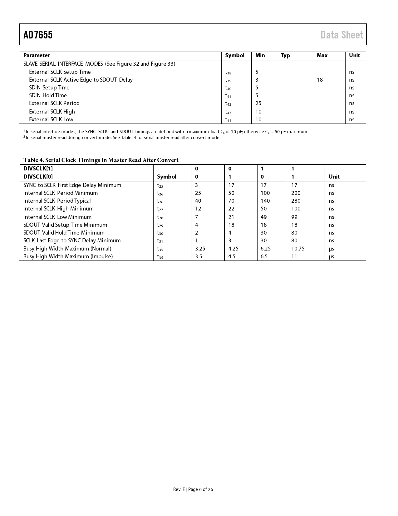 link to page 24 link to page 24 link to page 7 AD7655Data SheetParameterSymbolMinTypMaxUnit SLAVE SERIAL INTERFACE MODES (See Figure 32 and Figure 33) External SCLK Setup Time t38 5 ns External SCLK Active Edge to SDOUT Delay t39 3 18 ns SDIN Setup Time t40 5 ns SDIN Hold Time t41 5 ns External SCLK Period t42 25 ns External SCLK High t43 10 ns External SCLK Low t44 10 ns 1 In serial interface modes, the SYNC, SCLK, and SDOUT timings are defined with a maximum load CL of 10 pF; otherwise CL is 60 pF maximum. 2 In serial master read during convert mode. See Table 4 for serial master read after convert mode. Table 4. Serial Clock Timings in Master Read After Convert DIVSCLK[1]0011DIVSCLK[0]Symbol0101Unit SYNC to SCLK First Edge Delay Minimum t25 3 17 17 17 ns Internal SCLK Period Minimum t26 25 50 100 200 ns Internal SCLK Period Typical t26 40 70 140 280 ns Internal SCLK High Minimum t27 12 22 50 100 ns Internal SCLK Low Minimum t28 7 21 49 99 ns SDOUT Valid Setup Time Minimum t29 4 18 18 18 ns SDOUT Valid Hold Time Minimum t30 2 4 30 80 ns SCLK Last Edge to SYNC Delay Minimum t31 1 3 30 80 ns Busy High Width Maximum (Normal) t35 3.25 4.25 6.25 10.75 µs Busy High Width Maximum (Impulse) t35 3.5 4.5 6.5 11 µs Rev. E | Page 6 of 26 Document Outline FEATURES APPLICATIONS GENERAL DESCRIPTION FUNCTIONAL BLOCK DIAGRAM PRODUCT HIGHLIGHTS REVISION HISTORY SPECIFICATIONS TIMING SPECIFICATIONS ABSOLUTE MAXIMUM RATINGS ESD CAUTION PIN CONFIGURATIONS AND FUNCTION DESCRIPTIONS TERMINOLOGY TYPICAL PERFORMANCE CHARACTERISTICS APPLICATIONS INFORMATION CIRCUIT INFORMATION MODES OF OPERATION TRANSFER FUNCTIONS TYPICAL CONNECTION DIAGRAM ANALOG INPUTS INPUT CHANNEL MULTIPLEXER DRIVER AMPLIFIER CHOICE VOLTAGE REFERENCE INPUT POWER SUPPLY POWER DISSIPATION CONVERSION CONTROL DIGITAL INTERFACE PARALLEL INTERFACE Master Parallel Interface Slave Parallel Interface 8-Bit Interface (Master or Slave) Channel A/ Output SERIAL INTERFACE MASTER SERIAL INTERFACE Internal Clock SLAVE SERIAL INTERFACE External Clock External Discontinuous Clock Data Read After Convert External Clock Data Read (Previous) During Convert MICROPROCESSOR INTERFACING SPI INTERFACE (ADSP-2191M) APPLICATION HINTS LAYOUT EVALUATING THE AD7655 PERFORMANCE OUTLINE DIMENSIONS ORDERING GUIDE