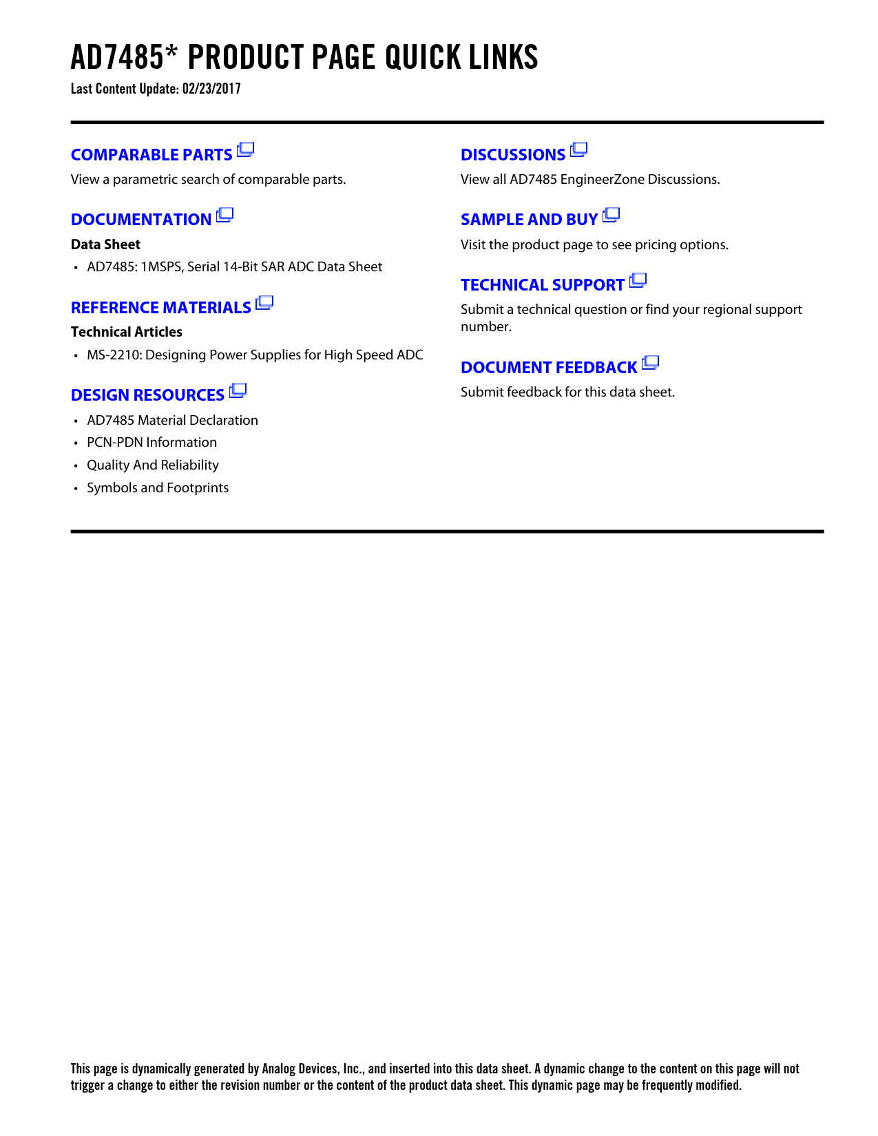 Visit the product page to see pricing options. • AD7485: 1MSPS, Serial 14-Bit SAR ADC Data Sheet