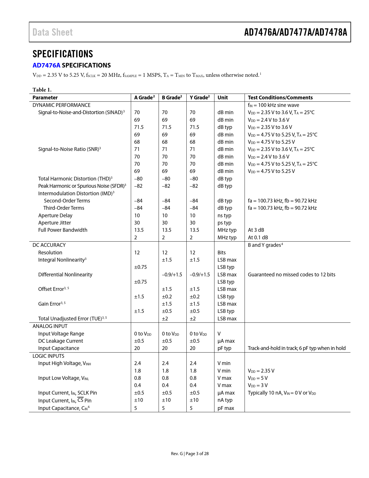 Páginas / Página28 / 3 — Data Sheet. AD7476A/AD7477A/AD7478A. SPECIFICATIONS AD7476A. …