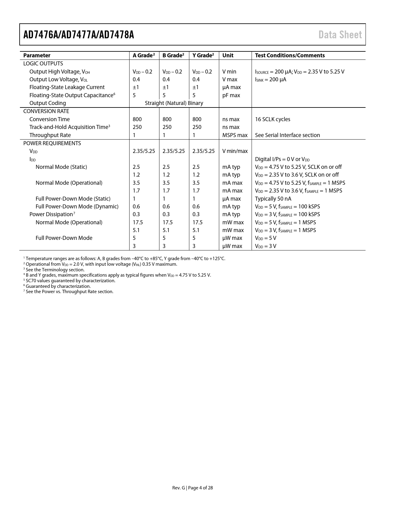 link to page 21 link to page 14 link to page 20 AD7476A/AD7477A/AD7478AData SheetParameterA Grade2 B Grade2 Y Grade2UnitTest Conditions/Comments LOGIC OUTPUTS Output High Voltage, VOH VDD – 0.2 VDD – 0.2 VDD – 0.2 V min ISOURCE = 200 μA; VDD = 2.35 V to 5.25 V Output Low Voltage, VOL 0.4 0.4 0.4 V max ISINK = 200 μA Floating-State Leakage Current ±1 ±1 ±1 μA max Floating-State Output Capacitance6 5 5 5 pF max Output Coding Straight (Natural) Binary CONVERSION RATE Conversion Time 800 800 800 ns max 16 SCLK cycles Track-and-Hold Acquisition Time3 250 250 250 ns max Throughput Rate 1 1 1 MSPS max See Serial Interface section POWER REQUIREMENTS VDD 2.35/5.25 2.35/5.25 2.35/5.25 V min/max IDD Digital I/Ps = 0 V or VDD Normal Mode (Static) 2.5 2.5 2.5 mA typ VDD = 4.75 V to 5.25 V, SCLK on or off 1.2 1.2 1.2 mA typ VDD = 2.35 V to 3.6 V, SCLK on or off Normal Mode (Operational) 3.5 3.5 3.5 mA max VDD = 4.75 V to 5.25 V, fSAMPLE = 1 MSPS 1.7 1.7 1.7 mA max VDD = 2.35 V to 3.6 V, fSAMPLE = 1 MSPS Full Power-Down Mode (Static) 1 1 1 μA max Typically 50 nA Full Power-Down Mode (Dynamic) 0.6 0.6 0.6 mA typ VDD = 5 V, fSAMPLE = 100 kSPS Power Dissipation7 0.3 0.3 0.3 mA typ VDD = 3 V, fSAMPLE = 100 kSPS Normal Mode (Operational) 17.5 17.5 17.5 mW max VDD = 5 V, fSAMPLE = 1 MSPS 5.1 5.1 5.1 mW max VDD = 3 V, fSAMPLE = 1 MSPS Full Power-Down Mode 5 5 5 μW max VDD = 5 V 3 3 3 μW max VDD = 3 V 1 Temperature ranges are as follows: A, B grades from –40°C to +85°C, Y grade from –40°C to +125°C. 2 Operational from VDD = 2.0 V, with input low voltage (VINL) 0.35 V maximum. 3 See the Terminology section. 4 B and Y grades, maximum specifications apply as typical figures when VDD = 4.75 V to 5.25 V. 5 SC70 values guaranteed by characterization. 6 Guaranteed by characterization. 7 See the Power vs. Throughput Rate section. Rev. G | Page 4 of 28 Document Outline FEATURES APPLICATIONS FUNCTIONAL BLOCK DIAGRAM GENERAL DESCRIPTION PRODUCT HIGHLIGHTS TABLE OF CONTENTS REVISION HISTORY SPECIFICATIONS AD7476A SPECIFICATIONS AD7477A SPECIFICATIONS AD7478A SPECIFICATIONS TIMING SPECIFICATIONS Timing Diagrams ABSOLUTE MAXIMUM RATINGS ESD CAUTION PIN CONFIGURATIONS AND FUNCTION DESCRIPTIONS TYPICAL PERFORMANCE CHARACTERISTICS TERMINOLOGY THEORY OF OPERATION CIRCUIT INFORMATION THE CONVERTER OPERATION ADC TRANSFER FUNCTION TYPICAL CONNECTION DIAGRAM ANALOG INPUT DIGITAL INPUTS MODES OF OPERATION NORMAL MODE POWER-DOWN MODE POWER-UP TIME POWER VS. THROUGHPUT RATE SERIAL INTERFACE AD7478A IN A 12 SCLK CYCLE SERIAL INTERFACE MICROPROCESSOR INTERFACING AD7476A/AD7477A/AD7478A TO ADSP-2181 INTERFACE AD7476A/AD7477A/AD7478A TO DSP563xx INTERFACE APPLICATION HINTS GROUNDING AND LAYOUT OUTLINE DIMENSIONS ORDERING GUIDE AUTOMOTIVE PRODUCTS