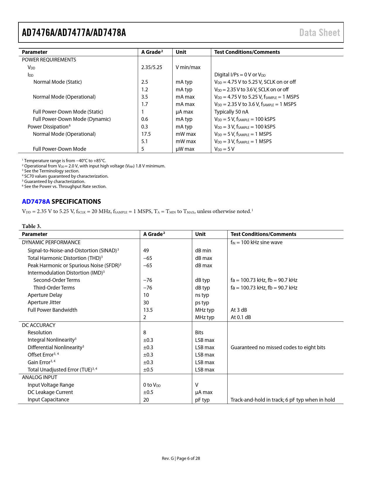 AD7476A/AD7477A/AD7478A. Data Sheet. Parameter. A Grade2. Unit. Test Conditions/Comments. AD7478A. SPECIFICATIONS. Table 3. Parameter