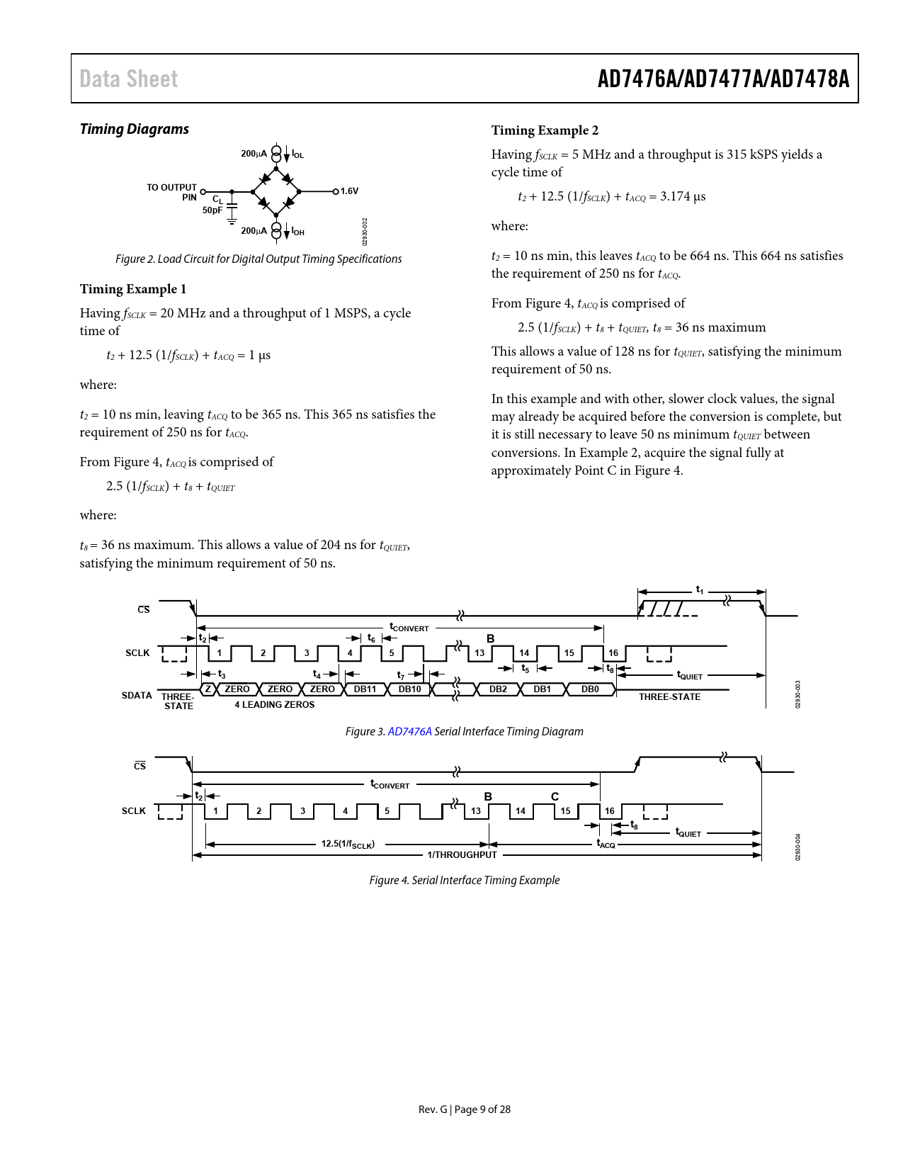 link to page 9 link to page 9 link to page 9 Data SheetAD7476A/AD7477A/AD7478ATiming DiagramsTiming Example 2200 µ AIOL Having fSCLK = 5 MHz and a throughput is 315 kSPS yields a cycle time of TO OUTPUT1.6VPINCL t2 + 12.5 (1/fSCLK) + tACQ = 3.174 µs 50pF200 µ AI where: OH 02930-002 Figure 2. Load Circuit for Digital Output Timing Specifications t2 = 10 ns min, this leaves tACQ to be 664 ns. This 664 ns satisfies the requirement of 250 ns for tACQ. Timing Example 1 From Figure 4, t Having f ACQ is comprised of SCLK = 20 MHz and a throughput of 1 MSPS, a cycle time of 2.5 (1/fSCLK) + t8 + tQUIET, t8 = 36 ns maximum t This allows a value of 128 ns for t 2 + 12.5 (1/fSCLK) + tACQ = 1 µs QUIET, satisfying the minimum requirement of 50 ns. where: In this example and with other, slower clock values, the signal t2 = 10 ns min, leaving tACQ to be 365 ns. This 365 ns satisfies the may already be acquired before the conversion is complete, but requirement of 250 ns for tACQ. it is still necessary to leave 50 ns minimum tQUIET between conversions. In Example 2, acquire the signal fully at From Figure 4, tACQ is comprised of approximately Point C in Figure 4. 2.5 (1/fSCLK) + t8 + tQUIET where: t8 = 36 ns maximum. This allows a value of 204 ns for tQUIET, satisfying the minimum requirement of 50 ns. t1CStCONVERTt2t6BSCLK1234513141516tt5t83t4t7tQUIETZZEROZEROZERODB11DB10DB2DB1DB0SDATA THREE-THREE-STATESTATE4 LEADING ZEROS 02930-003 Figure 3. AD7476A Serial Interface Timing Diagram CStCONVERTt2BCSCLK1234513141516t8tQUIET12.5(1/fSCLK)tACQ1/THROUGHPUT 02930-004 Figure 4. Serial Interface Timing Example Rev. G | Page 9 of 28 Document Outline FEATURES APPLICATIONS FUNCTIONAL BLOCK DIAGRAM GENERAL DESCRIPTION PRODUCT HIGHLIGHTS TABLE OF CONTENTS REVISION HISTORY SPECIFICATIONS AD7476A SPECIFICATIONS AD7477A SPECIFICATIONS AD7478A SPECIFICATIONS TIMING SPECIFICATIONS Timing Diagrams ABSOLUTE MAXIMUM RATINGS ESD CAUTION PIN CONFIGURATIONS AND FUNCTION DESCRIPTIONS TYPICAL PERFORMANCE CHARACTERISTICS TERMINOLOGY THEORY OF OPERATION CIRCUIT INFORMATION THE CONVERTER OPERATION ADC TRANSFER FUNCTION TYPICAL CONNECTION DIAGRAM ANALOG INPUT DIGITAL INPUTS MODES OF OPERATION NORMAL MODE POWER-DOWN MODE POWER-UP TIME POWER VS. THROUGHPUT RATE SERIAL INTERFACE AD7478A IN A 12 SCLK CYCLE SERIAL INTERFACE MICROPROCESSOR INTERFACING AD7476A/AD7477A/AD7478A TO ADSP-2181 INTERFACE AD7476A/AD7477A/AD7478A TO DSP563xx INTERFACE APPLICATION HINTS GROUNDING AND LAYOUT OUTLINE DIMENSIONS ORDERING GUIDE AUTOMOTIVE PRODUCTS