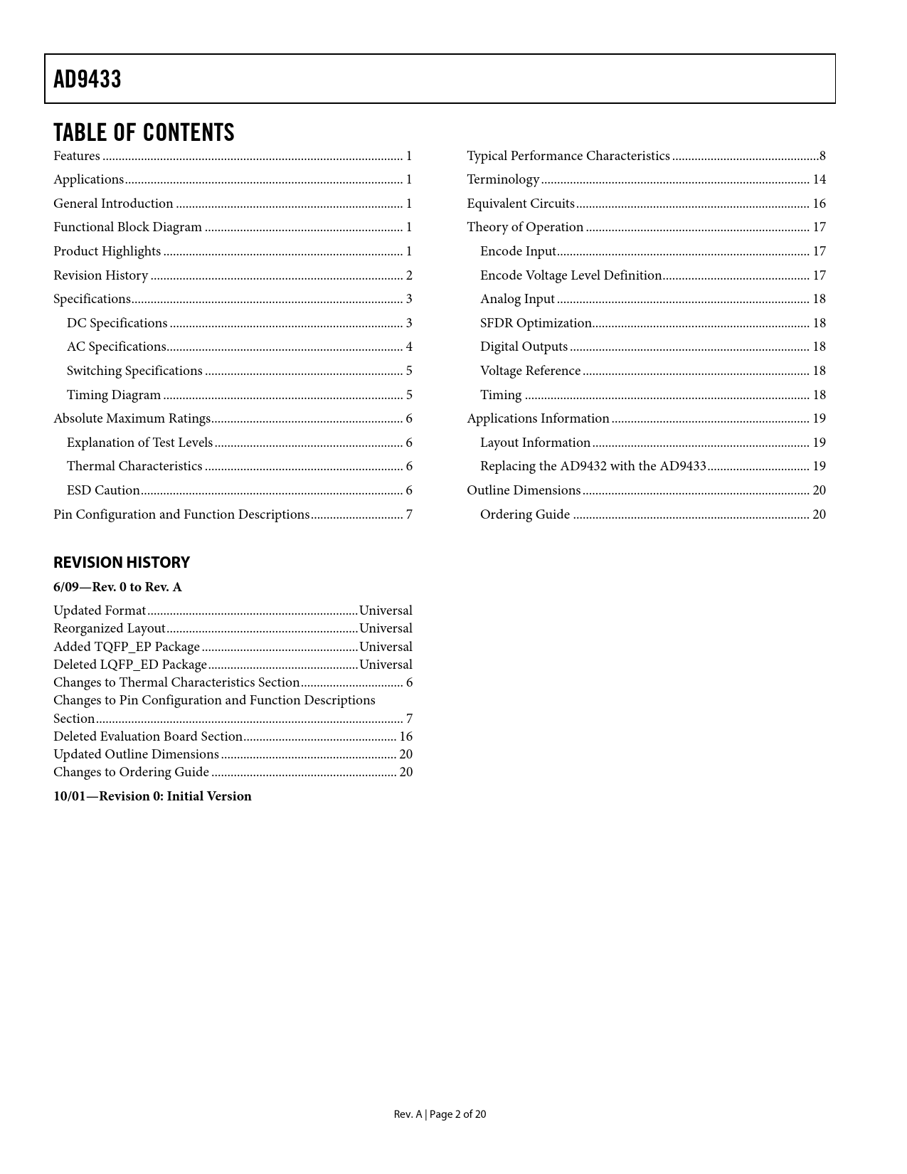 link to page 1 link to page 1 link to page 1 link to page 1 link to page 1 link to page 3 link to page 4 link to page 4 link to page 5 link to page 6 link to page 6 link to page 7 link to page 7 link to page 7 link to page 7 link to page 8 link to page 9 link to page 15 link to page 17 link to page 18 link to page 18 link to page 18 link to page 19 link to page 19 link to page 20 link to page 20 link to page 20 link to page 21 link to page 21 link to page 19 link to page 19 link to page 19 AD9433TABLE OF CONTENTS Features .. 1 Typical Performance Characteristics ..8 Applications ... 1 Terminology .. 14 General Introduction ... 1 Equivalent Circuits ... 16 Functional Block Diagram .. 1 Theory of Operation .. 17 Product Highlights ... 1 Encode Input ... 17 Revision History ... 2 Encode Voltage Level Definition .. 17 Specifications ... 3 Analog Input ... 18 DC Specifications ... 3 SFDR Optimization.. 18 AC Specifications .. 4 Digital Outputs ... 18 Switching Specifications .. 5 Voltage Reference ... 18 Timing Diagram ... 5 Timing ... 18 Absolute Maximum Ratings .. 6 Applications Information .. 19 Explanation of Test Levels ... 6 Layout Information .. 19 Thermal Characteristics .. 6 Replacing the AD9432 with the AD9433 .. 19 ESD Caution .. 6 Outline Dimensions ... 20 Pin Configuration and Function Descriptions ... 7 Ordering Guide .. 20 REVISION HISTORY6/09—Rev. 0 to Rev. A Updated Format .. Universal Reorganized Layout .. Universal Added TQFP_EP Package ... Universal Deleted LQFP_ED Package ... Universal Changes to Thermal Characteristics Section .. 6 Changes to Pin Configuration and Function Descriptions Section .. 7 Deleted Evaluation Board Section .. 16 Updated Outline Dimensions ... 20 Changes to Ordering Guide .. 20 10/01—Revision 0: Initial Version Rev. A | Page 2 of 20 Document Outline FEATURES APPLICATIONS GENERAL INTRODUCTION FUNCTIONAL BLOCK DIAGRAM PRODUCT HIGHLIGHTS TABLE OF CONTENTS REVISION HISTORY SPECIFICATIONS DC SPECIFICATIONS AC SPECIFICATIONS SWITCHING SPECIFICATIONS TIMING DIAGRAM ABSOLUTE MAXIMUM RATINGS EXPLANATION OF TEST LEVELS THERMAL CHARACTERISTICS ESD CAUTION PIN CONFIGURATION AND FUNCTION DESCRIPTIONS TYPICAL PERFORMANCE CHARACTERISTICS TERMINOLOGY EQUIVALENT CIRCUITS THEORY OF OPERATION ENCODE INPUT ENCODE VOLTAGE LEVEL DEFINITION ANALOG INPUT SFDR OPTIMIZATION DIGITAL OUTPUTS VOLTAGE REFERENCE TIMING APPLICATIONS INFORMATION LAYOUT INFORMATION REPLACING THE AD9432 WITH THE AD9433 OUTLINE DIMENSIONS ORDERING GUIDE