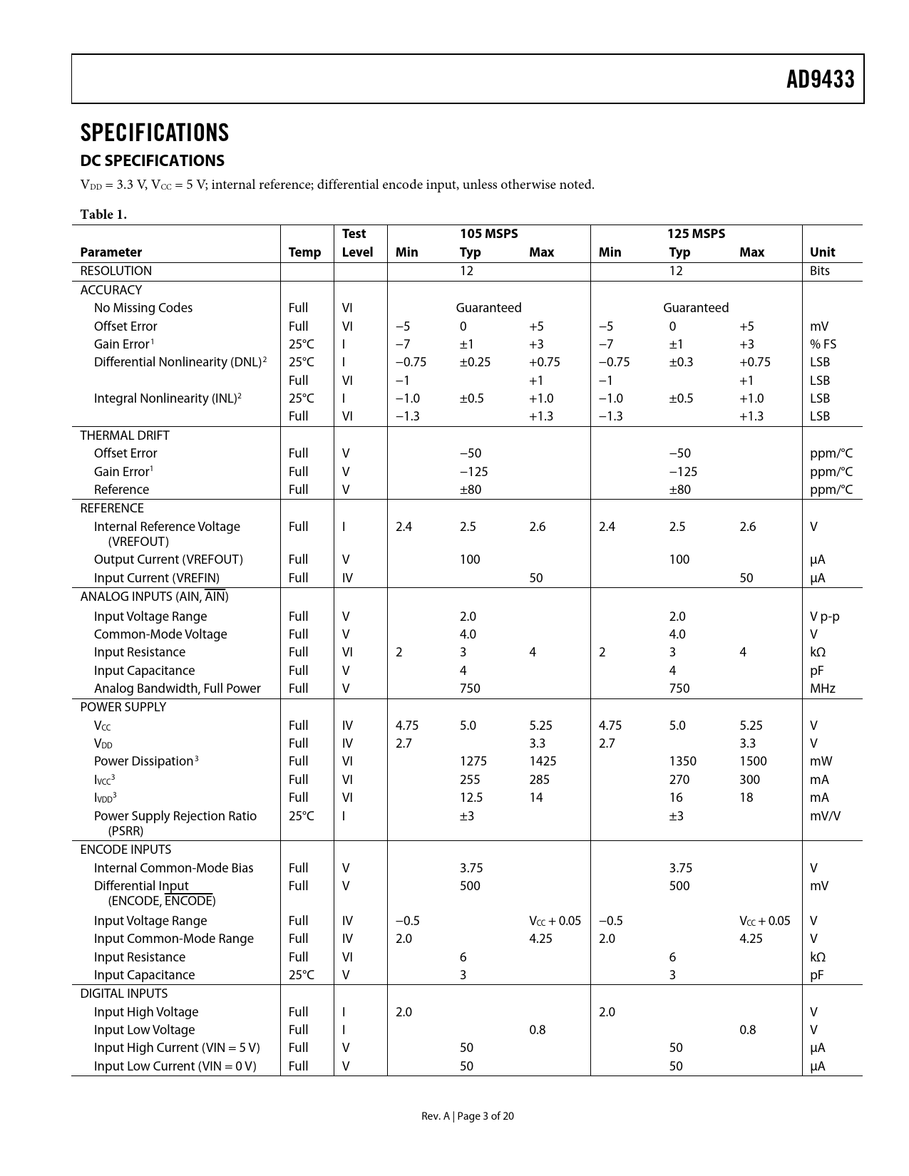 AD9433 SPECIFICATIONS DC SPECIFICATIONS Table 1 Test 105 MSPS 125 MSPS Parameter Temp Level Min Typ Max Unit