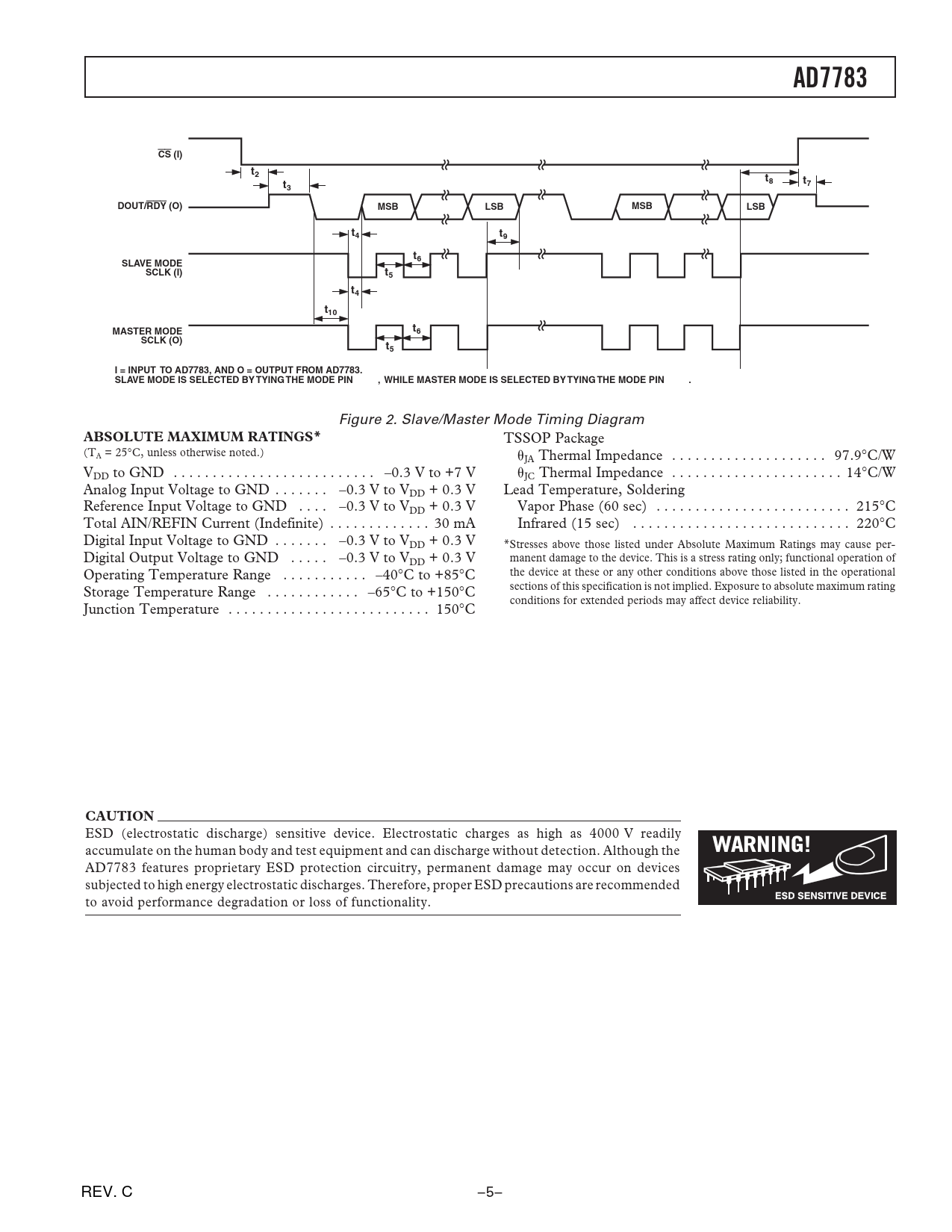 AD7783CS (I)t2tt8t73DOUT/RDY (O)MSBLSBMSBLSBt4t9t6SLAVE MODESCLK (I)t5t4t10MASTER MODEt6SCLK (O)t5I = INPUT TO AD7783, AND O = OUTPUT FROM AD7783. SLAVE MODE IS SELECTED BY TYING THE MODE PIN +,*+, WHILE MASTER MODE IS SELECTED BY TYING THE MODE PIN /2:. Figure 2. Slave/Master Mode Timing Diagram ABSOLUTE MAXIMUM RATINGS* TSSOP Package (TA = 25∞C, unless otherwise noted.) JA Thermal Impedance . 97.9∞C/W VDD to GND . –0.3 V to +7 V JC Thermal Impedance . 14∞C/W Analog Input Voltage to GND . –0.3 V to VDD + 0.3 V Lead Temperature, Soldering Reference Input Voltage to GND . –0.3 V to VDD + 0.3 V Vapor Phase (60 sec) . 215∞C Total AIN/REFIN Current (Indefinite) . 30 mA Infrared (15 sec) . 220∞C Digital Input Voltage to GND . –0.3 V to VDD + 0.3 V *Stresses above those listed under Absolute Maximum Ratings may cause per- Digital Output Voltage to GND . –0.3 V to VDD + 0.3 V manent damage to the device. This is a stress rating only; functional operation of Operating Temperature Range . –40∞C to +85∞C the device at these or any other conditions above those listed in the operational Storage Temperature Range . –65∞C to +150∞C sections of this specification is not implied. Exposure to absolute maximum rating conditions for extended periods may affect device reliability. Junction Temperature . 150∞C CAUTION ESD (electrostatic discharge) sensitive device. Electrostatic charges as high as 4000 V readily accumulate on the human body and test equipment and can discharge without detection. Although the AD7783 features proprietary ESD protection circuitry, permanent damage may occur on devices subjected to high energy electrostatic discharges. Therefore, proper ESD precautions are recommended to avoid performance degradation or loss of functionality. REV. C –5– Document Outline FEATURES INTERFACE POWER ON-CHIP FUNCTIONS APPLICATIONS FUNCTIONAL BLOCK DIAGRAM BASIC CONNECTION DIAGRAM GENERAL DESCRIPTION SPECIFICATIONS TIMING CHARACTERISTICS ABSOLUTE MAXIMUM RATINGS ORDERING GUIDE PIN CONFIGURATION PIN FUNCTION DESCRIPTIONS Typical Performance Characteristics ADC CIRCUIT INFORMATION Overview NOISE PERFORMANCE DIGITAL INTERFACE MASTER MODE (MODE = 0) SLAVE MODE (MODE = 1) CIRCUIT DESCRIPTION Analog Input Channel Programmable Gain Amplifier Bipolar Configuration/Output Coding Excitation Currents Crystal Oscillator Reference Input Grounding and Layout OUTLINE DIMENSIONS Revision History