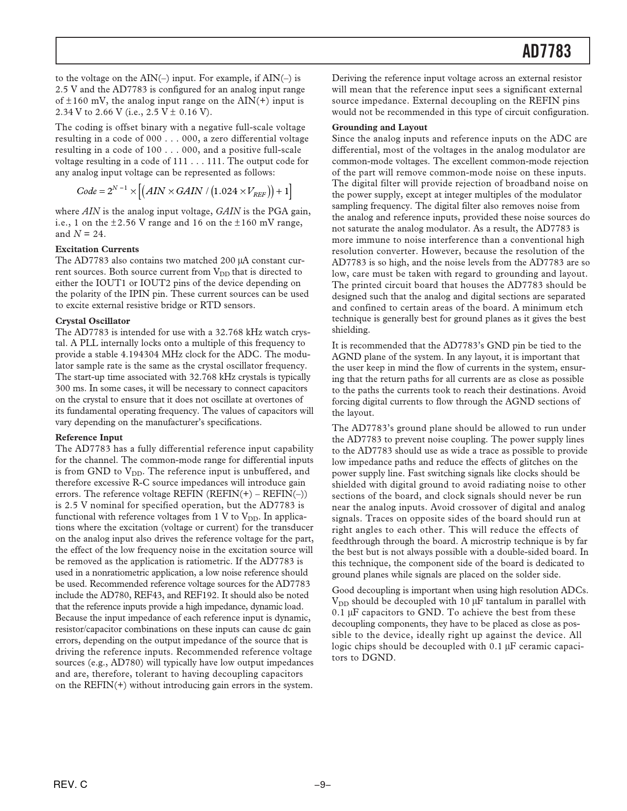 resulting in a code of 000 . 000, a zero differential voltage Since the analog inputs and reference inputs on the ADC are resulting in a code of 100 . 000, and a positive full-scale differential, most of the voltages in the analog modulator are voltage resulting in a code of 111 . 111. The output code for common-mode voltages. The excellent common-mode rejection any analog input voltage can be represented as follows: of the part will remove common-mode noise on these inputs. The digital filter will provide rejection of broadband noise on Code N = - 2 1 ¥ AIN ( ¥ GAIN / (1 024 . ¥V ) + [ ]1 REF the power supply, except at integer multiples of the modulator sampling frequency. The digital filter also removes noise from where AIN is the analog input voltage, GAIN is the PGA gain, the analog and reference inputs, provided these noise sources do i.e., 1 on the ± 2.56 V range and 16 on the ± 160 mV range, not saturate the analog modulator. As a result, the AD7783 is and N = 24. more immune to noise interference than a conventional high