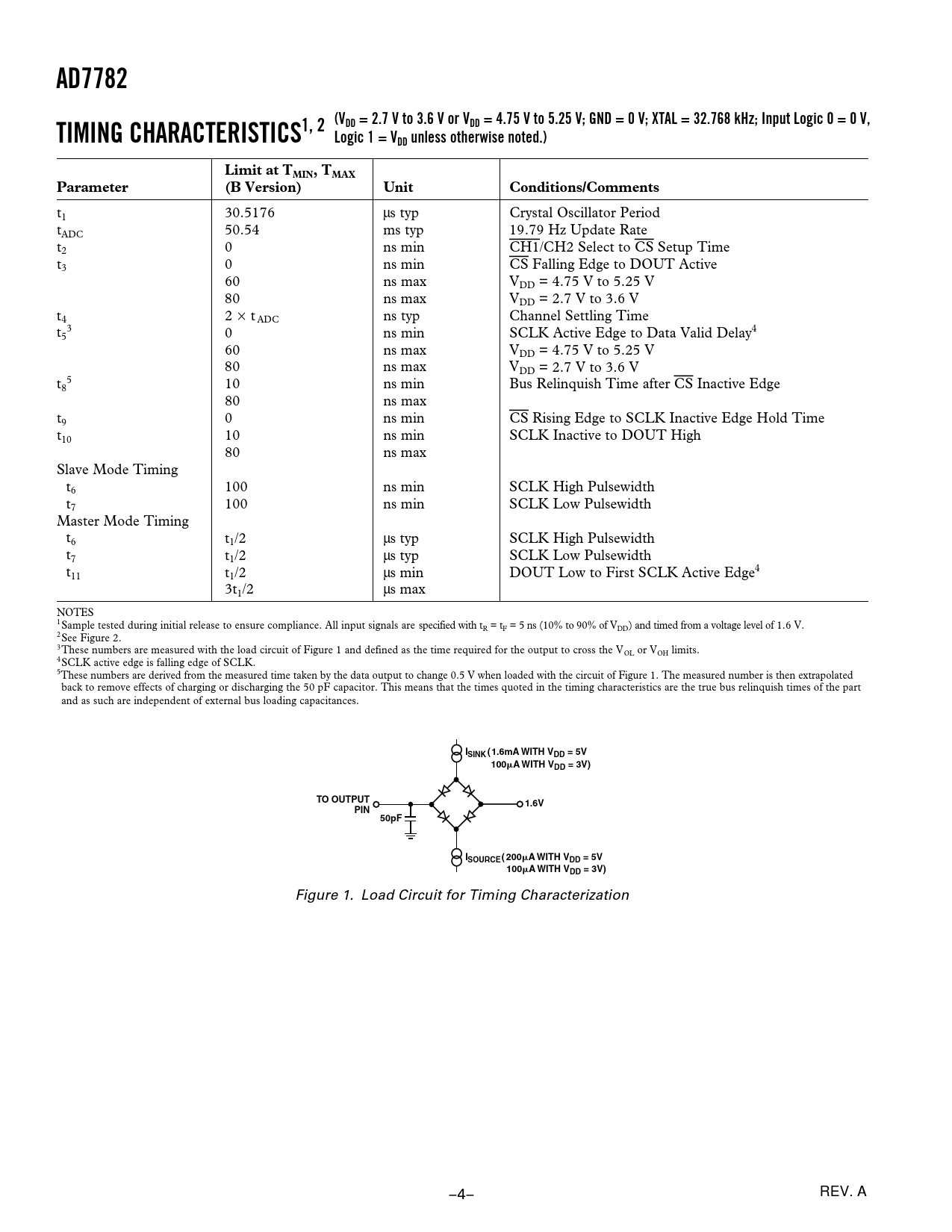 AD7782 TIMING CHARACTERISTICS1, 2 (VDD = 2.7 V to 3.6 V or VDD = 4.75 V to 5.25 V; GND = 0 V; XTAL = 32.768 kHz; Input Logic 0 = 0 V, Logic 1 = VDD unless otherwise noted.) Limit at TMIN, TMAX Parameter (B Version) Unit Conditions/Comments