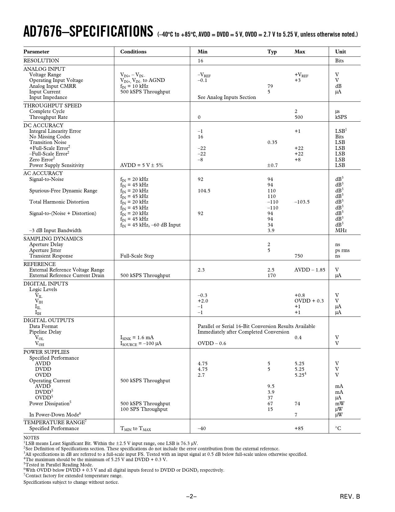 AD7676–SPECIFICATIONS (–40 C to +85 C, AVDD = DVDD = 5 V, OVDD = 2.7 V to 5.25 V, unless otherwise noted.) Parameter