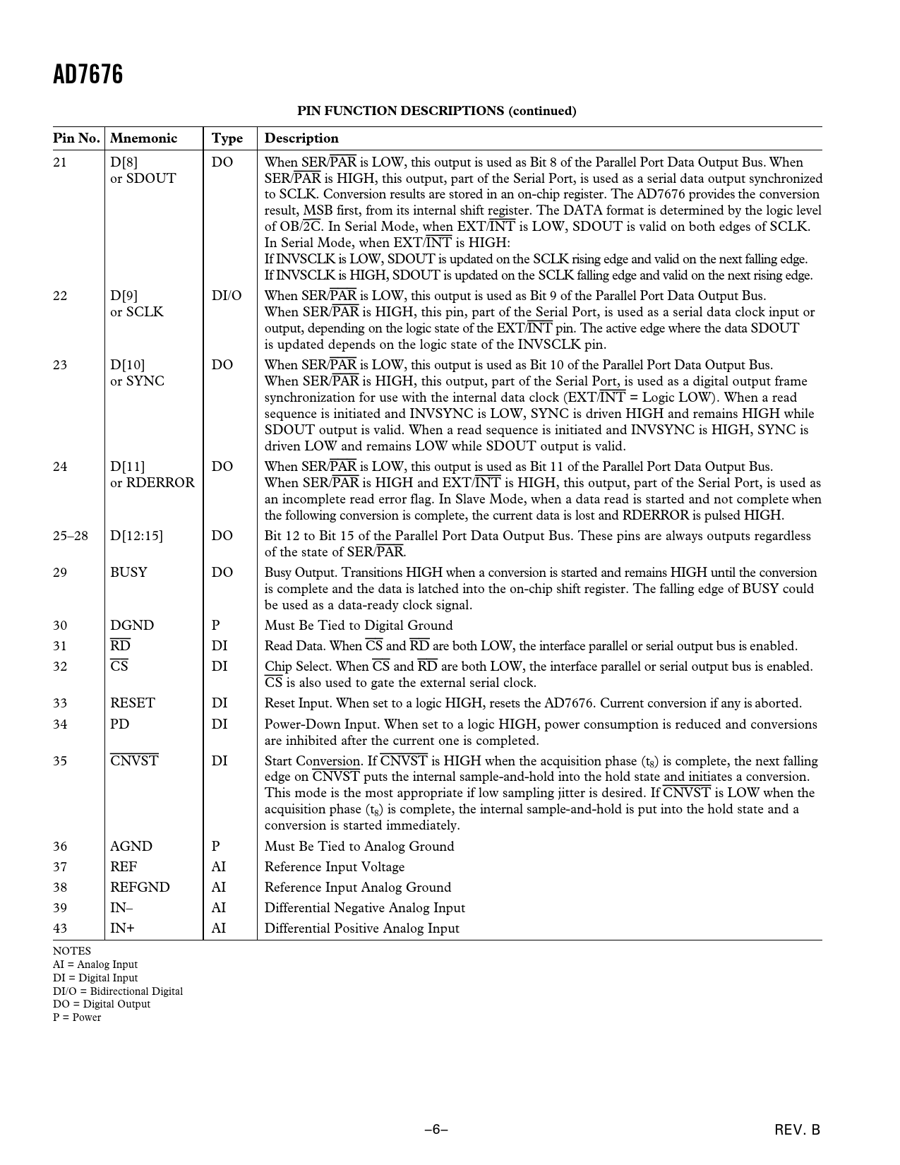 AD7676 PIN FUNCTION DESCRIPTIONS (continued) Pin No Mnemonic Type Description