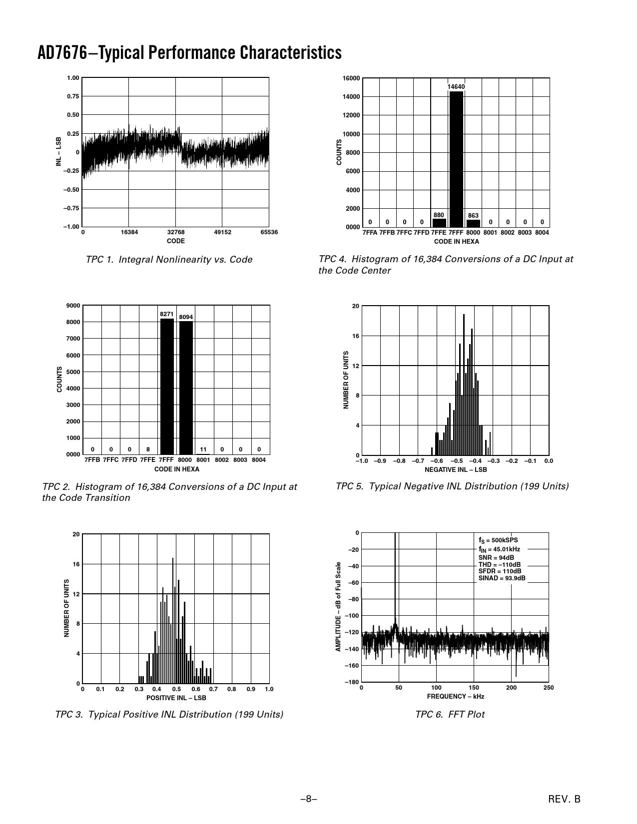 AD7676–Typical Performance Characteristics 1.00 16000 14640 0.75 14000 0.50 12000 0.25 10000 0 8000 INL – LSB COUNTS –0.25 6000 –0.50 4000 –0.75 2000 880 863 0 0 0 0 0 0 0 0 –1.00 0000 0 16384 32768 49152 65536 7FFA 7FFB 7FFC 7FFD 7FFE 7FFF 8000 8001 8002 8003 8004 CODE CODE IN HEXA