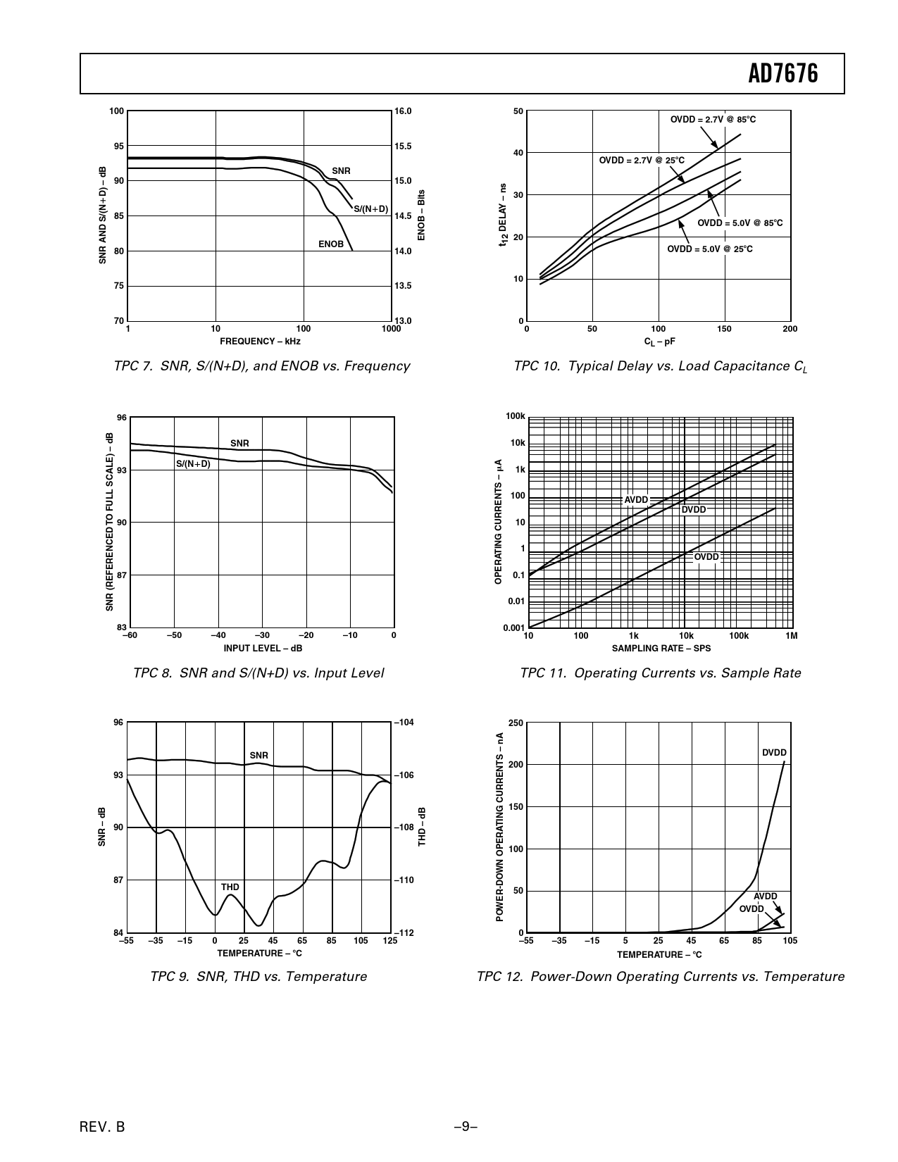 AD767610016.050OVDD = 2.7V @ 85C9515.540OVDD = 2.7V @ 25CSNR9015.0D) – dB30S/(ND)Y – ns8514.5OVDD = 5.0V @ 85CDELAENOB – Bits20ENOBt 128014.0OVDD = 5.0V @ 25CSNR AND S/(N107513.57013.001101001000050100150200FREQUENCY – kHzCL – pF TPC 7. SNR, S/(N+D), and ENOB vs. Frequency TPC 10. Typical Delay vs. Load Capacitance CL 96100kSNR10kS/(ND)A931k100AVDDFULL SCALE) – dBDVDDO T 9010ING CURRENTS – T1OVDD870.1OPERA0.01SNR (REFERENCED830.001–60–50–40–30–20–100101001k10k100k1MINPUT LEVEL – dBSAMPLING RATE – SPS TPC 8. SNR and S/(N+D) vs. Input Level TPC 11. Operating Currents vs. Sample Rate 96–104250SNRDVDD20093–106150ING CURRENTS – nA T90–108SNR – dBTHD – dB100WN OPERA87–110THD50AVDDWER-DOOVDDPO84–1120–55–35–15025456585105125–55–35–15525456585105TEMPERATURE –CTEMPERATURE –C TPC 9. SNR, THD vs. Temperature TPC 12. Power-Down Operating Currents vs. Temperature REV. B –9– Document Outline FEATURES APPLICATIONS GENERAL DESCRIPTION FUNCTIONAL BLOCK DIAGRAM PRODUCT HIGHLIGHTS SPECIFICATIONS RESOLUTION ANALOG INPUT THROUGHPUT SPEED DC ACCURACY AC ACCURACY SAMPLING DYNAMICS REFERENCE DIGITAL INPUTS DIGITAL OUTPUTS POWER SUPPLIES TEMPERATURE RANGE TIMING SPECIFICATIONS ABSOLUTE MAXIMUM RATINGS ORDERING GUIDE PIN FUNCTION DESCRIPTIONS PIN FUNCTION DESCRIPTIONS (continued) PIN CONFIGURATION DEFINITION OF SPECIFICATIONS Integral Nonlinearity Error (INL) Differential Nonlinearity Error (DNL) +Full-Scale Error –Full-Scale Error Bipolar Zero Error Spurious-Free Dynamic Range (SFDR) Effective Number of Bits (ENOB) Total Harmonic Distortion (THD) Signal-to-Noise Ratio (SNR) Signal-to-(Noise + Distortion) Ratio (S/[N+D]) Aperture Delay Transient Response Typical Performance Characteristics CIRCUIT INFORMATION CONVERTER OPERATION Transfer Functions TYPICAL CONNECTION DIAGRAM Analog Inputs Single-to-Differential Driver Driver Amplifier Choice Voltage Reference Input Power Supply POWER DISSIPATION CONVERSION CONTROL DIGITAL INTERFACE PARALLEL INTERFACE SERIAL INTERFACE MASTER SERIAL INTERFACE Internal Clock SLAVE SERIAL INTERFACE External Clock External Discontinuous Clock Data Read after Conversion External Clock Data Read During Conversion MICROPROCESSOR INTERFACING SPI Interface (MC68HC11) ADSP-21065L in Master Serial Interface APPLICATION HINTS Layout Evaluating the AD7676 Performance OUTLINE DIMENSIONS Revision History