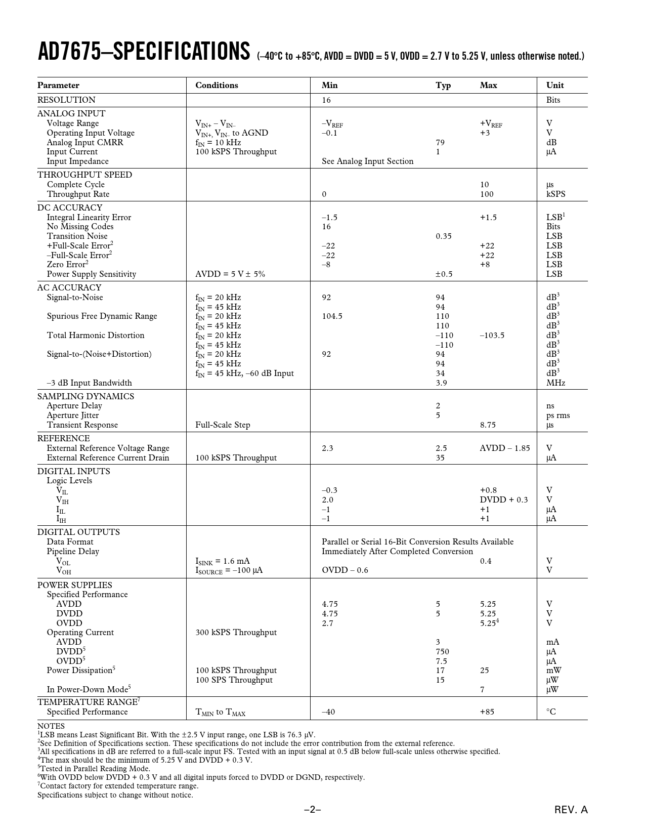 AD7675–SPECIFICATIONS (–40C to +85C, AVDD = DVDD = 5 V, OVDD = 2.7 V to 5.25 V, unless otherwise noted.)ParameterConditionsMinTypMaxUnit RESOLUTION 16 Bits ANALOG INPUT Voltage Range VIN+ – VIN– –VREF +VREF V Operating Input Voltage VIN+, VIN– to AGND –0.1 +3 V Analog Input CMRR fIN = 10 kHz 79 dB Input Current 100 kSPS Throughput 1 µA Input Impedance See Analog Input Section THROUGHPUT SPEED Complete Cycle 10 µs Throughput Rate 0 100 kSPS DC ACCURACY Integral Linearity Error –1.5 +1.5 LSB1 No Missing Codes 16 Bits Transition Noise 0.35 LSB +Full-Scale Error2 –22 +22 LSB –Full-Scale Error2 –22 +22 LSB Zero Error2 –8 +8 LSB Power Supply Sensitivity AVDD = 5 V ± 5% ±0.5 LSB AC ACCURACY Signal-to-Noise fIN = 20 kHz 92 94 dB3 fIN = 45 kHz 94 dB3 Spurious Free Dynamic Range fIN = 20 kHz 104.5 110 dB3 fIN = 45 kHz 110 dB3 Total Harmonic Distortion fIN = 20 kHz –110 –103.5 dB3 fIN = 45 kHz –110 dB3 Signal-to-(Noise+Distortion) fIN = 20 kHz 92 94 dB3 fIN = 45 kHz 94 dB3 fIN = 45 kHz, –60 dB Input 34 dB3 –3 dB Input Bandwidth 3.9 MHz SAMPLING DYNAMICS Aperture Delay 2 ns Aperture Jitter 5 ps rms Transient Response Full-Scale Step 8.75 µs REFERENCE External Reference Voltage Range 2.3 2.5 AVDD – 1.85 V External Reference Current Drain 100 kSPS Throughput 35 µA DIGITAL INPUTS Logic Levels VIL –0.3 +0.8 V VIH 2.0 DVDD + 0.3 V IIL –1 +1 µA IIH –1 +1 µA DIGITAL OUTPUTS Data Format Parallel or Serial 16-Bit Conversion Results Available Pipeline Delay Immediately After Completed Conversion VOL ISINK = 1.6 mA 0.4 V VOH ISOURCE = –100 µA OVDD – 0.6 V POWER SUPPLIES Specified Performance AVDD 4.75 5 5.25 V DVDD 4.75 5 5.25 V OVDD 2.7 5.254 V Operating Current 300 kSPS Throughput AVDD 3 mA DVDD5 750 µA OVDD5 7.5 µA Power Dissipation5 100 kSPS Throughput 17 25 mW 100 SPS Throughput 15 µW In Power-Down Mode5 7 µW TEMPERATURE RANGE7 Specified Performance TMIN to TMAX –40 +85 °C NOTES 1LSB means Least Significant Bit. With the ±2.5 V input range, one LSB is 76.3 µV. 2See Definition of Specifications section. These specifications do not include the error contribution from the external reference. 3All specifications in dB are referred to a full-scale input FS. Tested with an input signal at 0.5 dB below full-scale unless otherwise specified. 4The max should be the minimum of 5.25 V and DVDD + 0.3 V. 5Tested in Parallel Reading Mode. 6With OVDD below DVDD + 0.3 V and all digital inputs forced to DVDD or DGND, respectively. 7Contact factory for extended temperature range. Specifications subject to change without notice. –2– REV. A Document Outline FEATURES APPLICATIONS FUNCTIONAL BLOCK DIAGRAM PulSAR Selection GENERAL DESCRIPTION PRODUCT HIGHLIGHTS SPECIFICATIONS Table I. Serial Clock Timings in Master Read after Convert ABSOLUTE MAXIMUM RATINGS ORDERING GUIDE PIN FUNCTION DESCRIPTIONS PIN CONFIGURATION DEFINITION OF SPECIFICATIONS INTEGRAL NONLINEARITY ERROR (INL) DIFFERENTIAL NONLINEARITY ERROR (DNL) +FULL-SCALE ERROR –FULL-SCALE ERROR BIPOLAR ZERO ERROR SPURIOUS FREE DYNAMIC RANGE (SFDR) EFFECTIVE NUMBER OF BITS (ENOB) TOTAL HARMONIC DISTORTION (THD) SIGNAL-TO-NOISE RATIO (SNR) SIGNAL-TO-(NOISE + DISTORTION) RATIO (S/[N+D]) APERTURE DELAY TRANSIENT RESPONSE Typical Performance Characteristics CIRCUIT INFORMATION CONVERTER OPERATION Transfer Functions TYPICAL CONNECTION DIAGRAM Analog Inputs Single to Differential Driver Driver Amplifier Choice Voltage Reference Input Power Supply POWER DISSIPATION CONVERSION CONTROL DIGITAL INTERFACE PARALLEL INTERFACE SERIAL INTERFACE MASTER SERIAL INTERFACE Internal Clock SLAVE SERIAL INTERFACE External Clock External Discontinuous Clock Data Read after Conversion External Clock Data Read During Conversion MICROPROCESSOR INTERFACING SPI Interface (MC68HC11) ADSP-21065L in Master Serial Interface APPLICATION HINTS Layout Evaluating the AD7675 Performance OUTLINE DIMENSIONS Revision History