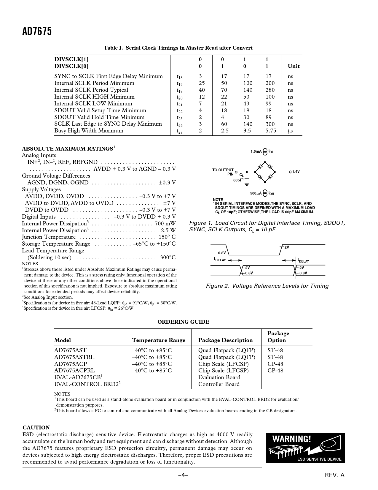 AD7675 Table I Serial Clock Timings in Master Read after Convert DIVSCLK[1] DIVSCLK[0] Unit ABSOLUTE MAXIMUM RATINGS1 1.6mA