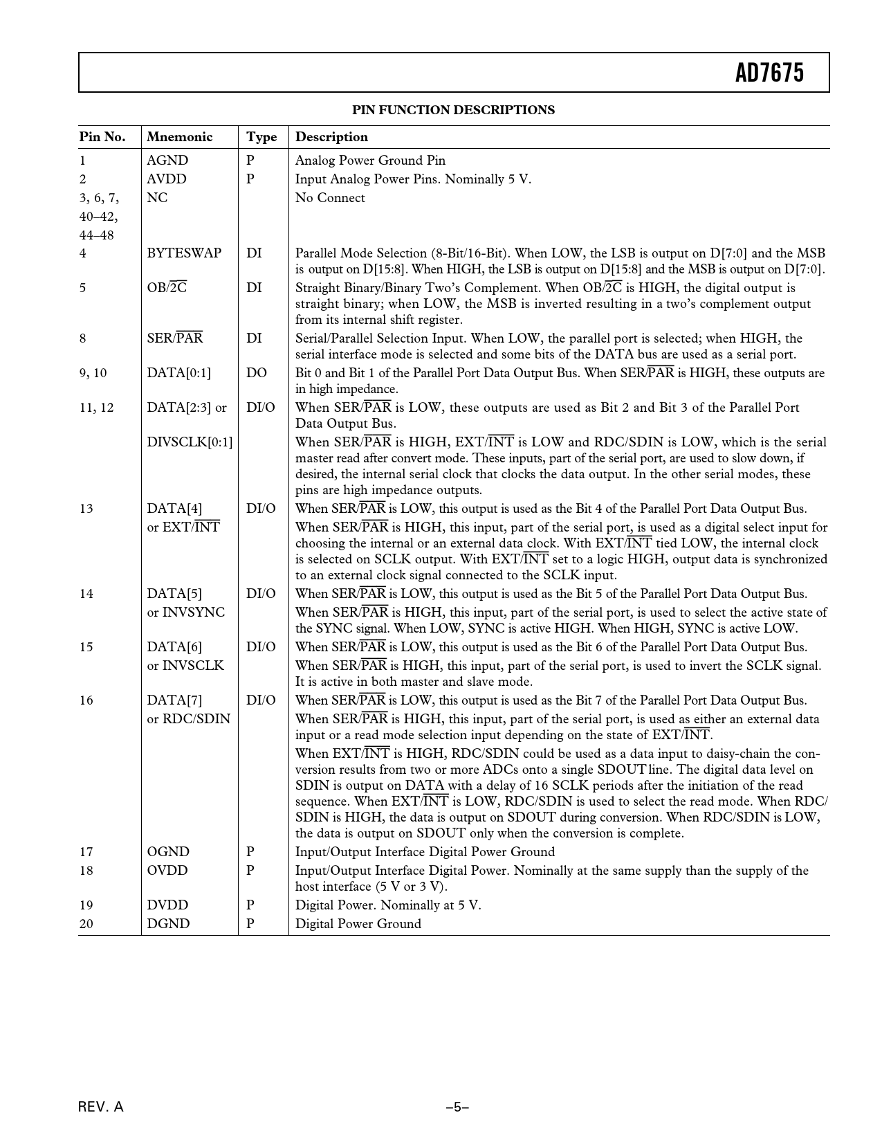 AD7675 PIN FUNCTION DESCRIPTIONS Pin No Mnemonic Type Description
