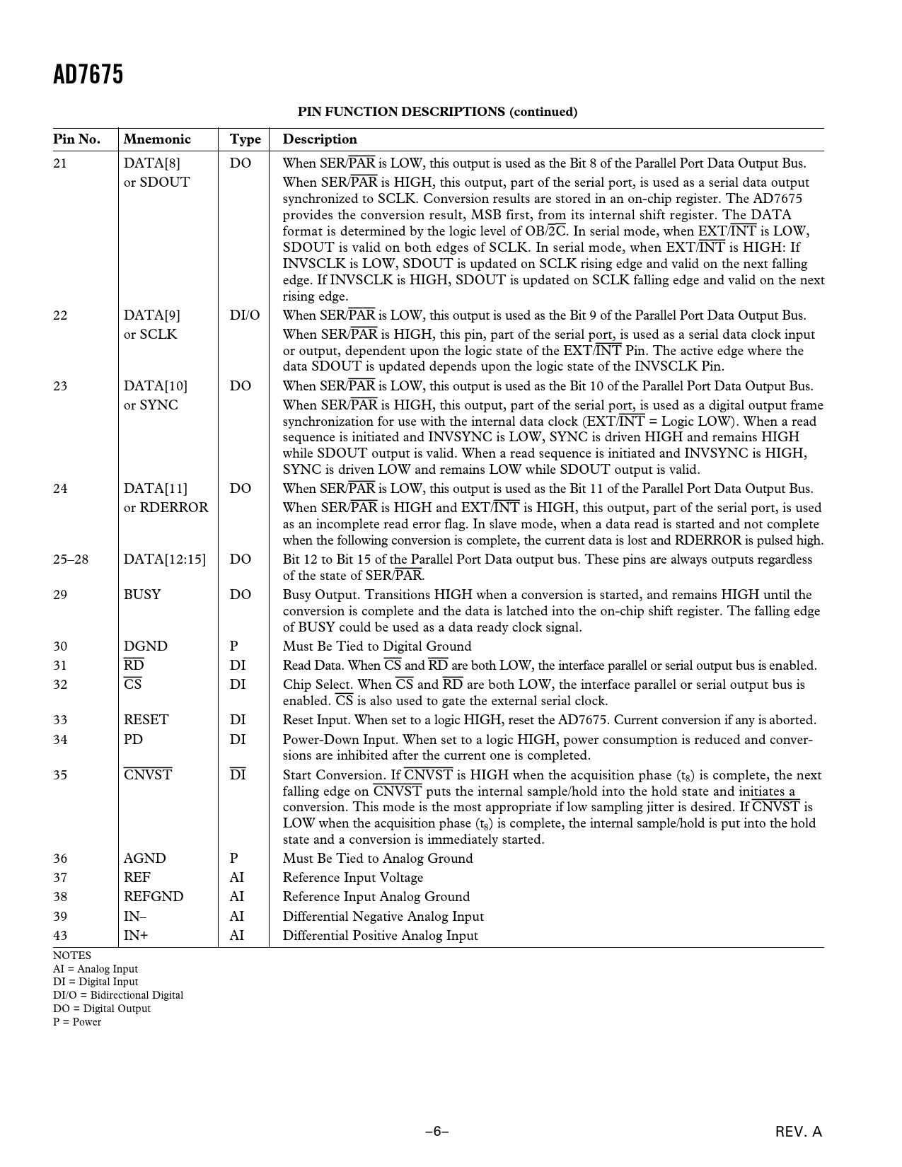 AD7675 PIN FUNCTION DESCRIPTIONS (continued) Pin No. Mnemonic Type Description