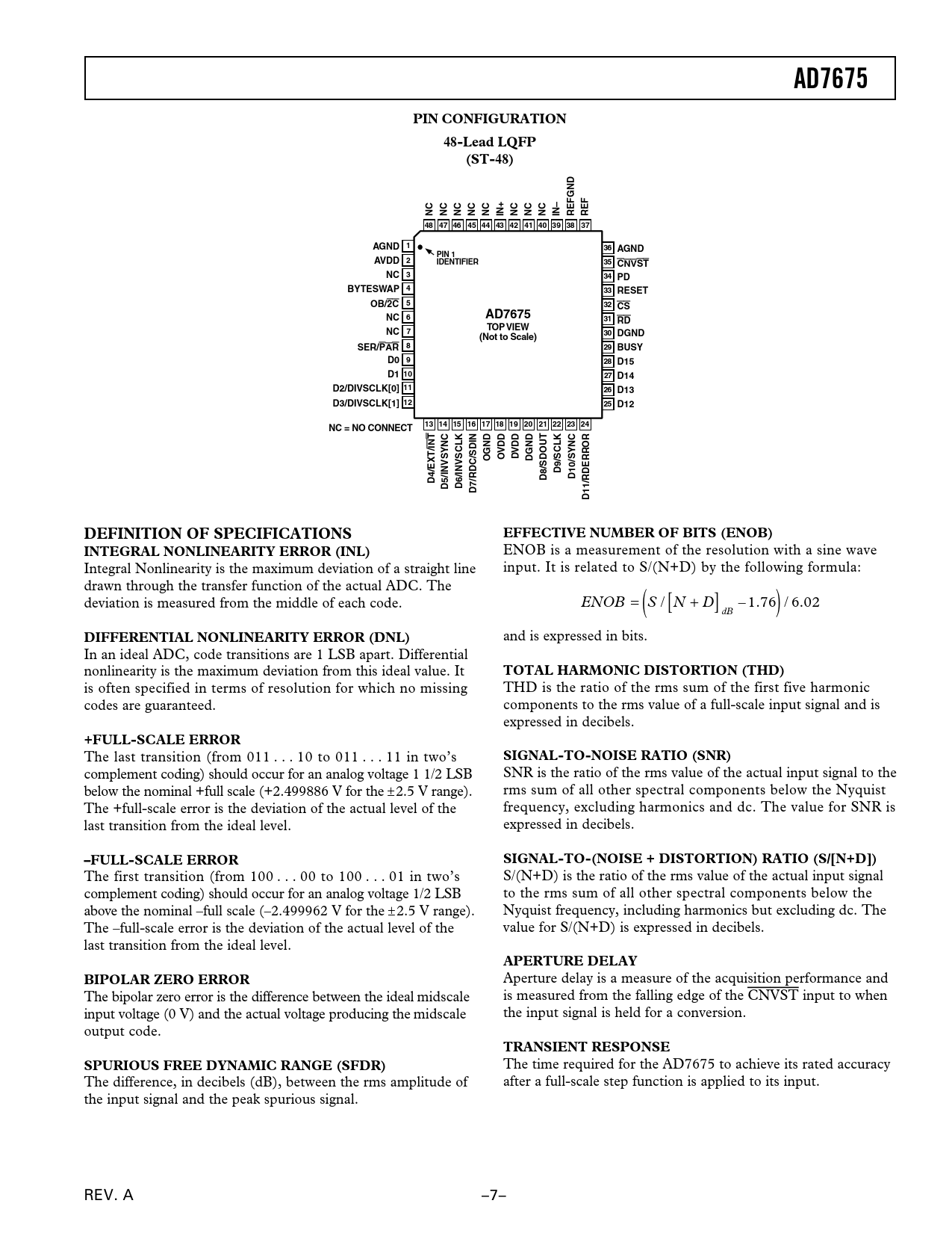 AD7675PIN CONFIGURATION48-Lead LQFP(ST-48)NCNCNCNCNCIN+NCNCNCIN–REFGNDREF48 47 46 45 44 43 42 41 40 39 38 37AGND 136 AGNDPIN 1AVDD 2IDENTIFIER35 CNVSTNC 334 PDBYTESWAP 433 RESET5OB/2C32 CSNC 6AD767531 RDTOP VIEWNC 730(Not to Scale)DGND8SER/PAR29 BUSYD0 928 D15D1 1027 D1411D2/DIVSCLK[0]26 D13D3/DIVSCLK[1] 1225 D1213 14 15 16 17 18 19 20 21 22 23 24NC = NO CONNECTDDINTDDOROGNDOVDVDGNDD9/SCLKD10/SYNCD4/EXT/D8/SDOUTD5/INVSYNCD6/INVSCLKD7/RDC/SDIND11/RDERRDEFINITION OF SPECIFICATIONSEFFECTIVE NUMBER OF BITS (ENOB)INTEGRAL NONLINEARITY ERROR (INL) ENOB is a measurement of the resolution with a sine wave Integral Nonlinearity is the maximum deviation of a straight line input. It is related to S/(N+D) by the following formula: drawn through the transfer function of the actual ADC. The deviation is measured from the middle of each code. ENOB = S / N ( [ +D] – .17 )6/ .602 dB DIFFERENTIAL NONLINEARITY ERROR (DNL) and is expressed in bits. In an ideal ADC, code transitions are 1 LSB apart. Differential nonlinearity is the maximum deviation from this ideal value. It TOTAL HARMONIC DISTORTION (THD) is often specified in terms of resolution for which no missing THD is the ratio of the rms sum of the first five harmonic codes are guaranteed. components to the rms value of a full-scale input signal and is expressed in decibels. +FULL-SCALE ERROR The last transition (from 011 . 10 to 011 . 11 in two’s SIGNAL-TO-NOISE RATIO (SNR) complement coding) should occur for an analog voltage 1 1/2 LSB SNR is the ratio of the rms value of the actual input signal to the below the nominal +full scale (+2.499886 V for the ±2.5 V range). rms sum of all other spectral components below the Nyquist The +full-scale error is the deviation of the actual level of the frequency, excluding harmonics and dc. The value for SNR is last transition from the ideal level. expressed in decibels. –FULL-SCALE ERRORSIGNAL-TO-(NOISE + DISTORTION) RATIO (S/[N+D]) The first transition (from 100 . 00 to 100 . 01 in two’s S/(N+D) is the ratio of the rms value of the actual input signal complement coding) should occur for an analog voltage 1/2 LSB to the rms sum of all other spectral components below the above the nominal –full scale (–2.499962 V for the ±2.5 V range). Nyquist frequency, including harmonics but excluding dc. The The –full-scale error is the deviation of the actual level of the value for S/(N+D) is expressed in decibels. last transition from the ideal level. APERTURE DELAYBIPOLAR ZERO ERROR Aperture delay is a measure of the acquisition performance and The bipolar zero error is the difference between the ideal midscale is measured from the falling edge of the CNVST input to when input voltage (0 V) and the actual voltage producing the midscale the input signal is held for a conversion. output code. TRANSIENT RESPONSESPURIOUS FREE DYNAMIC RANGE (SFDR) The time required for the AD7675 to achieve its rated accuracy The difference, in decibels (dB), between the rms amplitude of after a full-scale step function is applied to its input. the input signal and the peak spurious signal. REV. A –7– Document Outline FEATURES APPLICATIONS FUNCTIONAL BLOCK DIAGRAM PulSAR Selection GENERAL DESCRIPTION PRODUCT HIGHLIGHTS SPECIFICATIONS Table I. Serial Clock Timings in Master Read after Convert ABSOLUTE MAXIMUM RATINGS ORDERING GUIDE PIN FUNCTION DESCRIPTIONS PIN CONFIGURATION DEFINITION OF SPECIFICATIONS INTEGRAL NONLINEARITY ERROR (INL) DIFFERENTIAL NONLINEARITY ERROR (DNL) +FULL-SCALE ERROR –FULL-SCALE ERROR BIPOLAR ZERO ERROR SPURIOUS FREE DYNAMIC RANGE (SFDR) EFFECTIVE NUMBER OF BITS (ENOB) TOTAL HARMONIC DISTORTION (THD) SIGNAL-TO-NOISE RATIO (SNR) SIGNAL-TO-(NOISE + DISTORTION) RATIO (S/[N+D]) APERTURE DELAY TRANSIENT RESPONSE Typical Performance Characteristics CIRCUIT INFORMATION CONVERTER OPERATION Transfer Functions TYPICAL CONNECTION DIAGRAM Analog Inputs Single to Differential Driver Driver Amplifier Choice Voltage Reference Input Power Supply POWER DISSIPATION CONVERSION CONTROL DIGITAL INTERFACE PARALLEL INTERFACE SERIAL INTERFACE MASTER SERIAL INTERFACE Internal Clock SLAVE SERIAL INTERFACE External Clock External Discontinuous Clock Data Read after Conversion External Clock Data Read During Conversion MICROPROCESSOR INTERFACING SPI Interface (MC68HC11) ADSP-21065L in Master Serial Interface APPLICATION HINTS Layout Evaluating the AD7675 Performance OUTLINE DIMENSIONS Revision History