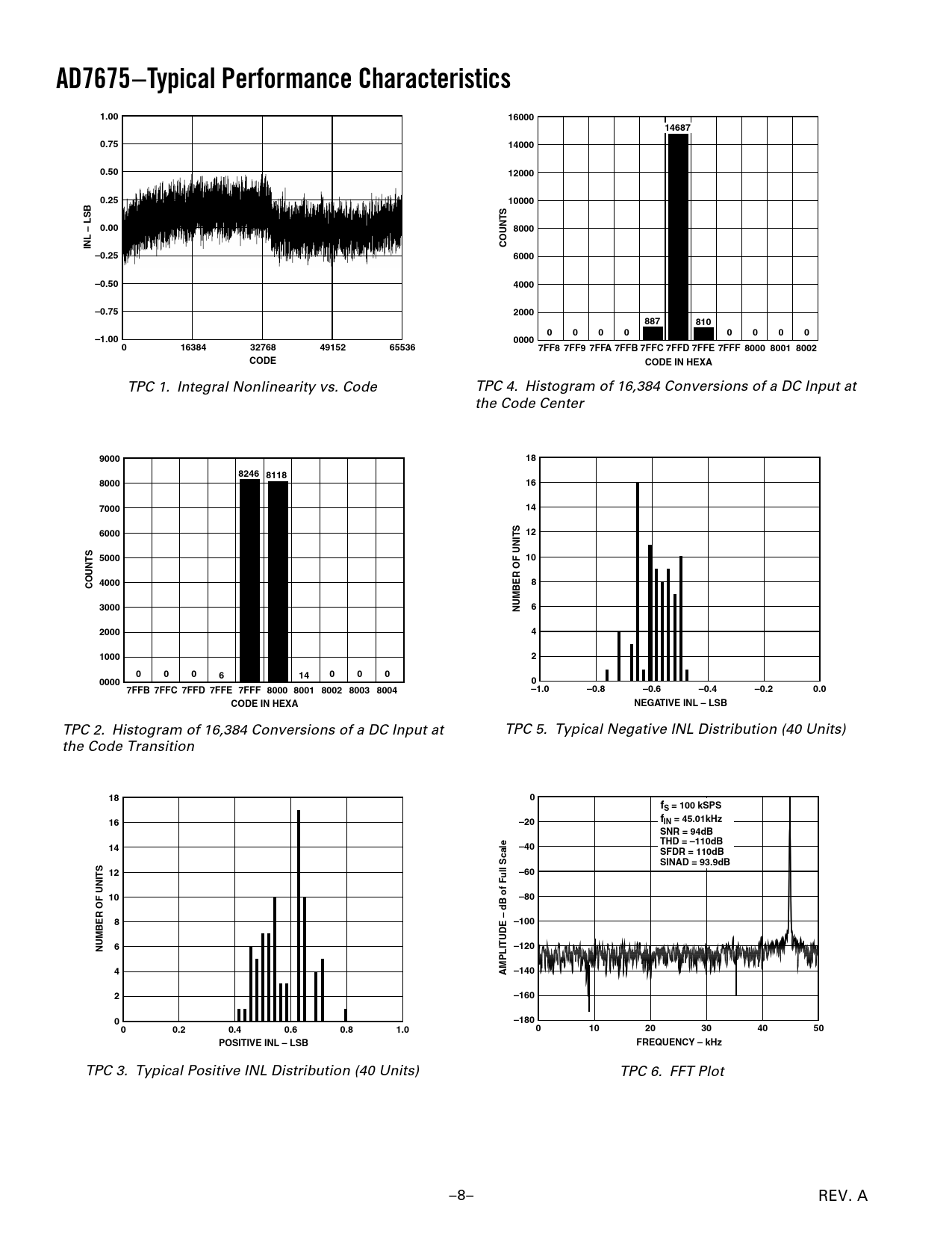 TPC 1. Integral Nonlinearity vs. Code TPC 4. Histogram of 16,384 Conversions of a DC Input at the Code Center