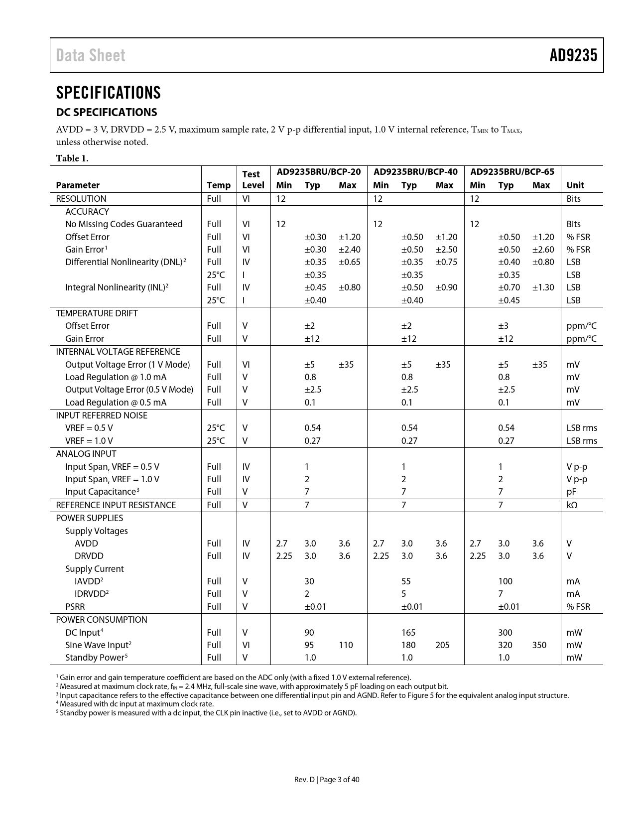 link to page 11 link to page 4 link to page 4 link to page 4 link to page 4 link to page 4 link to page 4 link to page 4 link to page 4 link to page 4 Data SheetAD9235SPECIFICATIONS DC SPECIFICATIONS AVDD = 3 V, DRVDD = 2.5 V, maximum sample rate, 2 V p-p differential input, 1.0 V internal reference, TMIN to TMAX, unless otherwise noted. Table 1.TestAD9235BRU/BCP-20AD9235BRU/BCP-40AD9235BRU/BCP-65ParameterTemp Level Min TypMaxMin TypMaxMin TypMaxUnit RESOLUTION Full VI 12 12 12 Bits ACCURACY No Missing Codes Guaranteed Full VI 12 12 12 Bits Offset Error Full VI ±0.30 ±1.20 ±0.50 ±1.20 ±0.50 ±1.20 % FSR Gain Error1 Full VI ±0.30 ±2.40 ±0.50 ±2.50 ±0.50 ±2.60 % FSR Differential Nonlinearity (DNL)2 Full IV ±0.35 ±0.65 ±0.35 ±0.75 ±0.40 ±0.80 LSB 25°C I ±0.35 ±0.35 ±0.35 LSB Integral Nonlinearity (INL)2 Full IV ±0.45 ±0.80 ±0.50 ±0.90 ±0.70 ±1.30 LSB 25°C I ±0.40 ±0.40 ±0.45 LSB TEMPERATURE DRIFT Offset Error Full V ±2 ±2 ±3 ppm/°C Gain Error Full V ±12 ±12 ±12 ppm/°C INTERNAL VOLTAGE REFERENCE Output Voltage Error (1 V Mode) Full VI ±5 ±35 ±5 ±35 ±5 ±35 mV Load Regulation @ 1.0 mA Full V 0.8 0.8 0.8 mV Output Voltage Error (0.5 V Mode) Full V ±2.5 ±2.5 ±2.5 mV Load Regulation @ 0.5 mA Full V 0.1 0.1 0.1 mV INPUT REFERRED NOISE VREF = 0.5 V 25°C V 0.54 0.54 0.54 LSB rms VREF = 1.0 V 25°C V 0.27 0.27 0.27 LSB rms ANALOG INPUT Input Span, VREF = 0.5 V Full IV 1 1 1 V p-p Input Span, VREF = 1.0 V Full IV 2 2 2 V p-p Input Capacitance3 Full V 7 7 7 pF REFERENCE INPUT RESISTANCE Full V 7 7 7 kΩ POWER SUPPLIES Supply Voltages AVDD Full IV 2.7 3.0 3.6 2.7 3.0 3.6 2.7 3.0 3.6 V DRVDD Full IV 2.25 3.0 3.6 2.25 3.0 3.6 2.25 3.0 3.6 V Supply Current IAVDD2 Full V 30 55 100 mA IDRVDD2 Full V 2 5 7 mA PSRR Full V ±0.01 ±0.01 ±0.01 % FSR POWER CONSUMPTION DC Input4 Full V 90 165 300 mW Sine Wave Input2 Full VI 95 110 180 205 320 350 mW Standby Power5 Full V 1.0 1.0 1.0 mW 1 Gain error and gain temperature coefficient are based on the ADC only (with a fixed 1.0 V external reference). 2 Measured at maximum clock rate, fIN = 2.4 MHz, ful -scale sine wave, with approximately 5 pF loading on each output bit. 3 Input capacitance refers to the effective capacitance between one differential input pin and AGND. Refer to Figure 5 for the equivalent analog input structure. 4 Measured with dc input at maximum clock rate. 5 Standby power is measured with a dc input, the CLK pin inactive (i.e., set to AVDD or AGND). Rev. D | Page 3 of 40 Document Outline Specifications DC Specifications Digital Specifications Switching Specifications AC Specifications Absolute Maximum Ratings Explanation of Test Levels ESD Caution Pin Configurations and Function Descriptions Definitions of Specifications Equivalent Circuits Typical Performance Characteristics Applying the AD9235 Theory of Operation Analog Input Differential Input Configurations Single-Ended Input Configuration Clock Input Considerations Power Dissipation and Standby Mode Digital Outputs Timing Voltage Reference Internal Reference Connection External Reference Operation Operational Mode Selection TSSOP Evaluation Board LFCSP Evaluation Board Outline Dimensions Ordering Guide