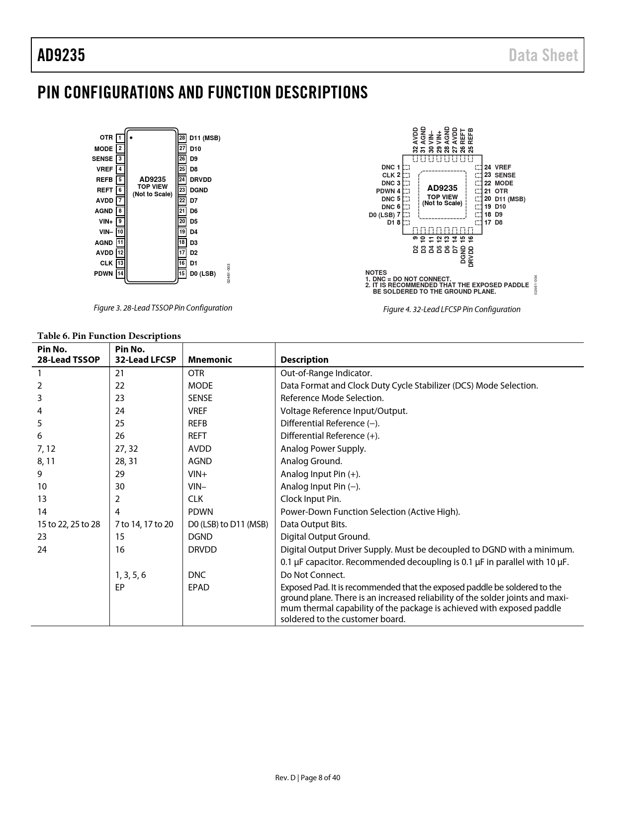 1 21 OTR Out-of-Range Indicator. 2 22 MODE Data Format and Clock Duty Cycle Stabilizer (DCS) Mode Selection. 3 23 SENSE Reference Mode Selection. 4 24 VREF Voltage Reference Input/Output. 5 25 REFB Differential Reference (−). 6 26 REFT Differential Reference (+). 7, 12 27, 32 AVDD Analog Power Supply. 8, 11 28, 31 AGND Analog Ground. 9 29 VIN+ Analog Input Pin (+). 10 30 VIN– Analog Input Pin (−). 13 2 CLK Clock Input Pin. 14 4 PDWN Power-Down Function Selection (Active High). 15 to 22, 25 to 28 7 to 14, 17 to 20 D0 (LSB) to D11 (MSB) Data Output Bits. 23 15 DGND Digital Output Ground. 24 16 DRVDD Digital Output Driver Supply. Must be decoupled to DGND with a minimum. 0.1 µF capacitor. Recommended decoupling is 0.1 µF in parallel with 10 µF. 1, 3, 5, 6 DNC Do Not Connect. EP EPAD Exposed Pad. It is recommended that the exposed paddle be soldered to the ground plane. There is an increased reliability of the solder joints and maxi- mum thermal capability of the package is achieved with exposed paddle soldered to the customer board. Rev. D | Page 8 of 40 Document Outline Specifications DC Specifications Digital Specifications Switching Specifications AC Specifications Absolute Maximum Ratings Explanation of Test Levels ESD Caution Pin Configurations and Function Descriptions Definitions of Specifications Equivalent Circuits Typical Performance Characteristics Applying the AD9235 Theory of Operation Analog Input Differential Input Configurations Single-Ended Input Configuration Clock Input Considerations Power Dissipation and Standby Mode Digital Outputs Timing Voltage Reference Internal Reference Connection External Reference Operation Operational Mode Selection TSSOP Evaluation Board LFCSP Evaluation Board Outline Dimensions Ordering Guide