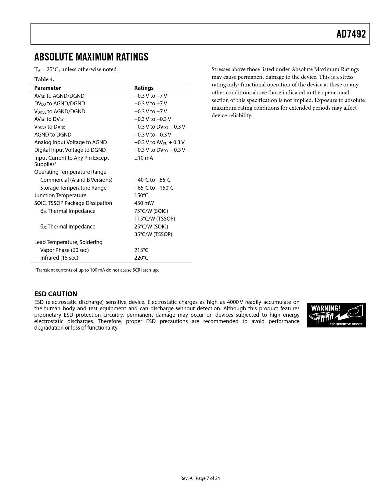 link to page 8 AD7492ABSOLUTE MAXIMUM RATINGS TA = 25°C, unless otherwise noted. Stresses above those listed under Absolute Maximum Ratings Table 4. may cause permanent damage to the device. This is a stress rating only; functional operation of the device at these or any Parameter Ratings other conditions above those indicated in the operational AVDD to AGND/DGND −0.3 V to +7 V section of this specification is not implied. Exposure to absolute DVDD to AGND/DGND −0.3 V to +7 V maximum rating conditions for extended periods may affect VDRIVE to AGND/DGND −0.3 V to +7 V device reliability. AVDD to DVDD −0.3 V to +0.3 V VDRIVE to DVDD −0.3 V to DVDD + 0.3 V AGND to DGND −0.3 V to +0.3 V Analog Input Voltage to AGND −0.3 V to AVDD + 0.3 V Digital Input Voltage to DGND −0.3 V to DVDD + 0.3 V Input Current to Any Pin Except ±10 mA Supplies1 Operating Temperature Range Commercial (A and B Versions) −40°C to +85°C Storage Temperature Range −65°C to +150°C Junction Temperature 150°C SOIC, TSSOP Package Dissipation 450 mW θJA Thermal Impedance 75°C/W (SOIC) 115°C/W (TSSOP) θJC Thermal Impedance 25°C/W (SOIC) 35°C/W (TSSOP) Lead Temperature, Soldering Vapor Phase (60 sec) 215°C Infrared (15 sec) 220°C 1 Transient currents of up to 100 mA do not cause SCR latch-up. ESD CAUTION ESD (electrostatic discharge) sensitive device. Electrostatic charges as high as 4000 V readily accumulate on the human body and test equipment and can discharge without detection. Although this product features proprietary ESD protection circuitry, permanent damage may occur on devices subjected to high energy electrostatic discharges. Therefore, proper ESD precautions are recommended to avoid performance degradation or loss of functionality. Rev. A | Page 7 of 24 Document Outline FEATURES FUNCTIONAL BLOCK DIAGRAM GENERAL DESCRIPTION PRODUCT HIGHLIGHTS TABLE OF CONTENTS REVISION HISTORY SPECIFICATIONS AD7492-5 AD7492/AD7492-4 TIMING SPECIFICATIONS ABSOLUTE MAXIMUM RATINGS ESD CAUTION PIN CONFIGURATION AND FUNCTION DESCRIPTIONS TYPICAL PEFORMANCE CHARACTERISTICS TERMINOLOGY CIRCUIT DESCRIPTION CONVERTER OPERATION TYPICAL CONNECTION DIAGRAM ADC TRANSFER FUNCTION AC ACQUISITION TIME DC ACQUISITION TIME ANALOG INPUT PARALLEL INTERFACE OPERATING MODES POWER-UP GROUNDING AND LAYOUT POWER SUPPLIES MICROPROCESSOR INTERFACING OUTLINE DIMENSIONS ORDERING GUIDE