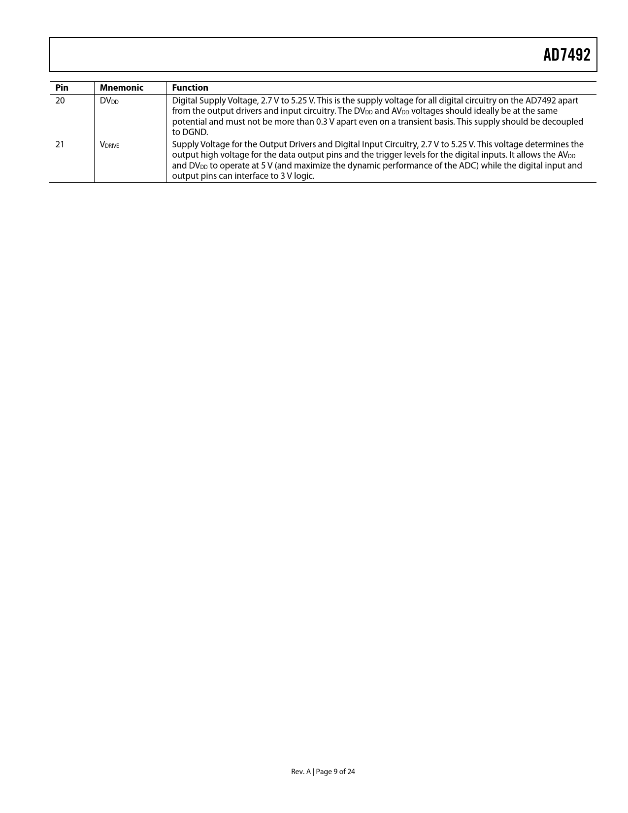 20 DVDD Digital Supply Voltage, 2.7 V to 5.25 V. This is the supply voltage for all digital circuitry on the AD7492 apart from the output drivers and input circuitry. The DVDD and AVDD voltages should ideally be at the same potential and must not be more than 0.3 V apart even on a transient basis. This supply should be decoupled to DGND. 21 VDRIVE Supply Voltage for the Output Drivers and Digital Input Circuitry, 2.7 V to 5.25 V. This voltage determines the output high voltage for the data output pins and the trigger levels for the digital inputs. It allows the AVDD and DVDD to operate at 5 V (and maximize the dynamic performance of the ADC) while the digital input and output pins can interface to 3 V logic. Rev. A | Page 9 of 24 Document Outline FEATURES FUNCTIONAL BLOCK DIAGRAM GENERAL DESCRIPTION PRODUCT HIGHLIGHTS TABLE OF CONTENTS REVISION HISTORY SPECIFICATIONS AD7492-5 AD7492/AD7492-4 TIMING SPECIFICATIONS ABSOLUTE MAXIMUM RATINGS ESD CAUTION PIN CONFIGURATION AND FUNCTION DESCRIPTIONS TYPICAL PEFORMANCE CHARACTERISTICS TERMINOLOGY CIRCUIT DESCRIPTION CONVERTER OPERATION TYPICAL CONNECTION DIAGRAM ADC TRANSFER FUNCTION AC ACQUISITION TIME DC ACQUISITION TIME ANALOG INPUT PARALLEL INTERFACE OPERATING MODES POWER-UP GROUNDING AND LAYOUT POWER SUPPLIES MICROPROCESSOR INTERFACING OUTLINE DIMENSIONS ORDERING GUIDE