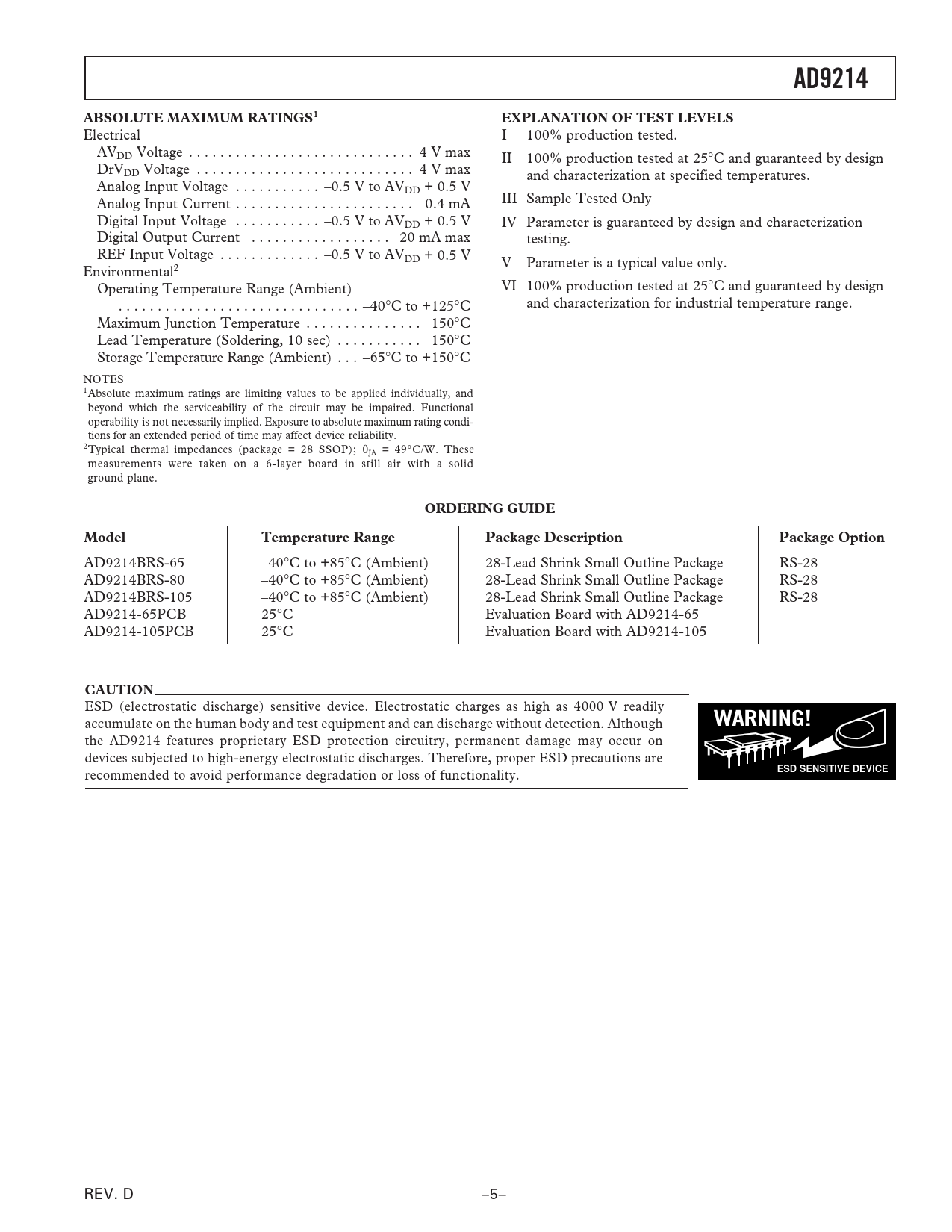 AD9214ABSOLUTE MAXIMUM RATINGS1EXPLANATION OF TEST LEVELS Electrical I 100% production tested. AVDD Voltage . 4 V max II 100% production tested at 25°C and guaranteed by design DrVDD Voltage . 4 V max and characterization at specified temperatures. Analog Input Voltage . –0.5 V to AVDD + 0.5 V Analog Input Current . 0.4 mA III Sample Tested Only Digital Input Voltage . –0.5 V to AVDD + 0.5 V IV Parameter is guaranteed by design and characterization Digital Output Current . 20 mA max testing. REF Input Voltage . –0.5 V to AVDD + 0.5 V V Parameter is a typical value only. Environmental2 Operating Temperature Range (Ambient) VI 100% production tested at 25°C and guaranteed by design . –40°C to +125°C and characterization for industrial temperature range. Maximum Junction Temperature . 150°C Lead Temperature (Soldering, 10 sec) . 150°C Storage Temperature Range (Ambient) . –65°C to +150°C NOTES 1Absolute maximum ratings are limiting values to be applied individually, and beyond which the serviceability of the circuit may be impaired. Functional operability is not necessarily implied. Exposure to absolute maximum rating condi- tions for an extended period of time may affect device reliability. 2Typical thermal impedances (package = 28 SSOP); θJA = 49°C/W. These measurements were taken on a 6-layer board in still air with a solid ground plane. ORDERING GUIDEModelTemperature RangePackage DescriptionPackage Option AD9214BRS-65 –40°C to +85°C (Ambient) 28-Lead Shrink Small Outline Package RS-28 AD9214BRS-80 –40°C to +85°C (Ambient) 28-Lead Shrink Small Outline Package RS-28 AD9214BRS-105 –40°C to +85°C (Ambient) 28-Lead Shrink Small Outline Package RS-28 AD9214-65PCB 25°C Evaluation Board with AD9214-65 AD9214-105PCB 25°C Evaluation Board with AD9214-105 CAUTION ESD (electrostatic discharge) sensitive device. Electrostatic charges as high as 4000 V readily accumulate on the human body and test equipment and can discharge without detection. Although WARNING! the AD9214 features proprietary ESD protection circuitry, permanent damage may occur on devices subjected to high-energy electrostatic discharges. Therefore, proper ESD precautions are ESD SENSITIVE DEVICE recommended to avoid performance degradation or loss of functionality. REV. D –5–