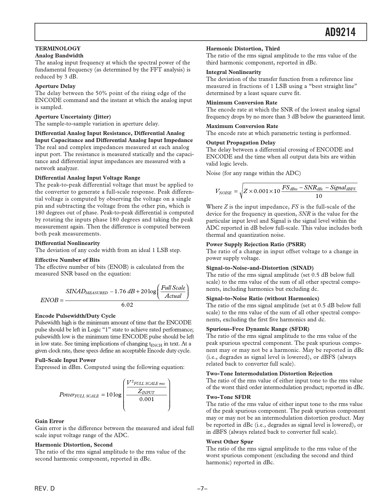 AD9214TERMINOLOGYHarmonic Distortion, ThirdAnalog Bandwidth The ratio of the rms signal amplitude to the rms value of the The analog input frequency at which the spectral power of the third harmonic component, reported in dBc. fundamental frequency (as determined by the FFT analysis) is Integral Nonlinearity reduced by 3 dB. The deviation of the transfer function from a reference line Aperture Delay measured in fractions of 1 LSB using a “best straight line” The delay between the 50% point of the rising edge of the determined by a least square curve fit. ENCODE command and the instant at which the analog input Minimum Conversion Rate is sampled. The encode rate at which the SNR of the lowest analog signal Aperture Uncertainty (Jitter) frequency drops by no more than 3 dB below the guaranteed limit. The sample-to-sample variation in aperture delay. Maximum Conversion RateDifferential Analog Input Resistance, Differential Analog The encode rate at which parametric testing is performed. Input Capacitance and Differential Analog Input ImpedanceOutput Propagation Delay The real and complex impedances measured at each analog The delay between a differential crossing of ENCODE and input port. The resistance is measured statically and the capaci- ENCODE and the time when all output data bits are within tance and differential input impedances are measured with a valid logic levels. network analyzer. Noise (for any range within the ADC) Differential Analog Input Voltage Range The peak-to-peak differential voltage that must be applied to FSdBm SNRdBc Signal the converter to generate a full-scale response. Peak differen- V dBFS = × 0 001 . × − − NOISE Z 10 10 tial voltage is computed by observing the voltage on a single pin and subtracting the voltage from the other pin, which is Where Z is the input impedance, FS is the full-scale of the 180 degrees out of phase. Peak-to-peak differential is computed device for the frequency in question, SNR is the value for the by rotating the inputs phase 180 degrees and taking the peak particular input level and Signal is the signal level within the measurement again. Then the difference is computed between ADC reported in dB below full-scale. This value includes both both peak measurements. thermal and quantization noise. Differential NonlinearityPower Supply Rejection Ratio (PSRR) The deviation of any code width from an ideal 1 LSB step. The ratio of a change in input offset voltage to a change in Effective Number of Bits power supply voltage. The effective number of bits (ENOB) is calculated from the Signal-to-Noise-and-Distortion (SINAD) measured SNR based on the equation: The ratio of the rms signal amplitude (set 0.5 dB below full scale) to the rms value of the sum of all other spectral compo- Full Scale SINAD – . 1 76 + nents, including harmonics but excluding dc. MEASURED dB 20 log Actual ENOB = Signal-to-Noise Ratio (without Harmonics) . 6 02 The ratio of the rms signal amplitude (set at 0.5 dB below full scale) to the rms value of the sum of all other spectral compo- Encode Pulsewidth/Duty Cycle nents, excluding the first five harmonics and dc. Pulsewidth high is the minimum amount of time that the ENCODE pulse should be left in Logic “1” state to achieve rated performance; Spurious-Free Dynamic Range (SFDR) pulsewidth low is the minimum time ENCODE pulse should be left The ratio of the rms signal amplitude to the rms value of the in low state. See timing implications of changing t peak spurious spectral component. The peak spurious compo- ENCH in text. At a given clock rate, these specs define an acceptable Encode duty cycle. nent may or may not be a harmonic. May be reported in dBc (i.e., degrades as signal level is lowered), or dBFS (always Full-Scale Input Power related back to converter full scale). Expressed in dBm. Computed using the following equation: Two-Tone Intermodulation Distortion Rejection V 2 The ratio of the rms value of either input tone to the rms value FULL SCALE rms of the worst third order intermodulation product; reported in dBc. Z Power INPUT = FULL SCALE 10 log 0 001 . Two-Tone SFDR The ratio of the rms value of either input tone to the rms value of the peak spurious component. The peak spurious component may or may not be an intermodulation distortion product. May Gain Error be reported in dBc (i.e., degrades as signal level is lowered), or Gain error is the difference between the measured and ideal full in dBFS (always related back to converter full scale). scale input voltage range of the ADC. Worst Other SpurHarmonic Distortion, Second The ratio of the rms signal amplitude to the rms value of the The ratio of the rms signal amplitude to the rms value of the worst spurious component (excluding the second and third second harmonic component, reported in dBc. harmonic) reported in dBc. REV. D –7–