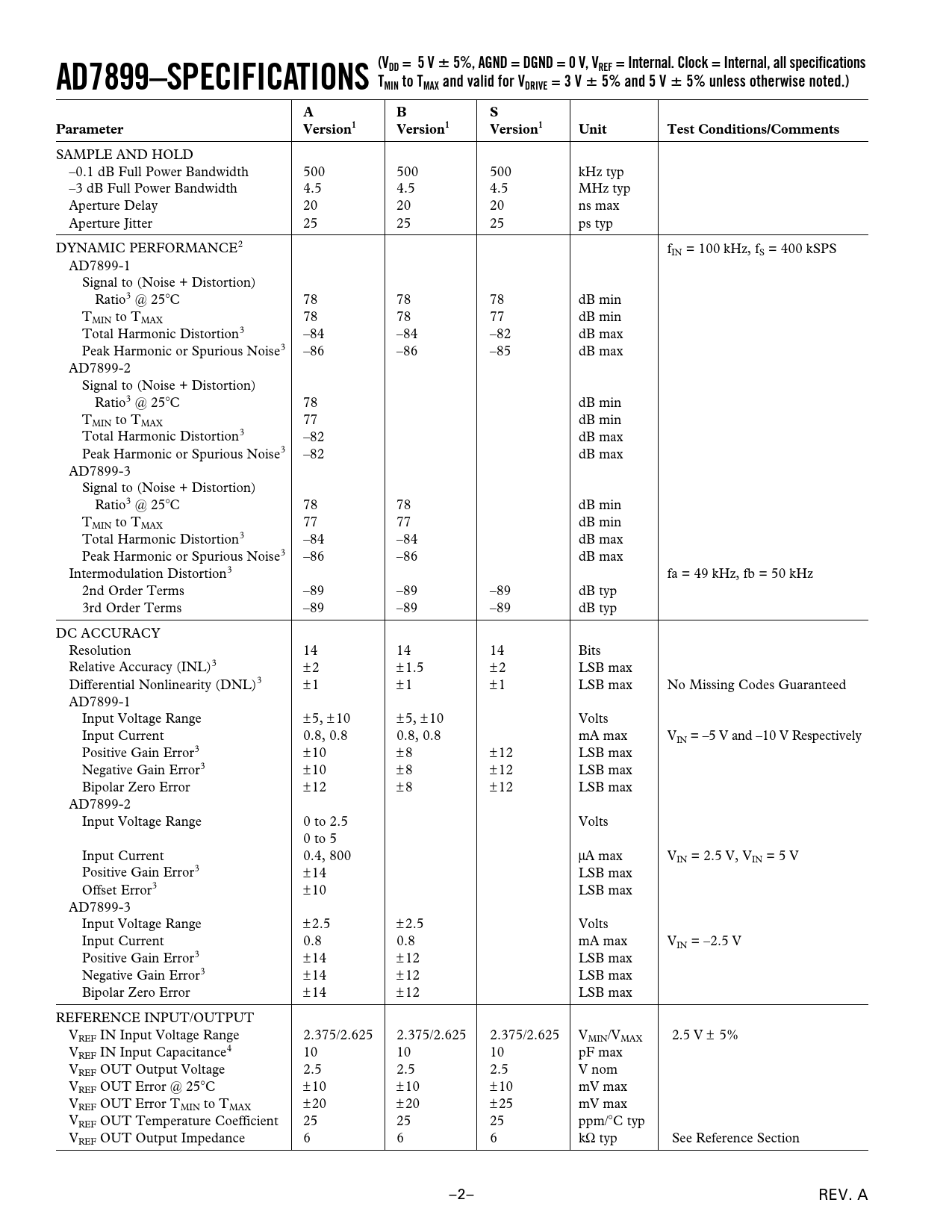 SAMPLE AND HOLD –0.1 dB Full Power Bandwidth 500 500 500 kHz typ –3 dB Full Power Bandwidth 4.5 4.5 4.5 MHz typ Aperture Delay 20 20 20 ns max Aperture Jitter 25 25 25 ps typ DYNAMIC PERFORMANCE2 fIN = 100 kHz, fS = 400 kSPS AD7899-1 Signal to (Noise + Distortion) Ratio3 @ 25C 78 78 78 dB min TMIN to TMAX 78 78 77 dB min Total Harmonic Distortion3 –84 –84 –82 dB max Peak Harmonic or Spurious Noise3 –86 –86 –85 dB max AD7899-2 Signal to (Noise + Distortion) Ratio3 @ 25C 78 dB min TMIN to TMAX 77 dB min Total Harmonic Distortion3 –82 dB max Peak Harmonic or Spurious Noise3 –82 dB max AD7899-3 Signal to (Noise + Distortion) Ratio3 @ 25C 78 78 dB min TMIN to TMAX 77 77 dB min Total Harmonic Distortion3 –84 –84 dB max Peak Harmonic or Spurious Noise3 –86 –86 dB max Intermodulation Distortion3 fa = 49 kHz, fb = 50 kHz 2nd Order Terms –89 –89 –89 dB typ 3rd Order Terms –89 –89 –89 dB typ DC ACCURACY Resolution 14 14 14 Bits Relative Accuracy (INL)3 ± 2 ±1.5 ±2 LSB max Differential Nonlinearity (DNL)3 ± 1 ± 1 ±1 LSB max No Missing Codes Guaranteed AD7899-1 Input Voltage Range ±5, ±10 ±5, ±10 Volts Input Current 0.8, 0.8 0.8, 0.8 mA max VIN = –5 V and –10 V Respectively Positive Gain Error3 ±10 ± 8 ±12 LSB max Negative Gain Error3 ±10 ± 8 ±12 LSB max Bipolar Zero Error ±12 ± 8 ±12 LSB max AD7899-2 Input Voltage Range 0 to 2.5 Volts 0 to 5 Input Current 0.4, 800 µA max VIN = 2.5 V, VIN = 5 V Positive Gain Error3 ±14 LSB max Offset Error3 ±10 LSB max AD7899-3 Input Voltage Range ±2.5 ±2.5 Volts Input Current 0.8 0.8 mA max VIN = –2.5 V Positive Gain Error3 ±14 ±12 LSB max Negative Gain Error3 ±14 ±12 LSB max Bipolar Zero Error ±14 ±12 LSB max REFERENCE INPUT/OUTPUT VREF IN Input Voltage Range 2.375/2.625 2.375/2.625 2.375/2.625 VMIN/VMAX 2.5 V ± 5% VREF IN Input Capacitance4 10 10 10 pF max VREF OUT Output Voltage 2.5 2.5 2.5 V nom VREF OUT Error @ 25C ±10 ±10 ±10 mV max V ± REF OUT Error TMIN to TMAX 20 ±20 ±25 mV max VREF OUT Temperature Coefficient 25 25 25 ppm/C typ VREF OUT Output Impedance 6 6 6 kΩ typ See Reference Section –2– REV. A