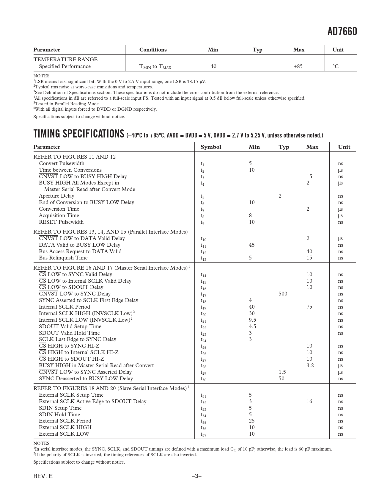AD7660ParameterConditionsMinTypMaxUnit TEMPERATURE RANGE Specified Performance TMIN to TMAX –40 +85 ∞C NOTES 1LSB means least significant bit. With the 0 V to 2.5 V input range, one LSB is 38.15 mV. 2Typical rms noise at worst-case transitions and temperatures. 3See Definition of Specifications section. These specifications do not include the error contribution from the external reference. 4All specifications in dB are referred to a full-scale input FS. Tested with an input signal at 0.5 dB below full-scale unless otherwise specified. 5Tested in Parallel Reading Mode. 6With all digital inputs forced to DVDD or DGND respectively. Specifications subject to change without notice. TIMING SPECIFICATIONS (–40C to +85C, AVDD = DVDD = 5 V, OVDD = 2.7 V to 5.25 V, unless otherwise noted.)ParameterSymbolMinTypMaxUnit REFER TO FIGURES 11 AND 12 Convert Pulsewidth t1 5 ns Time between Conversions t2 10 ms CNVST LOW to BUSY HIGH Delay t3 15 ns BUSY HIGH All Modes Except in t4 2 ms Master Serial Read after Convert Mode Aperture Delay t5 2 ns End of Conversion to BUSY LOW Delay t6 10 ns Conversion Time t7 2 ms Acquisition Time t8 8 ms RESET Pulsewidth t9 10 ns REFER TO FIGURES 13, 14, AND 15 (Parallel Interface Modes) CNVST LOW to DATA Valid Delay t10 2 ms DATA Valid to BUSY LOW Delay t11 45 ns Bus Access Request to DATA Valid t12 40 ns Bus Relinquish Time t13 5 15 ns REFER TO FIGURE 16 AND 17 (Master Serial Interface Modes)1 CS LOW to SYNC Valid Delay t14 10 ns CS LOW to Internal SCLK Valid Delay t15 10 ns CS LOW to SDOUT Delay t16 10 ns CNVST LOW to SYNC Delay t17 500 ns SYNC Asserted to SCLK First Edge Delay t18 4 ns Internal SCLK Period t19 40 75 ns Internal SCLK HIGH (INVSCLK Low)2 t20 30 ns Internal SCLK LOW (INVSCLK Low)2 t21 9.5 ns SDOUT Valid Setup Time t22 4.5 ns SDOUT Valid Hold Time t23 3 ns SCLK Last Edge to SYNC Delay t24 3 CS HIGH to SYNC HI-Z t25 10 ns CS HIGH to Internal SCLK HI-Z t26 10 ns CS HIGH to SDOUT HI-Z t27 10 ns BUSY HIGH in Master Serial Read after Convert t28 3.2 ms CNVST LOW to SYNC Asserted Delay t29 1.5 ms SYNC Deasserted to BUSY LOW Delay t30 50 ns REFER TO FIGURES 18 AND 20 (Slave Serial Interface Modes)1 External SCLK Setup Time t31 5 ns External SCLK Active Edge to SDOUT Delay t32 3 16 ns SDIN Setup Time t33 5 ns SDIN Hold Time t34 5 ns External SCLK Period t35 25 ns External SCLK HIGH t36 10 ns External SCLK LOW t37 10 ns NOTES 1In serial interface modes, the SYNC, SCLK, and SDOUT timings are defined with a maximum load C L of 10 pF; otherwise, the load is 60 pF maximum. 2If the polarity of SCLK is inverted, the timing references of SCLK are also inverted. Specifications subject to change without notice. REV. E –3– Document Outline FEATURES APPLICATIONS GENERAL DESCRIPTION FUNCTIONAL BLOCK DIAGRAM PRODUCT HIGHLIGHTS SPECIFICATIONS TIMING SPECIFICATIONS ABSOLUTE MAXIMUM RATINGS PIN CONFIGURATION ORDERING GUIDE PIN FUNCTION DESCRIPTIONS DEFINITION OF SPECIFICATIONS Integral Nonlinearity Error (INL) Differential Nonlinearity Error (DNL) Full-Scale Error Unipolar Zero Error Spurious-Free Dynamic Range (SFDR) Effective Number of Bits (ENOB) Total Harmonic Distortion (THD) Signal-to-Noise Ratio (SNR) Signal-to-(Noise + Distortion) Ratio (S/[N+D]) Aperture Delay Transient Response Overvoltage Recovery Typical Performance Characteristics CIRCUIT INFORMATION CONVERTER OPERATION Transfer Functions TYPICAL CONNECTION DIAGRAM Analog Input Driver Amplifier Choice Voltage Reference Input Power Supply POWER DISSIPATION VS. THROUGHPUT CONVERSION CONTROL DIGITAL INTERFACE PARALLEL INTERFACE SERIAL INTERFACE MASTER SERIAL INTERFACE Internal Clock SLAVE SERIAL INTERFACE External Clock External Discontinuous Clock Data Read after Conversion External Clock Data Read during Conversion MICROPROCESSOR INTERFACING SPI Interface (ADSP-219x) APPLICATION HINTS Bipolar and Wider Input Ranges Layout Evaluating the AD7660 Performance OUTLINE DIMENSIONS Revision History