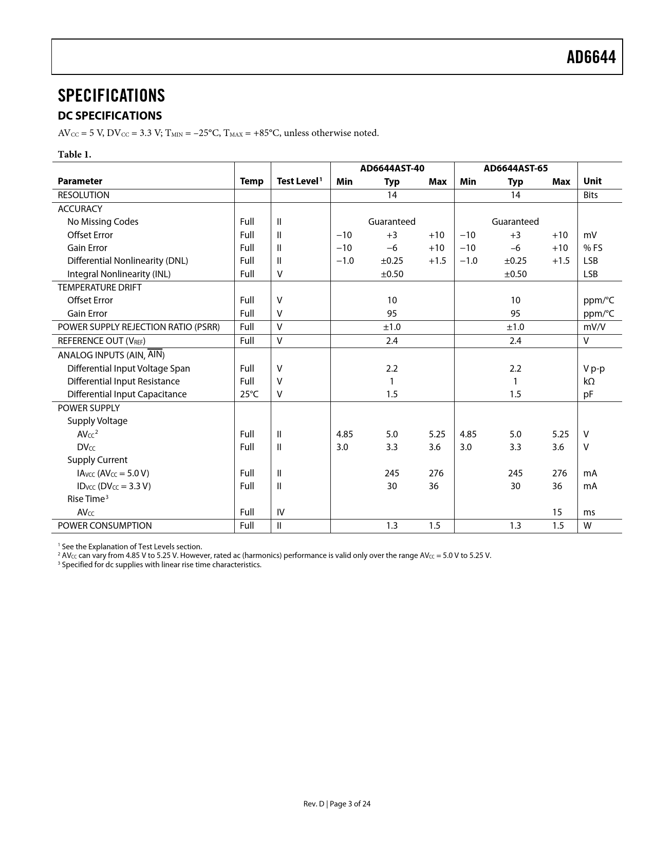 AD6644 SPECIFICATIONS DC SPECIFICATIONS Table 1 AD6644AST-40 AD6644AST-65 Parameter Temp Test Level1 Min Typ Max Unit