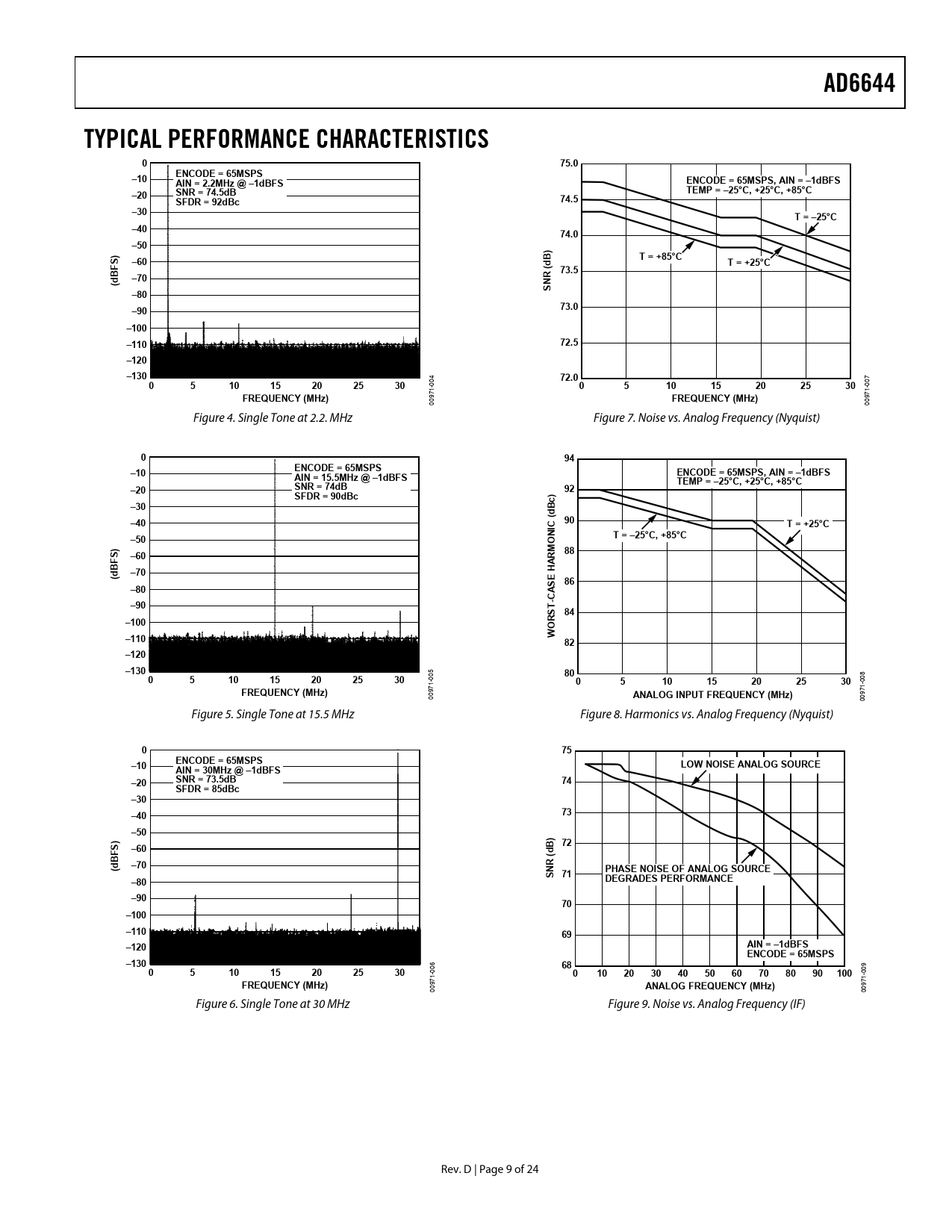 AD6644TYPICAL PERFORMANCE CHARACTERISTICS075.0ENCODE = 65MSPS–10AIN = 2.2MHz @ –1dBFSENCODE = 65MSPS, AIN = –1dBFSTEMP = –25°C, +25°C, +85°C–20SNR = 74.5dBSFDR = 92dBc74.5–30T = –25°C–4074.0–50))SB–60T = +85°CFdT = +25°CB73.5(d–70NR ( S–80–9073.0–100–11072.5–120–13072.0051015202530 004 007 1- 051015202530 1- FREQUENCY (MHz) 97 FREQUENCY (MHz) 97 00 00 Figure 4. Single Tone at 2.2. MHz Figure 7. Noise vs. Analog Frequency (Nyquist) 094ENCODE = 65MSPS–10ENCODE = 65MSPS, AIN = –1dBFSAIN = 15.5MHz @ –1dBFSTEMP = –25°C, +25°C, +85°C–20SNR = 74dB92SFDR = 90dBc–30Bc) d–40C ( 90T = +25°CNI–50T = –25°C, +85°CO) S88–60F–70HARM(dBE S 86–80-CA–90T 84–100RS O–110W 82–120–13080051015202530 08 -005 051015202530 0 71 1- FREQUENCY (MHz) 97 009 ANALOG INPUT FREQUENCY (MHz) 00 Figure 5. Single Tone at 15.5 MHz Figure 8. Harmonics vs. Analog Frequency (Nyquist) 075–10ENCODE = 65MSPSLOW NOISE ANALOG SOURCEAIN = 30MHz @ –1dBFS–20SNR = 73.5dB74SFDR = 85dBc–30–4073–50) S72–60B)FdB–70(dNR (PHASE NOISE OF ANALOG SOURCES 71–80DEGRADES PERFORMANCE–9070–100–11069–120AIN = –1dBFSENCODE = 65MSPS–13068051015202530 006 1- 0102030405060708090100 -009 FREQUENCY (MHz) 97 ANALOG FREQUENCY (MHz) 00 0971 0 Figure 6. Single Tone at 30 MHz Figure 9. Noise vs. Analog Frequency (IF) Rev. D | Page 9 of 24 Document Outline FEATURES APPLICATIONS GENERAL DESCRIPTION PRODUCT HIGHLIGHTS FUNCTIONAL BLOCK DIAGRAM TABLE OF CONTENTS REVISION HISTORY SPECIFICATIONS DC SPECIFICATIONS DIGITAL SPECIFICATIONS SWITCHING SPECIFICATIONS AC SPECIFICATIONS TIMING DIAGRAM ABSOLUTE MAXIMUM RATINGS EXPLANATION OF TEST LEVELS Test Level THERMAL RESISTANCE ESD CAUTION PIN CONFIGURATION AND FUNCTION DESCRIPTIONS TYPICAL PERFORMANCE CHARACTERISTICS EQUIVALENT CIRCUITS TERMINOLOGY THEORY OF OPERATION APPLYING THE AD6644 Encoding the AD6644 Analog Input Power Supplies Digital Outputs Layout Information Jitter Considerations EVALUATION BOARD OUTLINE DIMENSIONS ORDERING GUIDE