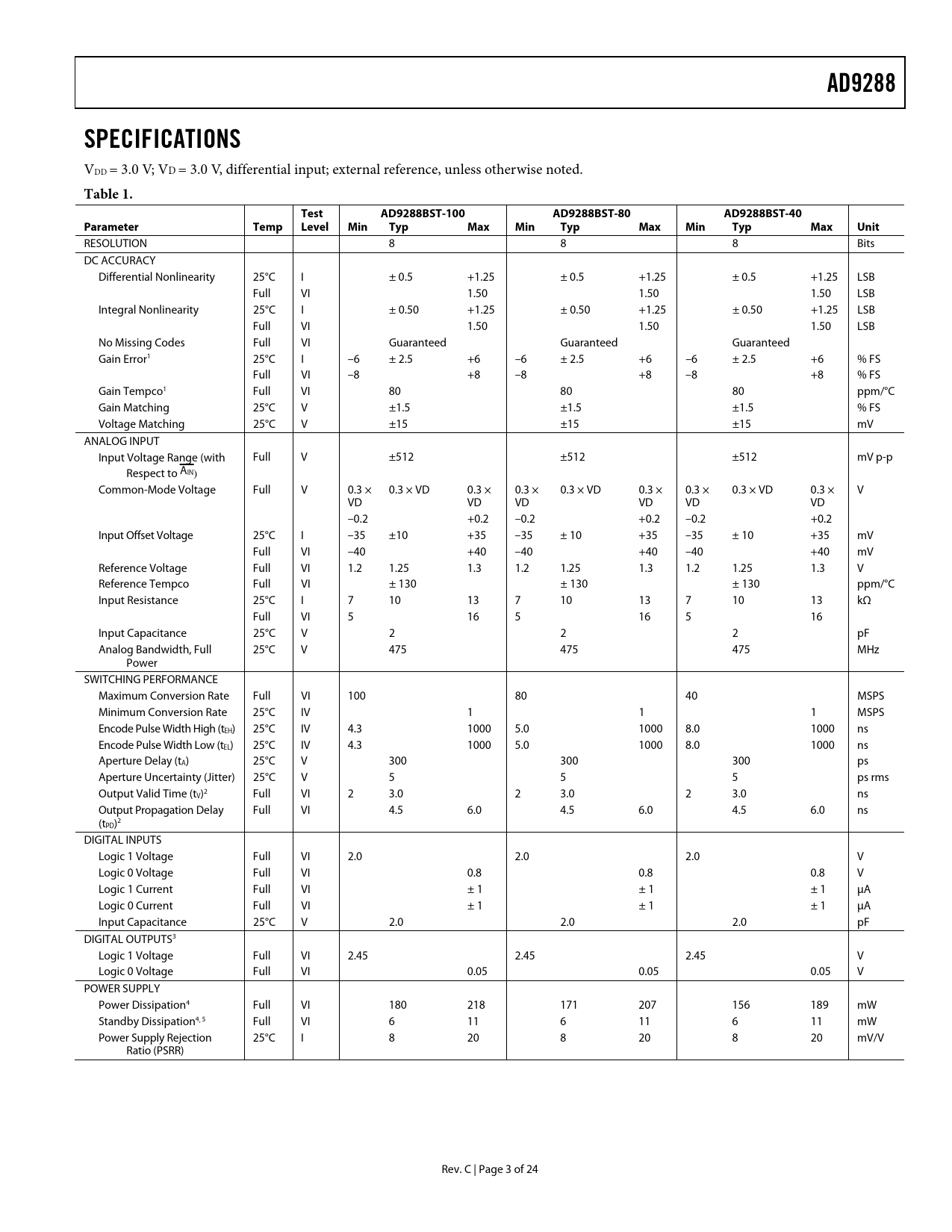 link to page 5 link to page 5 link to page 5 link to page 5 link to page 5 AD9288SPECIFICATIONS VDD = 3.0 V; VD = 3.0 V, differential input; external reference, unless otherwise noted. Table 1.TestAD9288BST-100AD9288BST-80AD9288BST-40ParameterTempLevelMinTypMaxMinTypMaxMinTypMaxUnit RESOLUTION 8 8 8 Bits DC ACCURACY Differential Nonlinearity 25°C I ± 0.5 +1.25 ± 0.5 +1.25 ± 0.5 +1.25 LSB Full VI 1.50 1.50 1.50 LSB Integral Nonlinearity 25°C I ± 0.50 +1.25 ± 0.50 +1.25 ± 0.50 +1.25 LSB Full VI 1.50 1.50 1.50 LSB No Missing Codes Full VI Guaranteed Guaranteed Guaranteed Gain Error1 25°C I –6 ± 2.5 +6 –6 ± 2.5 +6 –6 ± 2.5 +6 % FS Full VI –8 +8 –8 +8 –8 +8 % FS Gain Tempco1 Full VI 80 80 80 ppm/°C Gain Matching 25°C V ±1.5 ±1.5 ±1.5 % FS Voltage Matching 25°C V ±15 ±15 ±15 mV ANALOG INPUT Input Voltage Range (with Full V ±512 ±512 ±512 mV p-p Respect to AIN) Common-Mode Voltage Full V 0.3 × 0.3 × VD 0.3 × 0.3 × 0.3 × VD 0.3 × 0.3 × 0.3 × VD 0.3 × V VD VD VD VD VD VD –0.2 +0.2 –0.2 +0.2 –0.2 +0.2 Input Offset Voltage 25°C I –35 ±10 +35 –35 ± 10 +35 –35 ± 10 +35 mV Full VI –40 +40 –40 +40 –40 +40 mV Reference Voltage Full VI 1.2 1.25 1.3 1.2 1.25 1.3 1.2 1.25 1.3 V Reference Tempco Full VI ± 130 ± 130 ± 130 ppm/°C Input Resistance 25°C I 7 10 13 7 10 13 7 10 13 kΩ Full VI 5 16 5 16 5 16 Input Capacitance 25°C V 2 2 2 pF Analog Bandwidth, Full 25°C V 475 475 475 MHz Power SWITCHING PERFORMANCE Maximum Conversion Rate Full VI 100 80 40 MSPS Minimum Conversion Rate 25°C IV 1 1 1 MSPS Encode Pulse Width High (tEH) 25°C IV 4.3 1000 5.0 1000 8.0 1000 ns Encode Pulse Width Low (tEL) 25°C IV 4.3 1000 5.0 1000 8.0 1000 ns Aperture Delay (tA) 25°C V 300 300 300 ps Aperture Uncertainty (Jitter) 25°C V 5 5 5 ps rms Output Valid Time (tV)2 Full VI 2 3.0 2 3.0 2 3.0 ns Output Propagation Delay Full VI 4.5 6.0 4.5 6.0 4.5 6.0 ns (tPD)2 DIGITAL INPUTS Logic 1 Voltage Full VI 2.0 2.0 2.0 V Logic 0 Voltage Full VI 0.8 0.8 0.8 V Logic 1 Current Full VI ± 1 ± 1 ± 1 µA Logic 0 Current Full VI ± 1 ± 1 ± 1 µA Input Capacitance 25°C V 2.0 2.0 2.0 pF DIGITAL OUTPUTS3 Logic 1 Voltage Full VI 2.45 2.45 2.45 V Logic 0 Voltage Full VI 0.05 0.05 0.05 V POWER SUPPLY Power Dissipation4 Full VI 180 218 171 207 156 189 mW Standby Dissipation4, 5 Full VI 6 11 6 11 6 11 mW Power Supply Rejection 25°C I 8 20 8 20 8 20 mV/V Ratio (PSRR) Rev. C | Page 3 of 24 Document Outline FEATURES APPLICATIONS GENERAL DESCRIPTION FUNCTIONAL BLOCK DIAGRAM SPECIFICATIONS EXPLANATION OF TEST LEVELS TIMING DIAGRAMS ABSOLUTE MAXIMUM RATINGS ESD CAUTION PIN CONFIGURATION AND FUNCTION DESCRIPTIONS TYPICAL PERFORMANCE CHARACTERISTICS TEST CIRCUITS TERMINOLOGY THEORY OF OPERATION USING THE AD9288 ENCODE INPUT DIGITAL OUTPUTS ANALOG INPUT VOLTAGE REFERENCE TIMING USER-SELECTABLE OPTIONS AD9218/AD9288 CUSTOMER PCB BOM EVALUATION BOARD POWER CONNECTOR ANALOG INPUTS VOLTAGE REFERENCE CLOCKING DATA OUTPUTS DATA FORMAT/GAIN TIMING TROUBLESHOOTING OUTLINE DIMENSIONS ORDERING GUIDE
