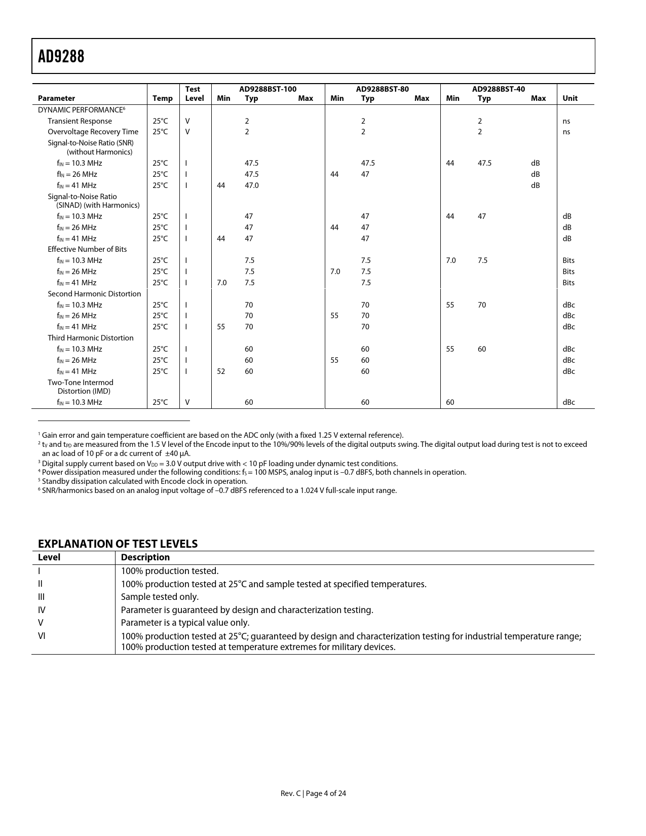 AD9288. Test. AD9288BST-100. AD9288BST-80. AD9288BST-40. Parameter. Temp. Level. Min. Typ. Max. Unit