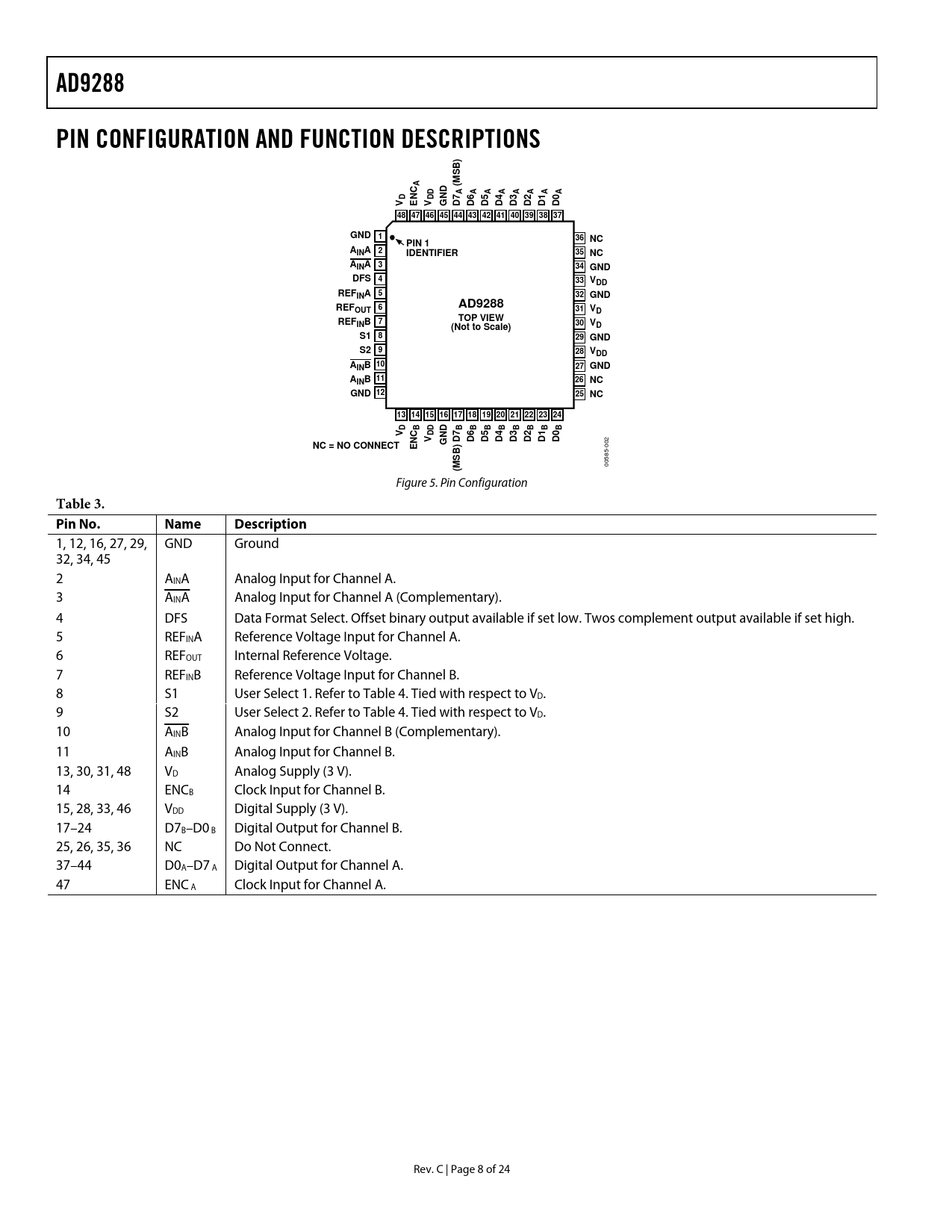 AD9288 PIN CONFIGURATION AND FUNCTION DESCRIPTIONS ) B A (MS C A A A A A A A A D DD V EN V GND D7 D6 D5 D4 D3 D2 D1 D0 48 47 46 45 44 43 42 41 40 39 38 37 GND 1 36 NC PIN 1 AINA 2 IDENTIFIER 35 NC AINA 3 34 GND DFS 4 33 VDD REFINA 5 32 GND REF AD9288 OUT 6 31 VD REF TOP VIEW INB 7 30 VD (Not to Scale) S1 8 29 GND S2 9 28 VDD AINB 10 27 GND A 11 INB 26 NC GND 12 25 NC 13 14 15 16 17 18 19 20 21 22 23 24 D B B B B B B B B B V C DDV GND D6 D5 D4 D3 D2 D1 D0 NC = NO CONNECT EN ) D7 B