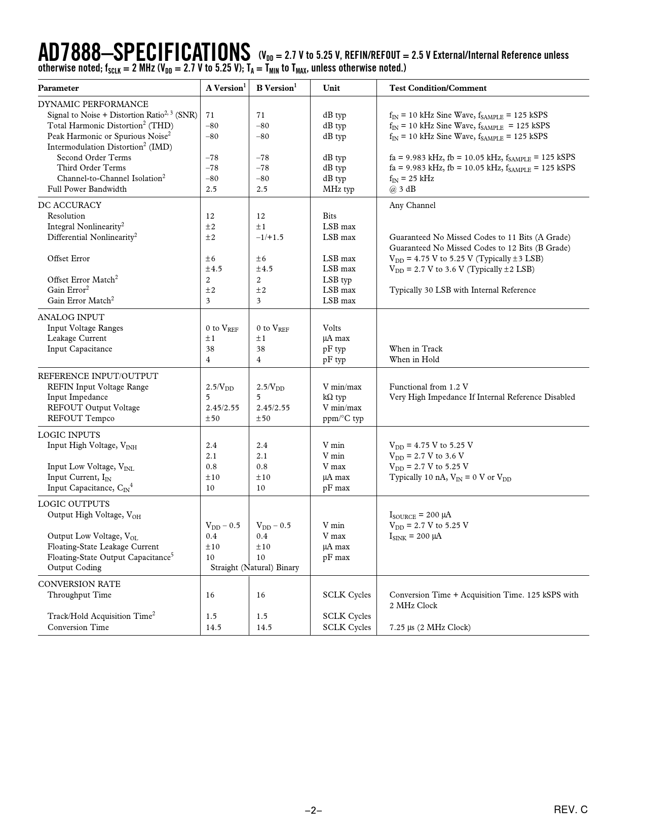 AD7888–SPECIFICATIONS (VDD = 2.7 V to 5.25 V, REFIN/REFOUT = 2.5 V External/Internal Reference unless