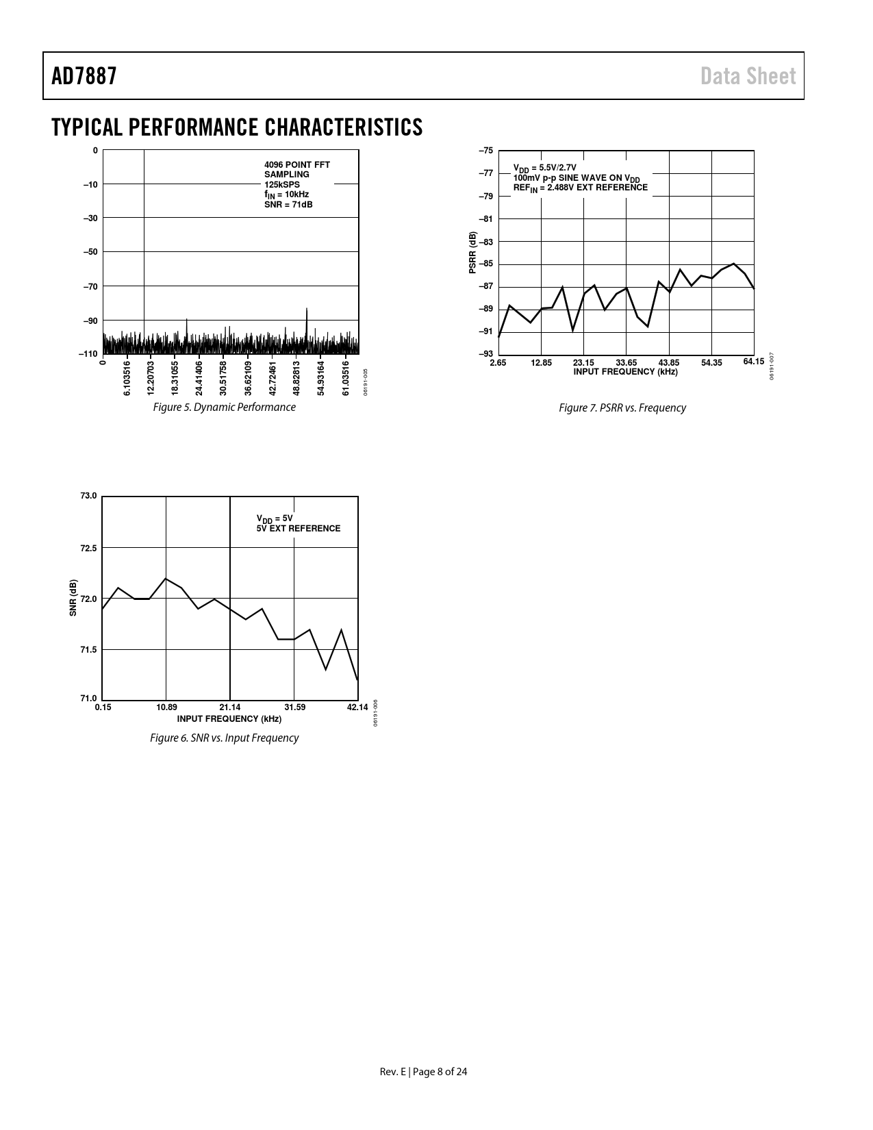 06191- Figure 6. SNR vs. Input Frequency Rev. E | Page 8 of 24 Document Outline Features Applications Functional Block Diagram General Description Product Highlights Table of Contents Revision History Specifications Timing Specifications6F Absolute Maximum Ratings ESD Caution Pin Configurations and Function Descriptions Typical Performance Characteristics Terminology Control Register Theory of Operation Circuit Information Converter Operation ADC Transfer Function Typical Connection Diagram Analog Input On-Chip Reference Power-Down Options Power-Up Times Power vs. Throughput Rate Modes of Operation Mode 1 (PM1 = 0, PM0 = 0) Mode 2 (PM1 = 0, PM0 = 1) Mode 3 (PM1 = 1, PM0 = 0) Mode 4 (PM1 = 1, PM0 = 1) Serial Interface Microprocessor Interfacing AD7887 to TMS320C5x AD7887 to ADSP-21xx AD7887 to DSP56xxx AD7887 to MC68HC11 AD7887 to 8051 AD7887 to PIC16C6x/PIC16C7x Application Hints Grounding and Layout Outline Dimensions Ordering Guide Automotive Products