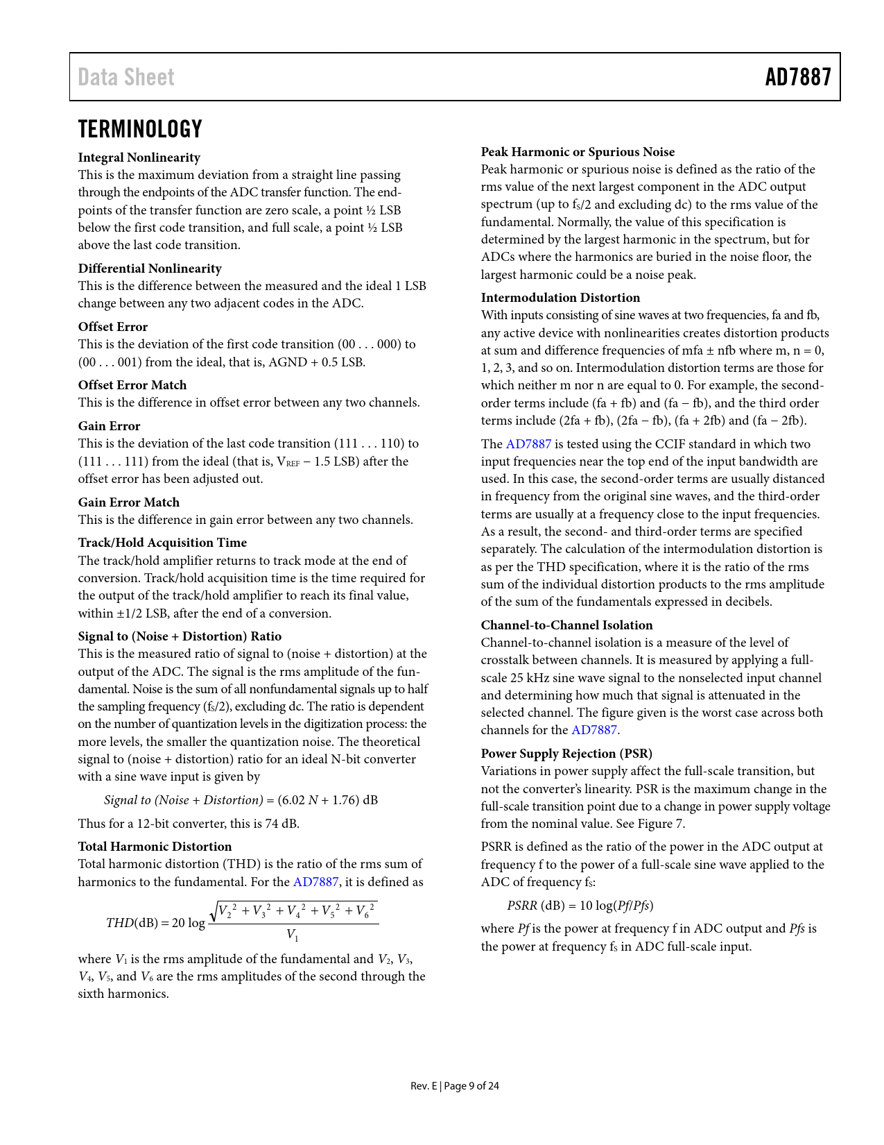 PSRR is defined as the ratio of the power in the ADC output at Total harmonic distortion (THD) is the ratio of the rms sum of frequency f to the power of a full-scale sine wave applied to the harmonics to the fundamental. For the AD7887, it is defined as ADC of frequency fS: 2 2 2 2 2 V + + + + PSRR (dB) = 10 log(Pf/Pfs) 2 V3 V4 V5 V6 THD ) dB ( = 20 log where Pf is the power at frequency f in ADC output and Pfs is 1 V the power at frequency fS in ADC ful -scale input. where V1 is the rms amplitude of the fundamental and V2, V3, V4, V5, and V6 are the rms amplitudes of the second through the sixth harmonics. Rev. E | Page 9 of 24 Document Outline Features Applications Functional Block Diagram General Description Product Highlights Table of Contents Revision History Specifications Timing Specifications6F Absolute Maximum Ratings ESD Caution Pin Configurations and Function Descriptions Typical Performance Characteristics Terminology Control Register Theory of Operation Circuit Information Converter Operation ADC Transfer Function Typical Connection Diagram Analog Input On-Chip Reference Power-Down Options Power-Up Times Power vs. Throughput Rate Modes of Operation Mode 1 (PM1 = 0, PM0 = 0) Mode 2 (PM1 = 0, PM0 = 1) Mode 3 (PM1 = 1, PM0 = 0) Mode 4 (PM1 = 1, PM0 = 1) Serial Interface Microprocessor Interfacing AD7887 to TMS320C5x AD7887 to ADSP-21xx AD7887 to DSP56xxx AD7887 to MC68HC11 AD7887 to 8051 AD7887 to PIC16C6x/PIC16C7x Application Hints Grounding and Layout Outline Dimensions Ordering Guide Automotive Products