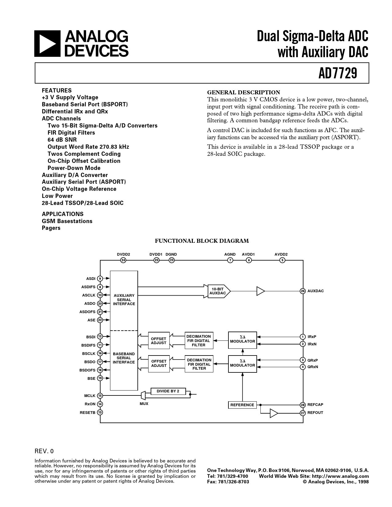 On-Chip Offset Calibration Power-Down Mode Auxiliary D/A Converter Auxiliary Serial Port (ASPORT) On-Chip Voltage Reference Low Power 28-Lead TSSOP/28-Lead SOIC APPLICATIONS GSM Basestations Pagers FUNCTIONAL BLOCK DIAGRAM DVDD2 DVDD1 DGND AGND AVDD1 AVDD2 ASDI ASDIFS 10-BIT AUXDAC AUXDAC ASCLK AUXILIARY SERIAL ASDO INTERFACE ASDOFS ASE BSDI DECIMATION