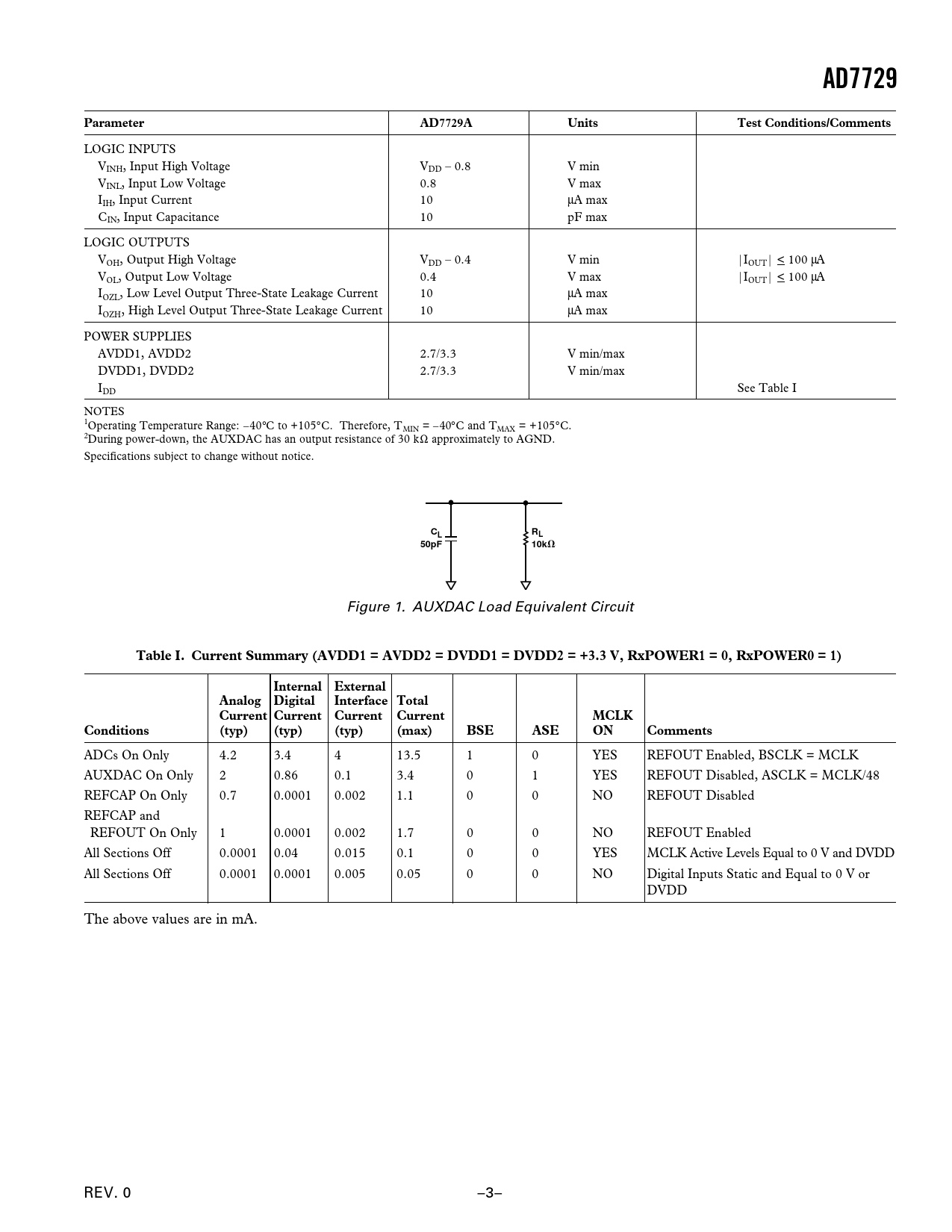LOGIC INPUTS VINH, Input High Voltage VDD – 0.8 V min VINL, Input Low Voltage 0.8 V max IIH, Input Current 10 µA max CIN, Input Capacitance 10 pF max LOGIC OUTPUTS VOH, Output High Voltage VDD – 0.4 V min |IOUT| < 100 µA VOL, Output Low Voltage 0.4 V max |IOUT| < 100 µA IOZL, Low Level Output Three-State Leakage Current 10 µA max IOZH, High Level Output Three-State Leakage Current 10 µA max POWER SUPPLIES AVDD1, AVDD2 2.7/3.3 V min/max DVDD1, DVDD2 2.7/3.3 V min/max IDD See Table I NOTES 1Operating Temperature Range: –40°C to +105°C. Therefore, TMIN = –40°C and TMAX = +105°C. 2During power-down, the AUXDAC has an output resistance of 30 kΩ approximately to AGND. Specifications subject to change without notice.