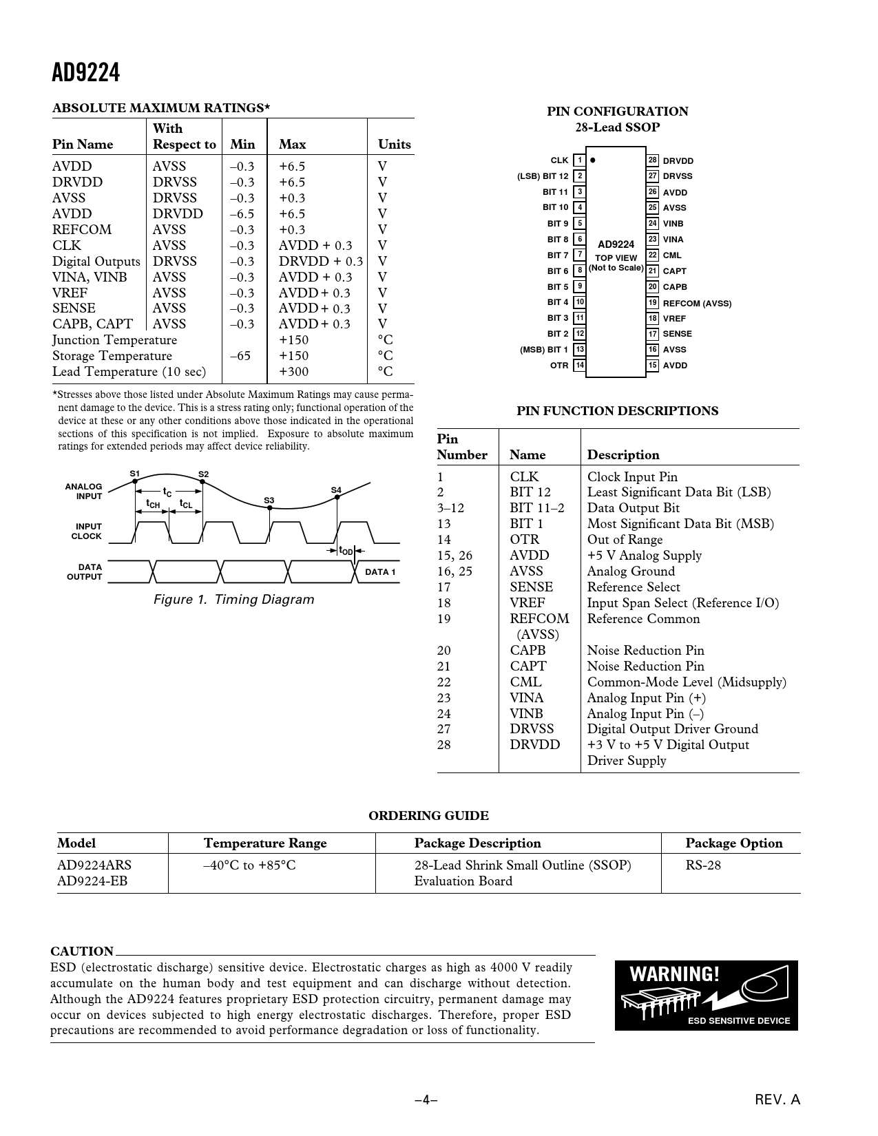 AD9224 ABSOLUTE MAXIMUM RATINGS* With Respect to Pin Name AVDD AVSS DRVDD DRVSS AVSS DRVSS AVDD DRVDD REFCOM AVSS CLK AVSS Digital Outputs DRVSS VINA, VINB AVSS VREF AVSS SENSE AVSS CAPB, CAPT AVSS Junction Temperature Storage Temperature Lead Temperature (10 sec) PIN CONFIGURATION 28-Lead SSOP Min Max Units –0.3 –0.3 –0.3 –6.5 –0.3 –0.3 –0.3 –0.3 –0.3 –0.3 –0.3 +6.5 +6.5 +0.3 +6.5 +0.3 AVDD + 0.3 DRVDD + 0.3 AVDD + 0.3 AVDD + 0.3 AVDD + 0.3 AVDD + 0.3 +150 +150 +300 V V V V V V V V V V V °C °C °C –65 *Stresses above those listed under Absolute Maximum Ratings may cause permanent damage to the device. This is a stress rating only; functional operation of the device at these or any other conditions above those indicated in the operational sections of this specification is not implied. Exposure to absolute maximum ratings for extended periods may affect device reliability. S1 ANALOG INPUT S2 S4 tC tCH tCL S3 INPUT CLOCK tOD DATA OUTPUT DATA 1 Figure 1. Timing Diagram CLK 1 28 DRVDD (LSB) BIT 12 2 27 DRVSS BIT 11 3 26 AVDD BIT 10 4 25 AVSS BIT 9 5 24 VINB BIT 8 6 23 VINA BIT 7 7 AD9224 BIT 6 TOP VIEW 22 CML 8 (Not to Scale) 21 CAPT BIT 5 9 20 CAPB BIT 4 10 19 REFCOM (AVSS) BIT 3 11 18 VREF BIT 2 12 17 SENSE (MSB) BIT 1 13 16 AVSS OTR 14 15 AVDD PIN FUNCTION DESCRIPTIONS Pin Number 1 2 3–12 13 14 15, 26 16, 25 17 18 19 20 21 22 23 24 27 28 Name Description CLK BIT 12 BIT 11–2 BIT 1 OTR AVDD AVSS SENSE VREF REFCOM (AVSS) CAPB CAPT CML VINA VINB DRVSS DRVDD Clock Input Pin Least Significant Data Bit (LSB) Data Output Bit Most Significant Data Bit (MSB) Out of Range +5 V Analog Supply Analog Ground Reference Select Input Span Select (Reference I/O) Reference Common Noise Reduction Pin Noise Reduction Pin Common-Mode Level (Midsupply) Analog Input Pin (+) Analog Input Pin (–) Digital Output Driver Ground +3 V to +5 V Digital Output Driver Supply ORDERING GUIDE Model Temperature Range Package Description Package Option AD9224ARS AD9224-EB –40°C to +85°C 28-Lead Shrink Small Outline (SSOP) Evaluation Board RS-28 CAUTION ESD (electrostatic discharge) sensitive device. Electrostatic charges as high as 4000 V readily accumulate on the human body and test equipment and can discharge without detection. Although the AD9224 features proprietary ESD protection circuitry, permanent damage may occur on devices subjected to high energy electrostatic discharges. Therefore, proper ESD precautions are recommended to avoid performance degradation or loss of functionality. –4– WARNING! ESD SENSITIVE DEVICE REV. A