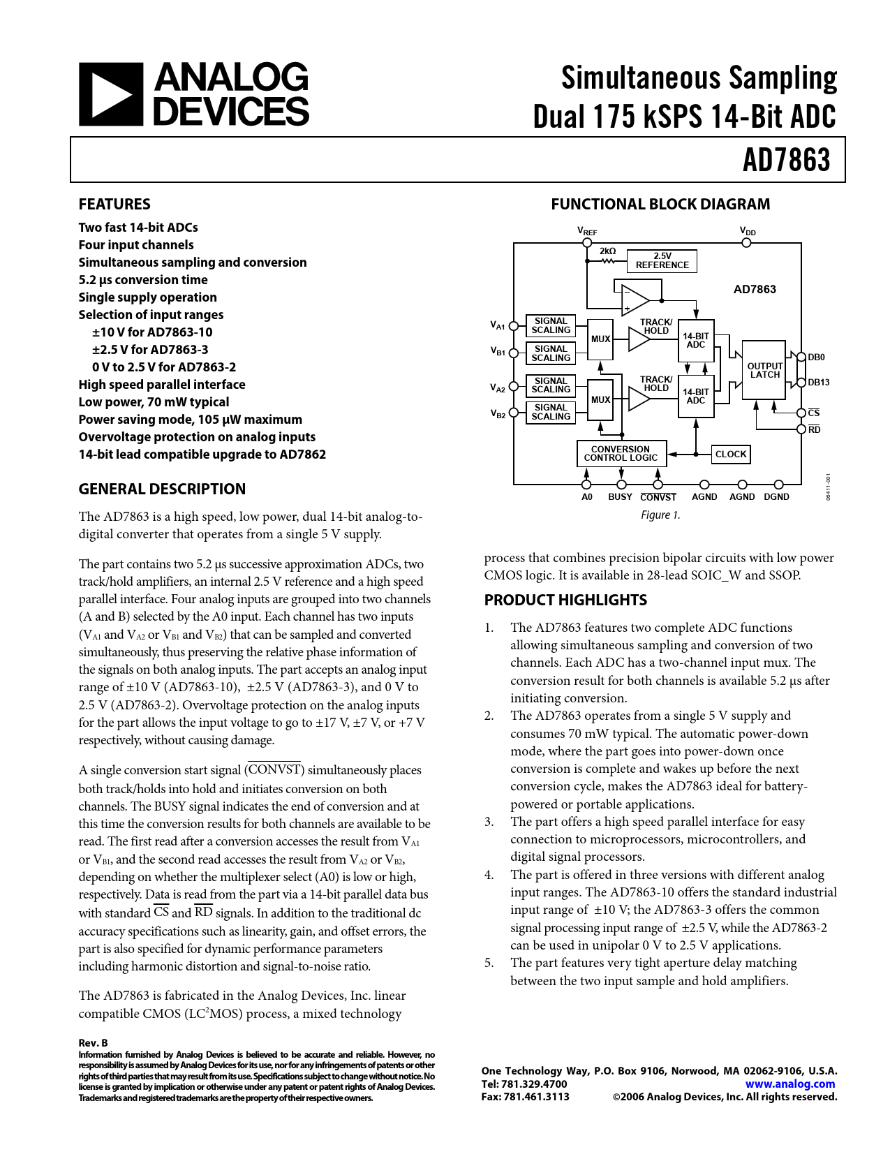 | Páginas / Página | 25 / 1 — Simultaneous Sampling. Dual 175 kSPS 14-Bit ADC. AD7863. FEATURES. … |