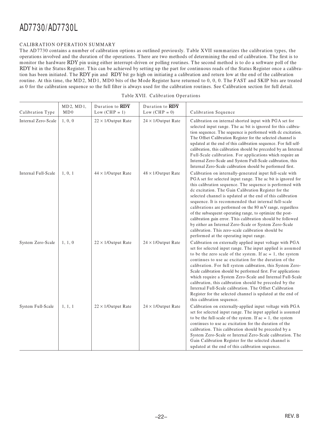 AD7730/AD7730L. CALIBRATION OPERATION SUMMARY. Table XVII. Calibration Operations. MD2, MD1,. Duration to RDY. Calibration Type