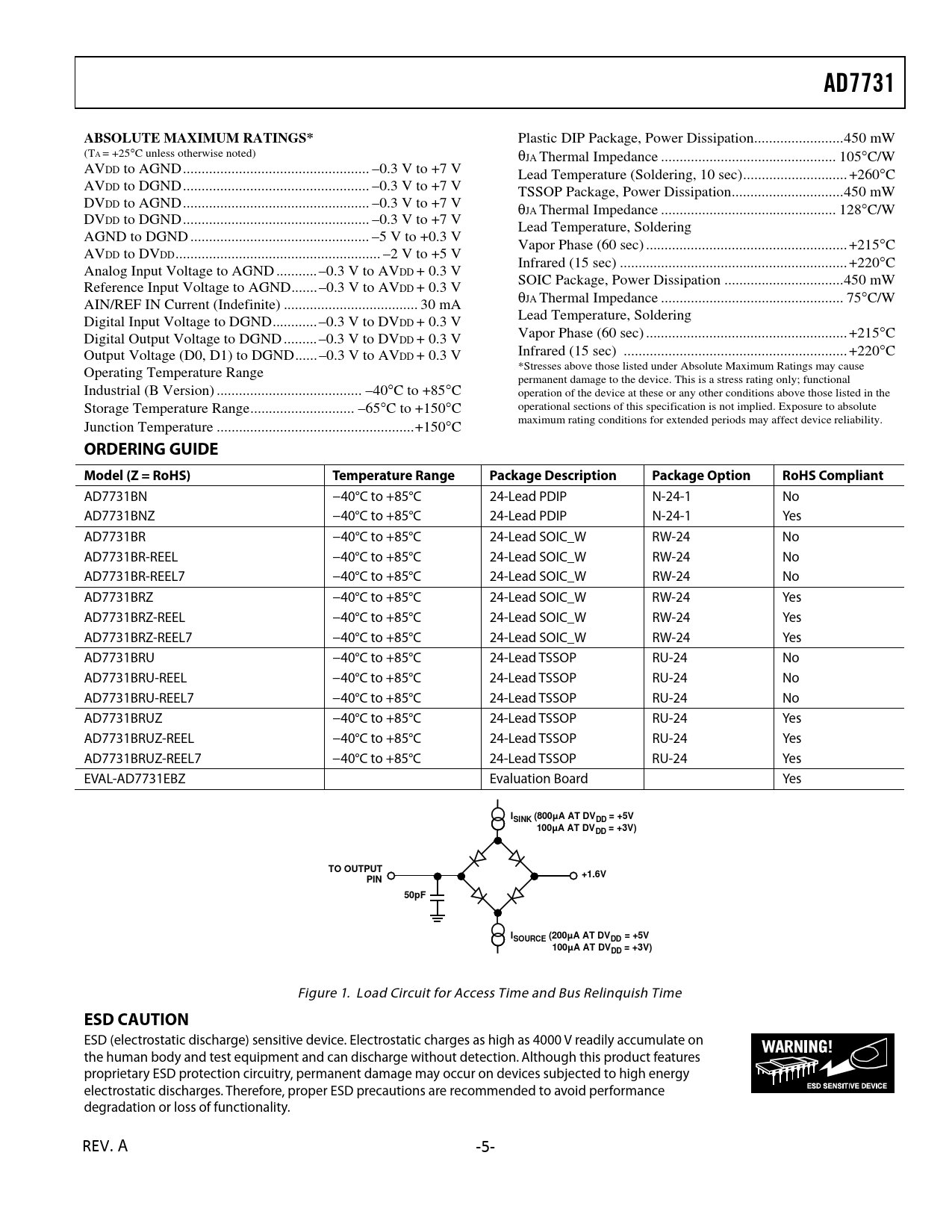 ABSOLUTE MAXIMUM RATINGS* Plastic DIP Package, Power Dissipation .. 450 mW (TA = +25°C unless otherwise noted) θJA Thermal Impedance ... 105°C/W AVDD to AGND .. –0.3 V to +7 V Lead Temperature (Soldering, 10 sec) .. +260°C AVDD to DGND .. –0.3 V to +7 V TSSOP Package, Power Dissipation .. 450 mW DVDD to AGND .. –0.3 V to +7 V θJA Thermal Impedance ... 128°C/W DVDD to DGND .. –0.3 V to +7 V Lead Temperature, Soldering AGND to DGND .. –5 V to +0.3 V Vapor Phase (60 sec) .. +215°C AVDD to DVDD ... –2 V to +5 V Infrared (15 sec) ... +220°C Analog Input Voltage to AGND ... –0.3 V to AVDD + 0.3 V SOIC Package, Power Dissipation .. 450 mW Reference Input Voltage to AGND ... –0.3 V to AVDD + 0.3 V θ AIN/REF IN Current (Indefinite) .. 30 mA JA Thermal Impedance ... 75°C/W Lead Temperature, Soldering Digital Input Voltage to DGND .. –0.3 V to DVDD + 0.3 V Digital Output Voltage to DGND ... –0.3 V to DV Vapor Phase (60 sec) .. +215°C DD + 0.3 V Output Voltage (D0, D1) to DGND .. –0.3 V to AV Infrared (15 sec) .. +220°C DD + 0.3 V *Stresses above those listed under Absolute Maximum Ratings may cause Operating Temperature Range permanent damage to the device. This is a stress rating only; functional Industrial (B Version) ... –40°C to +85°C operation of the device at these or any other conditions above those listed in the Storage Temperature Range .. –65°C to +150°C operational sections of this specification is not implied. Exposure to absolute maximum rating conditions for extended periods may affect device reliability. Junction Temperature ... +150°C ORDERING GUIDEModel (Z = RoHS)Temperature RangePackage DescriptionPackage OptionRoHS Compliant AD7731BN −40°C to +85°C 24-Lead PDIP N-24-1 No AD7731BNZ −40°C to +85°C 24-Lead PDIP N-24-1 Yes AD7731BR −40°C to +85°C 24-Lead SOIC_W RW-24 No AD7731BR-REEL −40°C to +85°C 24-Lead SOIC_W RW-24 No AD7731BR-REEL7 −40°C to +85°C 24-Lead SOIC_W RW-24 No AD7731BRZ −40°C to +85°C 24-Lead SOIC_W RW-24 Yes AD7731BRZ-REEL −40°C to +85°C 24-Lead SOIC_W RW-24 Yes AD7731BRZ-REEL7 −40°C to +85°C 24-Lead SOIC_W RW-24 Yes AD7731BRU −40°C to +85°C 24-Lead TSSOP RU-24 No AD7731BRU-REEL −40°C to +85°C 24-Lead TSSOP RU-24 No AD7731BRU-REEL7 −40°C to +85°C 24-Lead TSSOP RU-24 No AD7731BRUZ −40°C to +85°C 24-Lead TSSOP RU-24 Yes AD7731BRUZ-REEL −40°C to +85°C 24-Lead TSSOP RU-24 Yes AD7731BRUZ-REEL7 −40°C to +85°C 24-Lead TSSOP RU-24 Yes EVAL-AD7731EBZ Evaluation Board Yes ISINK (800µA AT DVDD = +5V100µA AT DVDD = +3V)TO OUTPUT+1.6VPIN50pFISOURCE (200µA AT DVDD = +5V100µA AT DVDD = +3V) Figure 1. Load Circuit for Access Time and Bus Relinquish Time ESD CAUTION ESD (electrostatic discharge) sensitive device. Electrostatic charges as high as 4000 V readily accumulate on the human body and test equipment and can discharge without detection. Although this product features proprietary ESD protection circuitry, permanent damage may occur on devices subjected to high energy electrostatic discharges. Therefore, proper ESD precautions are recommended to avoid performance degradation or loss of functionality. REV. REV. A A ‐5‐ Document Outline FEATURES APPLICATIONS GENERAL DESCRIPTION FUNCTIONAL BLOCK DIAGRAM AD7731-SPECIFICATIONS TIMING CHARACTERISTICS ABSOLUTE MAXIMUM RATINGS Ordering Guide ESD Caution PIN CONFIGURATION Pin Function Descriptions TERMINOLOGY OUTPUT NOISE AND RESOLUTION SPECIFICATION Output Noise (CHP = 0, SKIP= 1) Output Noise (CHP = 1, SKIP = 0) ON-CHIP REGISTERS Communications Register (RS2-RS0 = 0, 0, 0) Status Register (RS2-RS0 = 0, 0, 0); Power-On/Reset Status: CX Hex Data Register (RS2-RS0 = 0, 0, 1); Power On/Reset Status: 000000 Hex Mode Register (RS2-RS0 = 0, 1, 0); Power-On/Reset Status: 0174 Hex Filter Register (RS2-RS0 = 0, 1, 1); Power-On/Reset Status: 2002 Hex Offset Calibration Register (RS2-RS0 = 1, 0, 1) Gain Calibration Register (RS2-RS0 = 1, 1, 0) Test Register (RS2-RS0 = 1, 1, 1); Power On/Reset Status: 000000 Hex READING FROM AND WRITING TO THE ON-CHIP REGISTERS CALIBRATION OPERATION SUMMARY CIRCUIT DESCRIPTION ANALOG INPUT Analog Input Channels Buffered Inputs Analog Input Ranges Programmable Gain Amplifier Bipolar/Unipolar Inputs Burnout Currents REFERENCE INPUT Reference Detect SIGMA-DELTA MODULATOR DIGITAL FILTERING Filter Architecture First State Filter/SKIP Mode Enabled (SKIP =1) Nonchop Mode (SKIP =1, CHP = 0) Chop Mode (SKIP = 1, CHP =1) Second Stage Filter Normal FIR Operation (SKIP = 0) Chop Mode (SKIP = 0, CHP =1) Nonchop Mode (SKIP = 1, CHP = 0) FASTStep Mode (SKIP = 0, FAST = 1) CALIBRATION Internal Zero-Scale Calibration Internal Full-Scale Calibration System Zero-Scale Calibration System Full-Scale Calibration Span and Offset Limits Power-Up and Calibration Drift Considerations USING THE AD7731 Clocking and Oscillator Circuit System Synchronization Single-Shot Conversions Reset Input Standby Mode Digital Outputs POWER SUPPLIES Grounding and Layout Evaluting the AD7731 Performance SERIAL INTERFACE Write Operation Read Operation CONFIGURING THE AD7731 MICROCOMPUTER/MICROPROCESSOR INTERFACING AD7731 to 68HC11 Interface AD7731 to 8051 Interface AD7731 to ADSP-2103/ADSP-2105 Interface APPLICATIONS Data Acquisition Programmable Logic Controllers Pressure Measurement Temperature Measurement Bipolar Input Signals PAGE INDEX TABLE INDEX OUTLINE DIMENSIONS