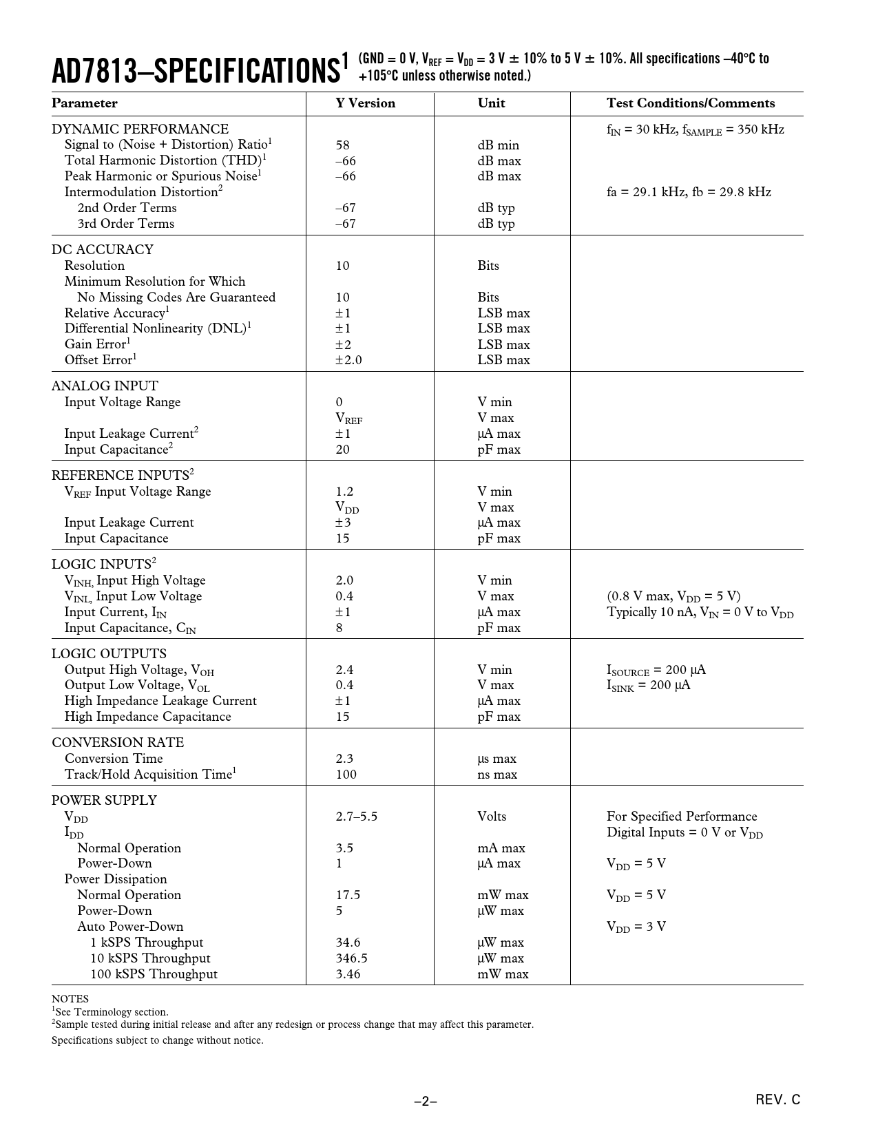 AD7813–SPECIFICATIONS1 (GND = 0 V, VREF = VDD = 3 V 10% to 5 V 10%. All specifications –40 C to +105 C unless otherwise noted.) Parameter Y Version Unit Test Conditions/Comments