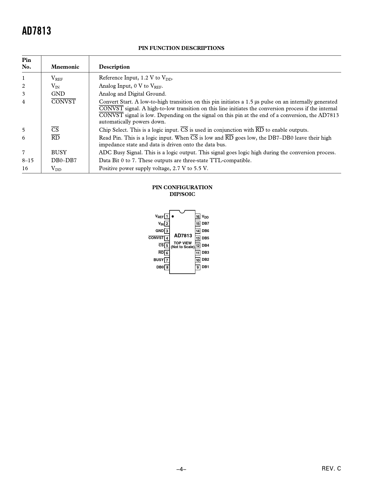 AD7813. PIN FUNCTION DESCRIPTIONS. Pin No. Mnemonic. Description. PIN CONFIGURATION. DIP/SOIC. REF. 16 VDD. 15 DB7. GND 3. 14 DB6. CONVST 4