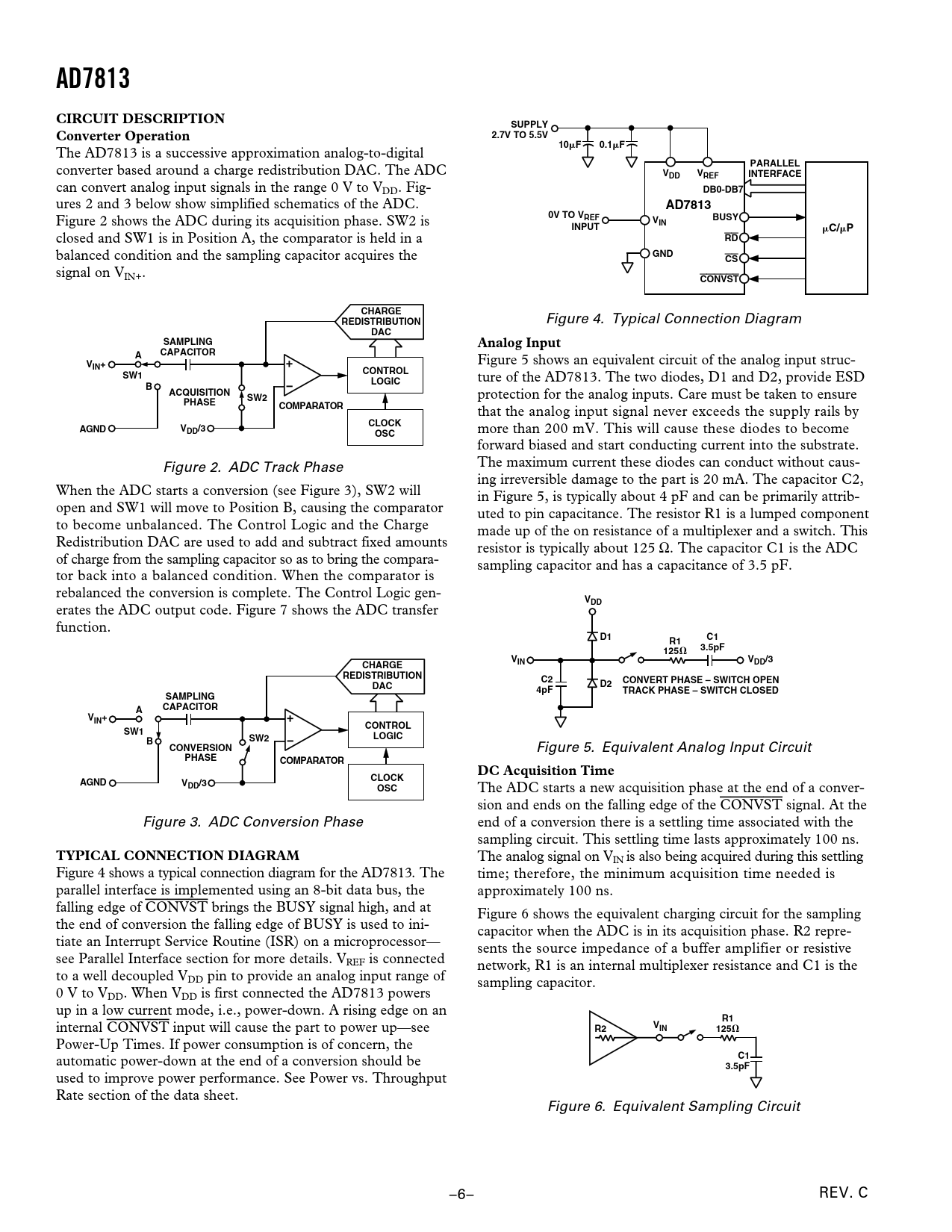AD7813CIRCUIT DESCRIPTIONSUPPLYConverter Operation2.7V TO 5.5V10F0.1F The AD7813 is a successive approximation analog-to-digital PARALLEL converter based around a charge redistribution DAC. The ADC VDDVREFINTERFACE can convert analog input signals in the range 0 V to VDD. Fig- DB0-DB7 ures 2 and 3 below show simplified schematics of the ADC. AD7813 Figure 2 shows the ADC during its acquisition phase. SW2 is 0V TO VREFBUSYVININPUTC/P closed and SW1 is in Position A, the comparator is held in a RD balanced condition and the sampling capacitor acquires the GNDCS signal on VIN+. CONVSTCHARGEREDISTRIBUTION Figure 4. Typical Connection Diagram DACSAMPLINGAnalog InputCAPACITORAV Figure 5 shows an equivalent circuit of the analog input struc- IN+CONTROLSW1LOGIC ture of the AD7813. The two diodes, D1 and D2, provide ESD BACQUISITIONSW2 protection for the analog inputs. Care must be taken to ensure PHASECOMPARATOR that the analog input signal never exceeds the supply rails by CLOCKAGNDVDD/3 more than 200 mV. This will cause these diodes to become OSC forward biased and start conducting current into the substrate. Figure 2. ADC Track Phase The maximum current these diodes can conduct without caus- ing irreversible damage to the part is 20 mA. The capacitor C2, When the ADC starts a conversion (see Figure 3), SW2 will in Figure 5, is typically about 4 pF and can be primarily attrib- open and SW1 will move to Position B, causing the comparator uted to pin capacitance. The resistor R1 is a lumped component to become unbalanced. The Control Logic and the Charge made up of the on resistance of a multiplexer and a switch. This Redistribution DAC are used to add and subtract fixed amounts resistor is typically about 125 Ω. The capacitor C1 is the ADC of charge from the sampling capacitor so as to bring the compara- sampling capacitor and has a capacitance of 3.5 pF. tor back into a balanced condition. When the comparator is rebalanced the conversion is complete. The Control Logic gen- VDD erates the ADC output code. Figure 7 shows the ADC transfer function. D1R1C11253.5pFVVCHARGEINDD/3REDISTRIBUTIONC2CONVERT PHASE – SWITCH OPENDACD24pFTRACK PHASE – SWITCH CLOSEDSAMPLINGCAPACITORAVIN+CONTROLSW1LOGICSW2BCONVERSION Figure 5. Equivalent Analog Input Circuit PHASECOMPARATORDC Acquisition TimeCLOCKAGNDVDD/3OSC The ADC starts a new acquisition phase at the end of a conver- sion and ends on the falling edge of the CONVST signal. At the Figure 3. ADC Conversion Phase end of a conversion there is a settling time associated with the sampling circuit. This settling time lasts approximately 100 ns. TYPICAL CONNECTION DIAGRAM The analog signal on VIN is also being acquired during this settling Figure 4 shows a typical connection diagram for the AD7813. The time; therefore, the minimum acquisition time needed is parallel interface is implemented using an 8-bit data bus, the approximately 100 ns. falling edge of CONVST brings the BUSY signal high, and at Figure 6 shows the equivalent charging circuit for the sampling the end of conversion the falling edge of BUSY is used to ini- capacitor when the ADC is in its acquisition phase. R2 repre- tiate an Interrupt Service Routine (ISR) on a microprocessor— sents the source impedance of a buffer amplifier or resistive see Parallel Interface section for more details. VREF is connected network, R1 is an internal multiplexer resistance and C1 is the to a well decoupled VDD pin to provide an analog input range of sampling capacitor. 0 V to VDD. When VDD is first connected the AD7813 powers up in a low current mode, i.e., power-down. A rising edge on an R1 internal CONVST input will cause the part to power up—see VR2IN125 Power-Up Times. If power consumption is of concern, the automatic power-down at the end of a conversion should be C13.5pF used to improve power performance. See Power vs. Throughput Rate section of the data sheet. Figure 6. Equivalent Sampling Circuit –6– REV. C