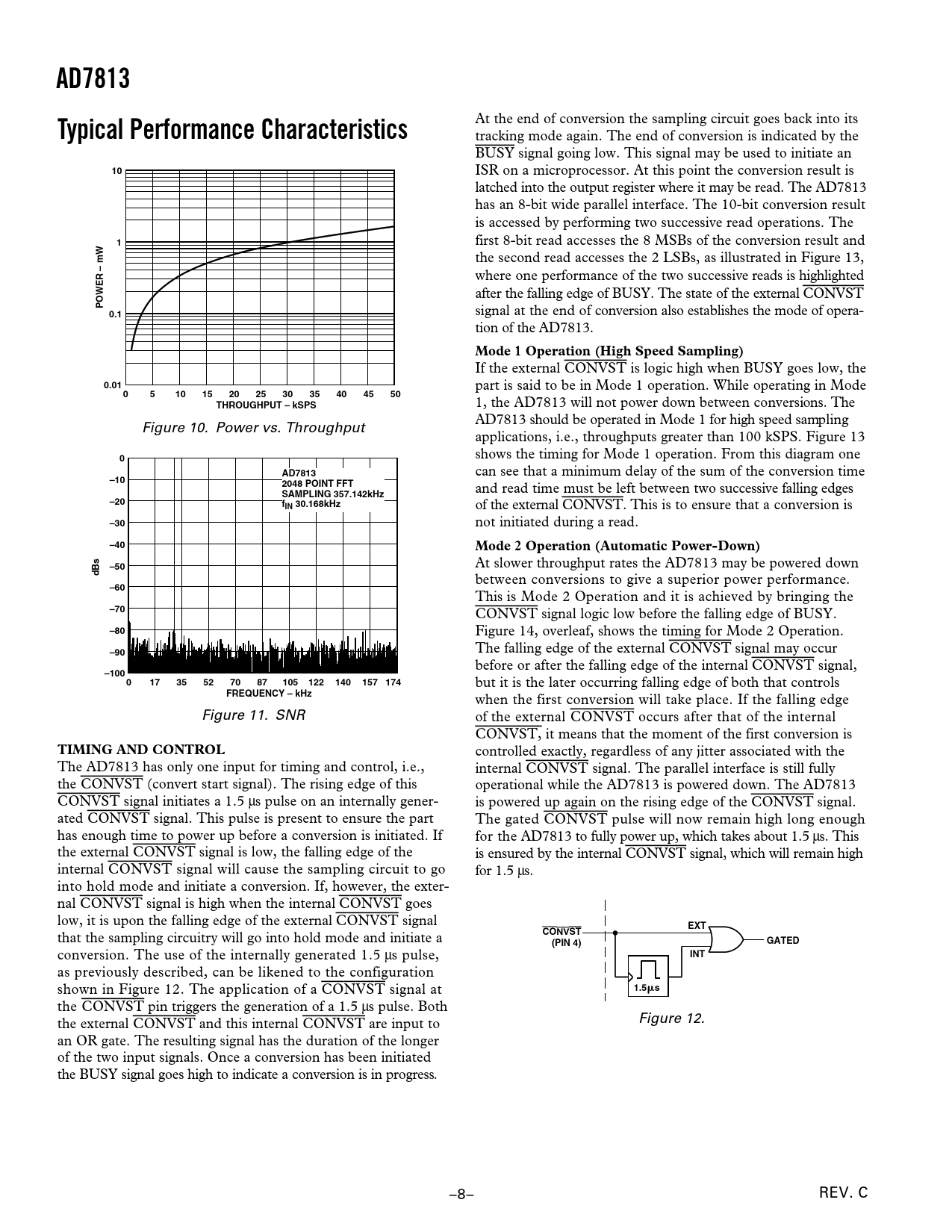 1, the AD7813 will not power down between conversions. The AD7813 should be operated in Mode 1 for high speed sampling Figure 10. Power vs. Throughput applications, i.e., throughputs greater than 100 kSPS. Figure 13 shows the timing for Mode 1 operation. From this diagram one