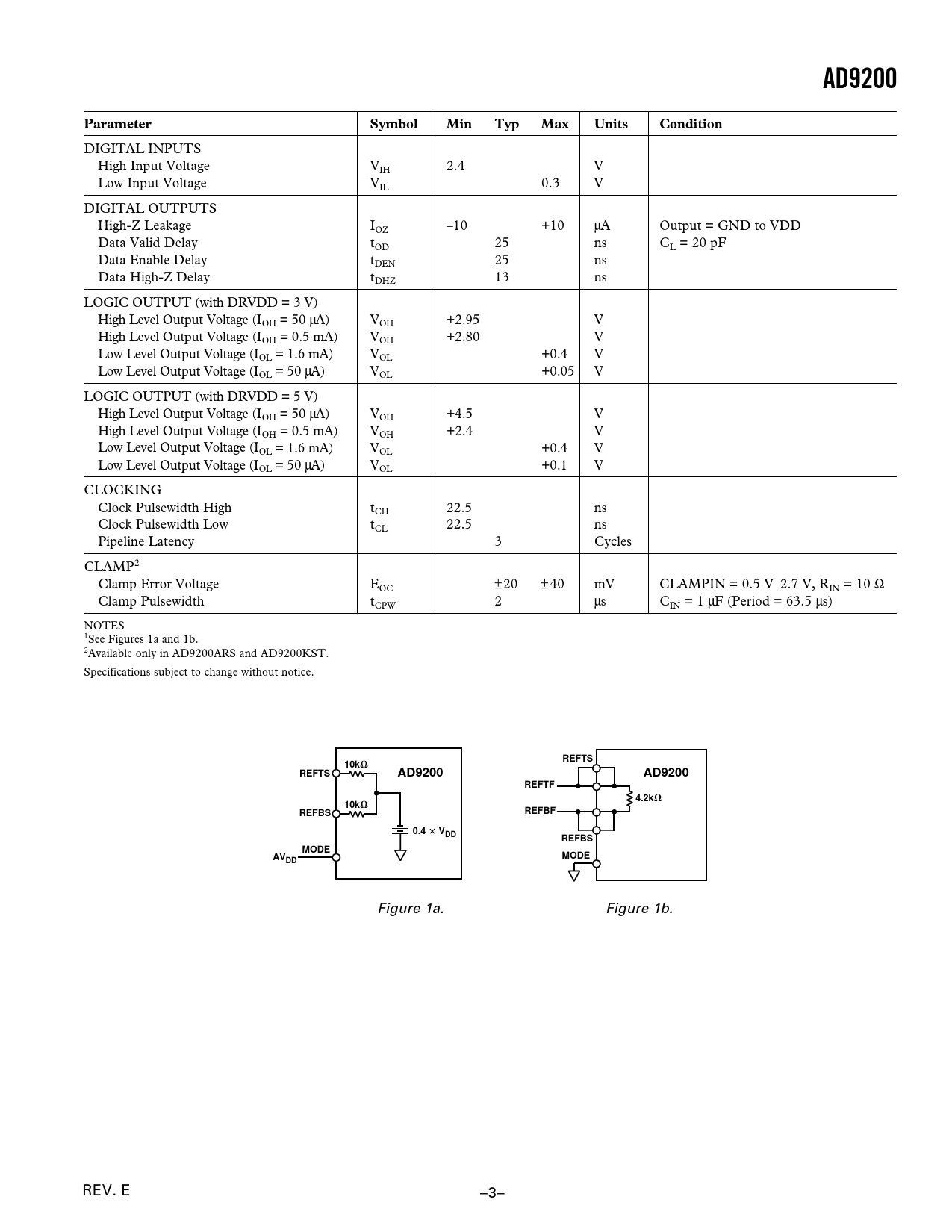 DIGITAL INPUTS High Input Voltage VIH 2.4 V Low Input Voltage VIL 0.3 V DIGITAL OUTPUTS High-Z Leakage IOZ –10 +10 µA Output = GND to VDD Data Valid Delay tOD 25 ns CL = 20 pF Data Enable Delay tDEN 25 ns Data High-Z Delay tDHZ 13 ns LOGIC OUTPUT (with DRVDD = 3 V) High Level Output Voltage (IOH = 50 µA) VOH +2.95 V High Level Output Voltage (IOH = 0.5 mA) VOH +2.80 V Low Level Output Voltage (IOL = 1.6 mA) VOL +0.4 V Low Level Output Voltage (IOL = 50 µA) VOL +0.05 V LOGIC OUTPUT (with DRVDD = 5 V) High Level Output Voltage (IOH = 50 µA) VOH +4.5 V High Level Output Voltage (IOH = 0.5 mA) VOH +2.4 V Low Level Output Voltage (IOL = 1.6 mA) VOL +0.4 V Low Level Output Voltage (IOL = 50 µA) VOL +0.1 V CLOCKING Clock Pulsewidth High tCH 22.5 ns Clock Pulsewidth Low tCL 22.5 ns Pipeline Latency 3 Cycles CLAMP2 Clamp Error Voltage E ± OC 20 ±40 mV CLAMPIN = 0.5 V–2.7 V, RIN = 10 Ω Clamp Pulsewidth tCPW 2 µs CIN = 1 µF (Period = 63.5 µs) NOTES 1See Figures 1a and 1b. 2Available only in AD9200ARS and AD9200KST. Specifications subject to change without notice.